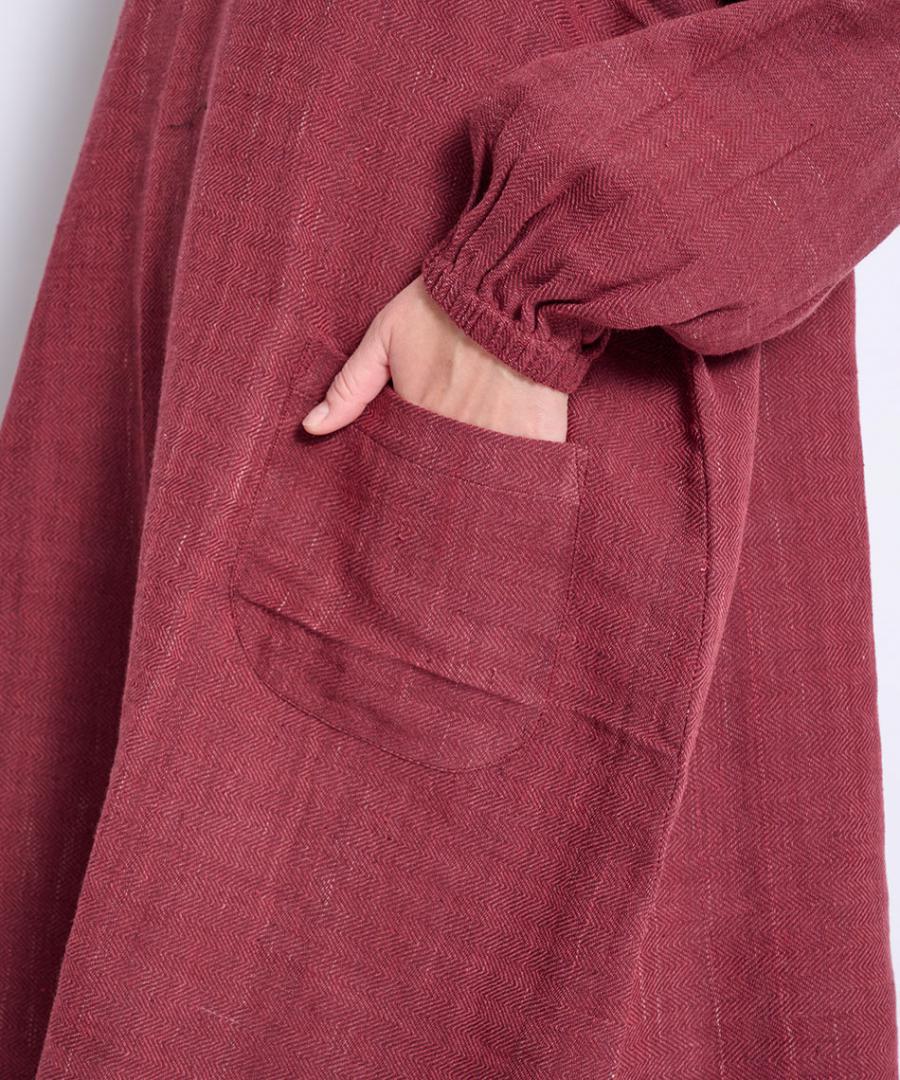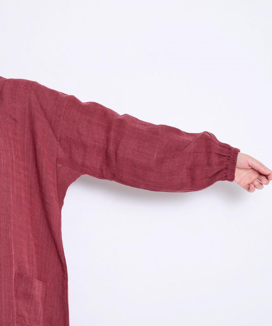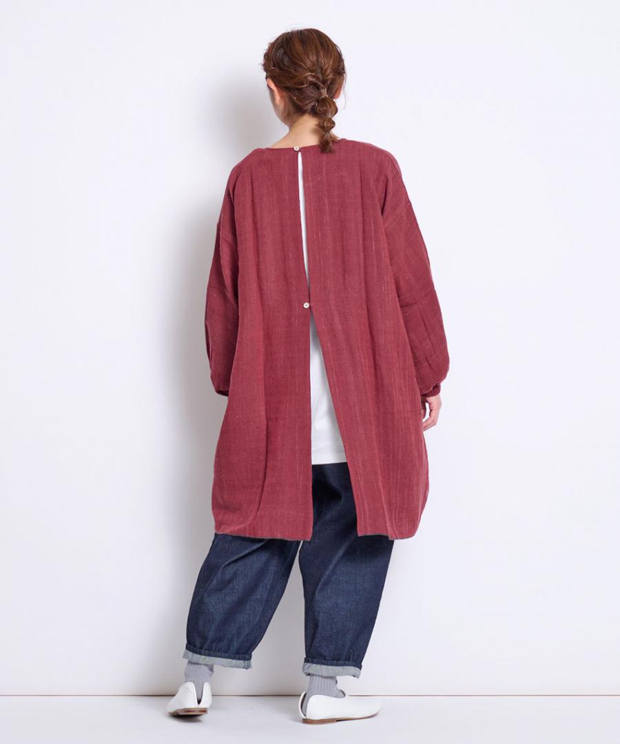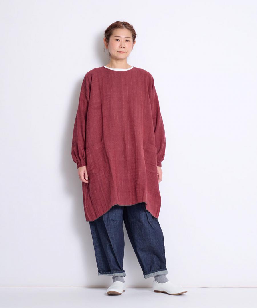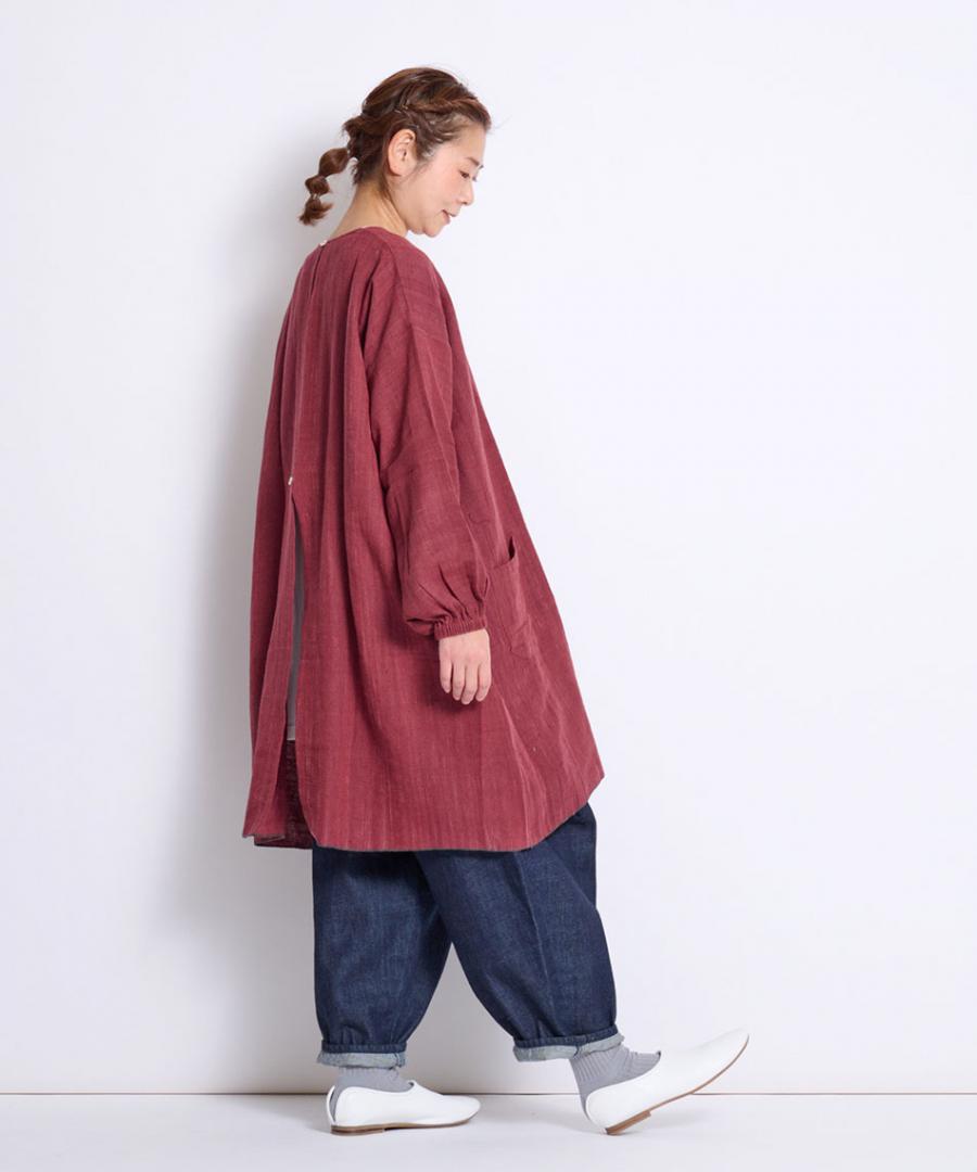 ゆったりとした身幅と着やすい着丈で、幅広い体型の方にも着ていただけ、動きやすい着心地にもこだわりました。ポケット付きで、手首まわりはゴム入り、着脱のしやすさも含めお仕事着や部屋着に。