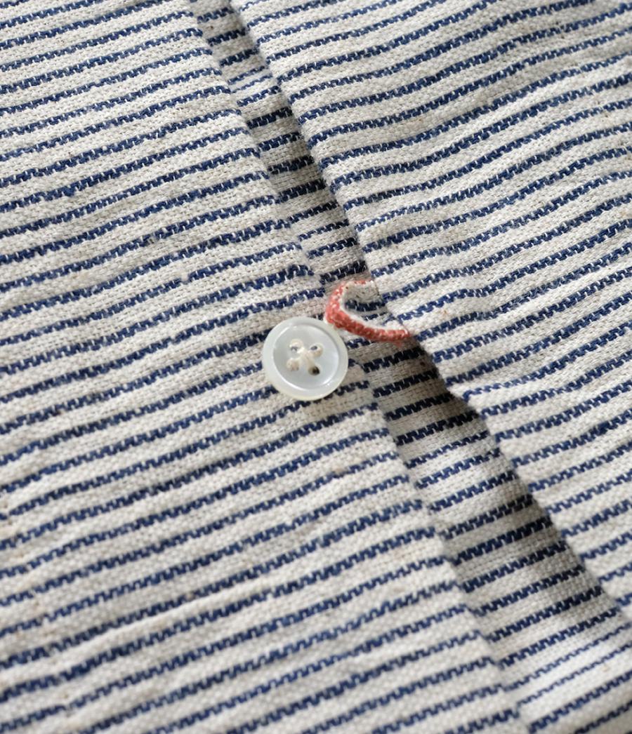 脇の縫製に三角マチを用い、あえて小さめにした貝ボタンやループのボタンホール