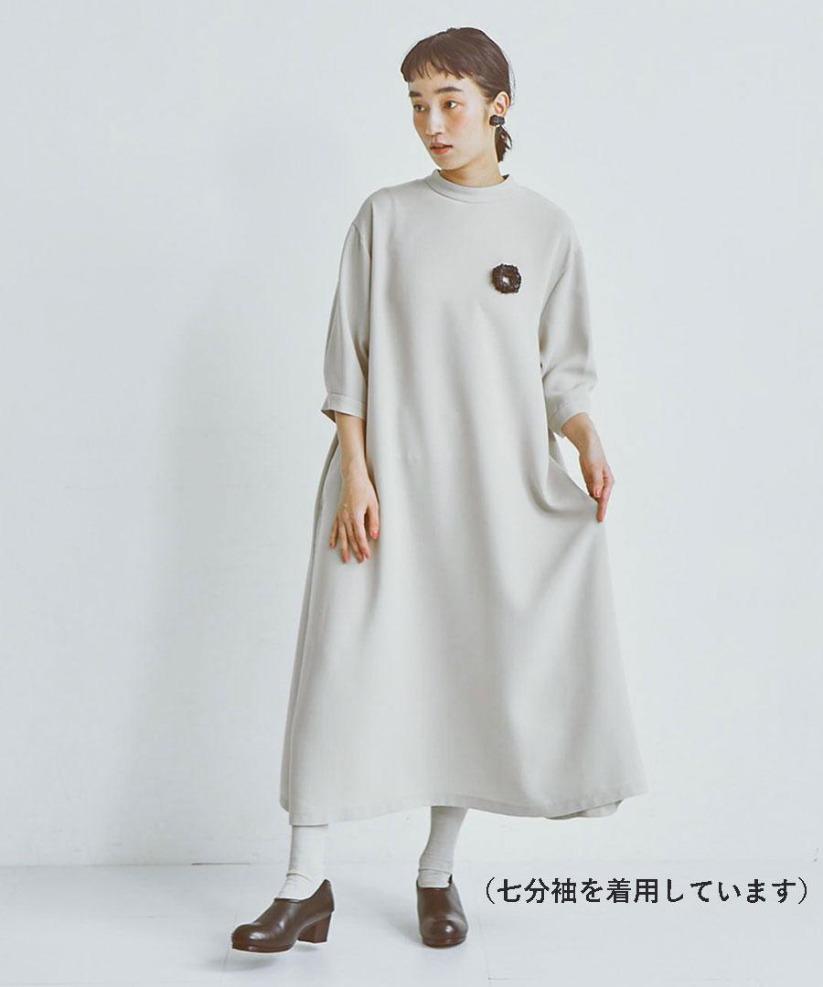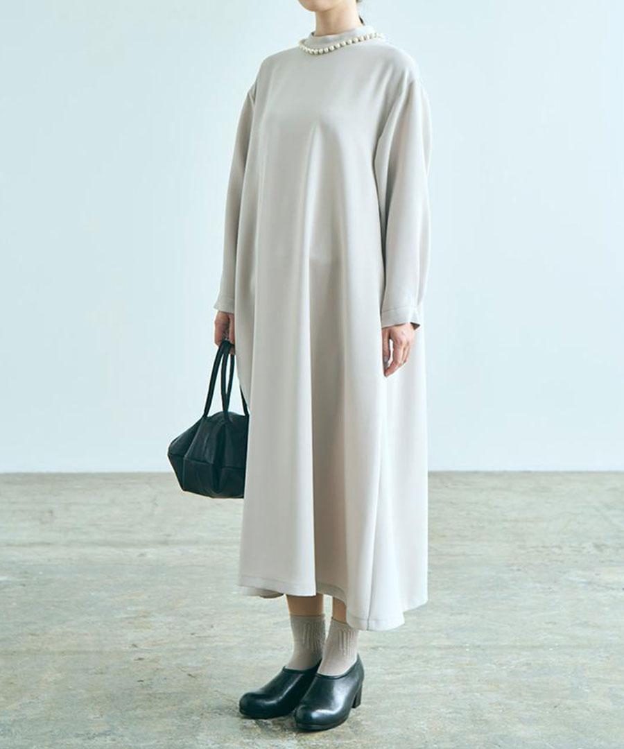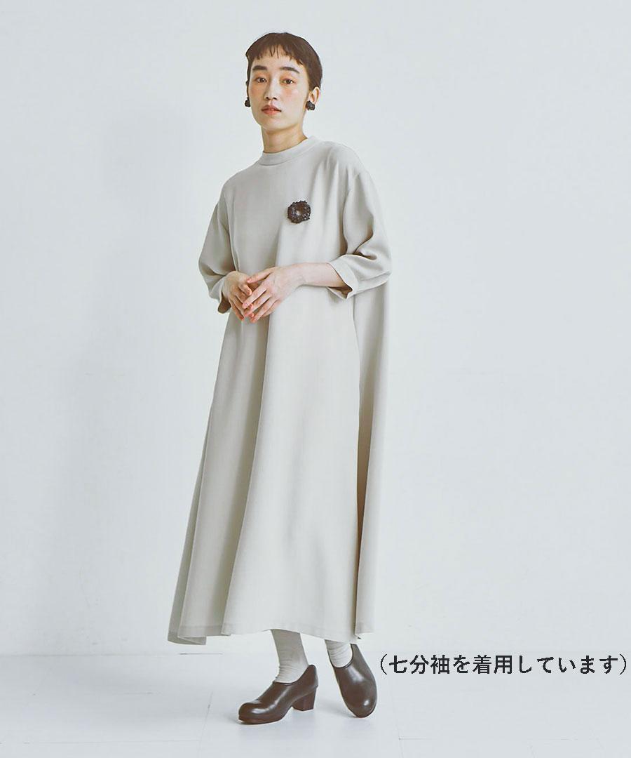 トリアセテート特有のドレープ感にパウダリー感とふくらみを兼ね備えた、上品な質感のワンピース。