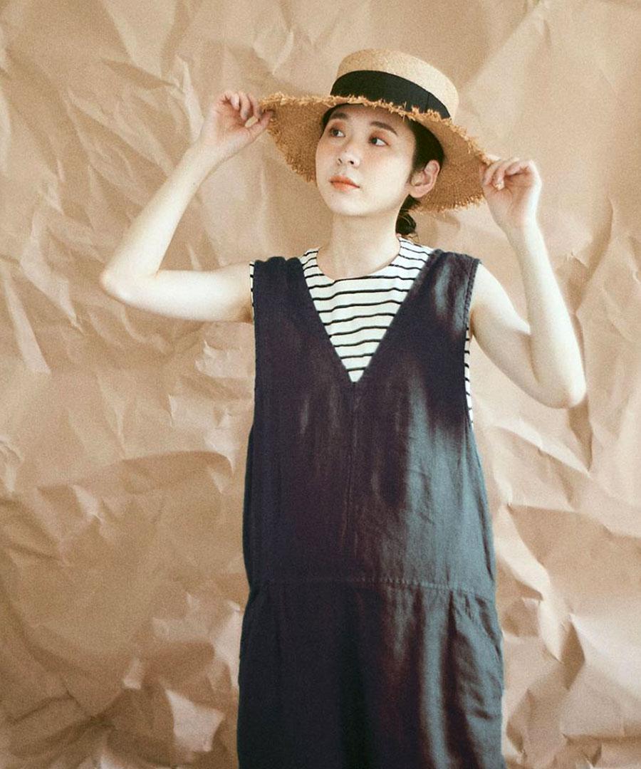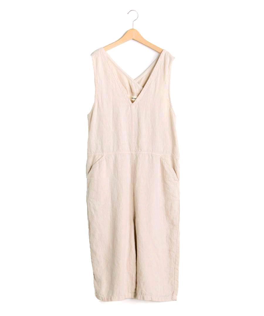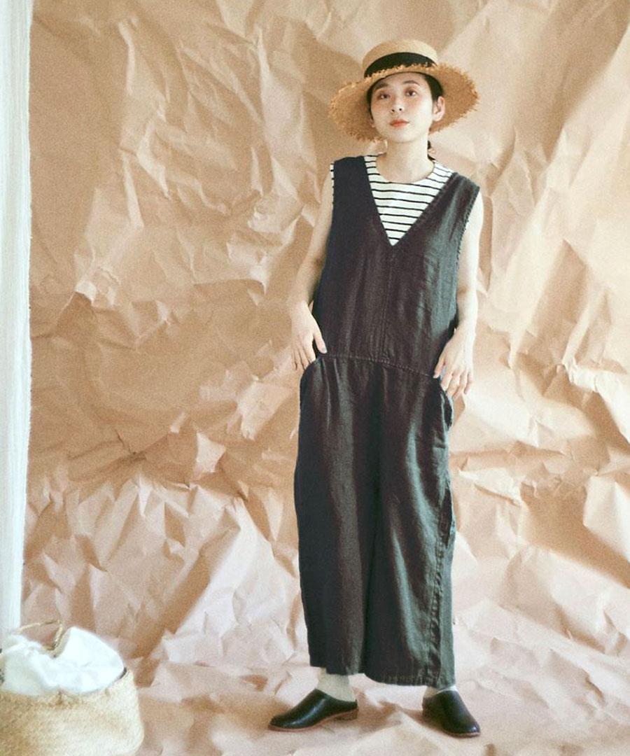 ゆったりとしたシルエットで深めのVネックが特徴的な「大人のサロペット」。