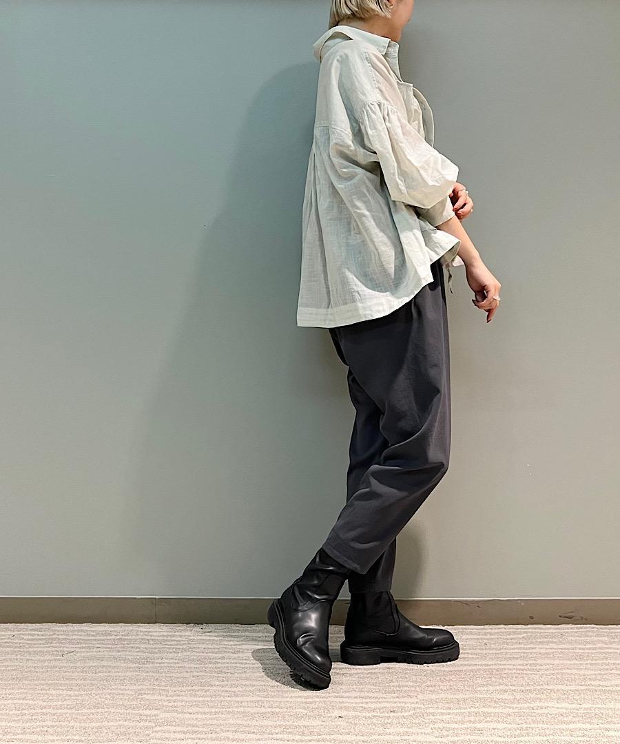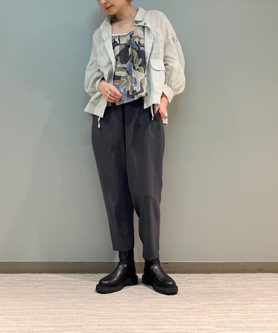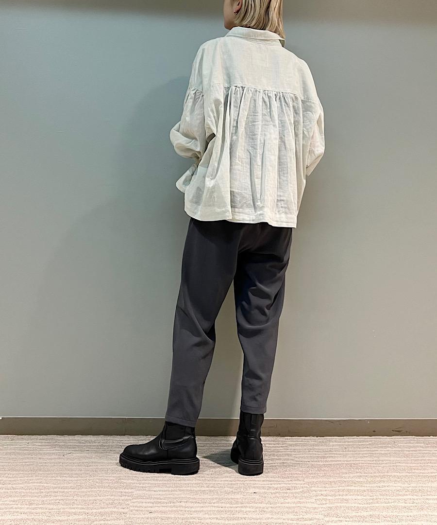身幅がゆったりとしたルーズなシルエットですが、裾に入った紐で裾幅の調節が可能です。