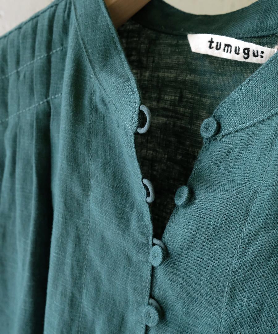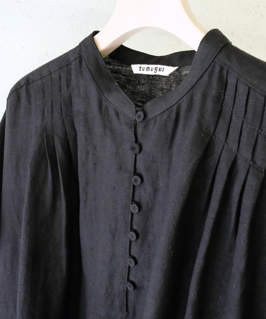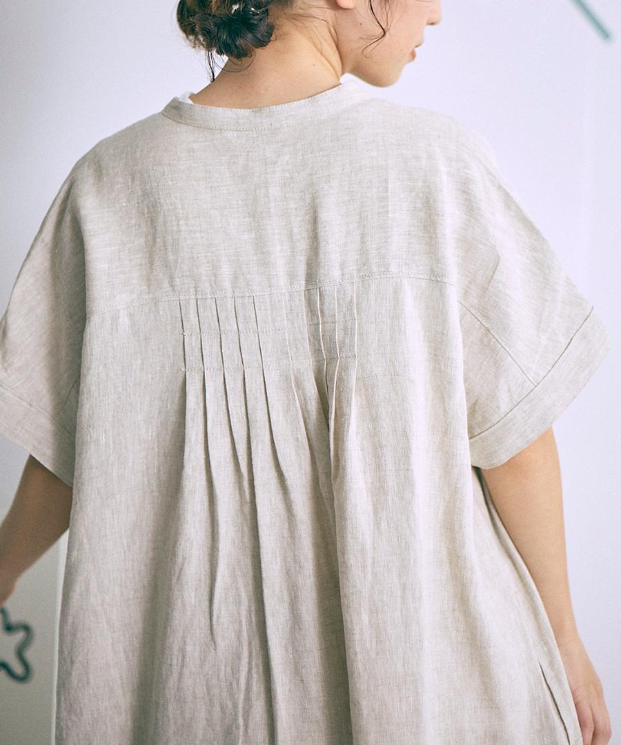 襟元はスッキリとしたスタンドカラーに、後ろにタックを入れることで、裾に向かってふんわりと広がるシルエット。