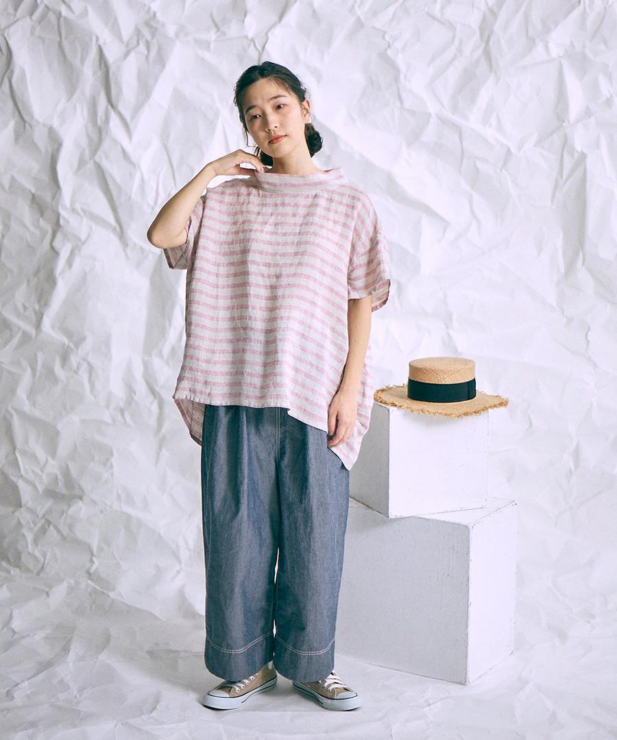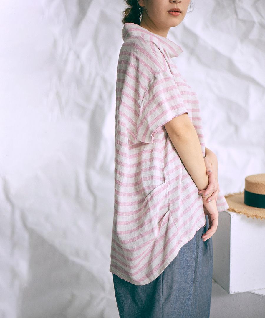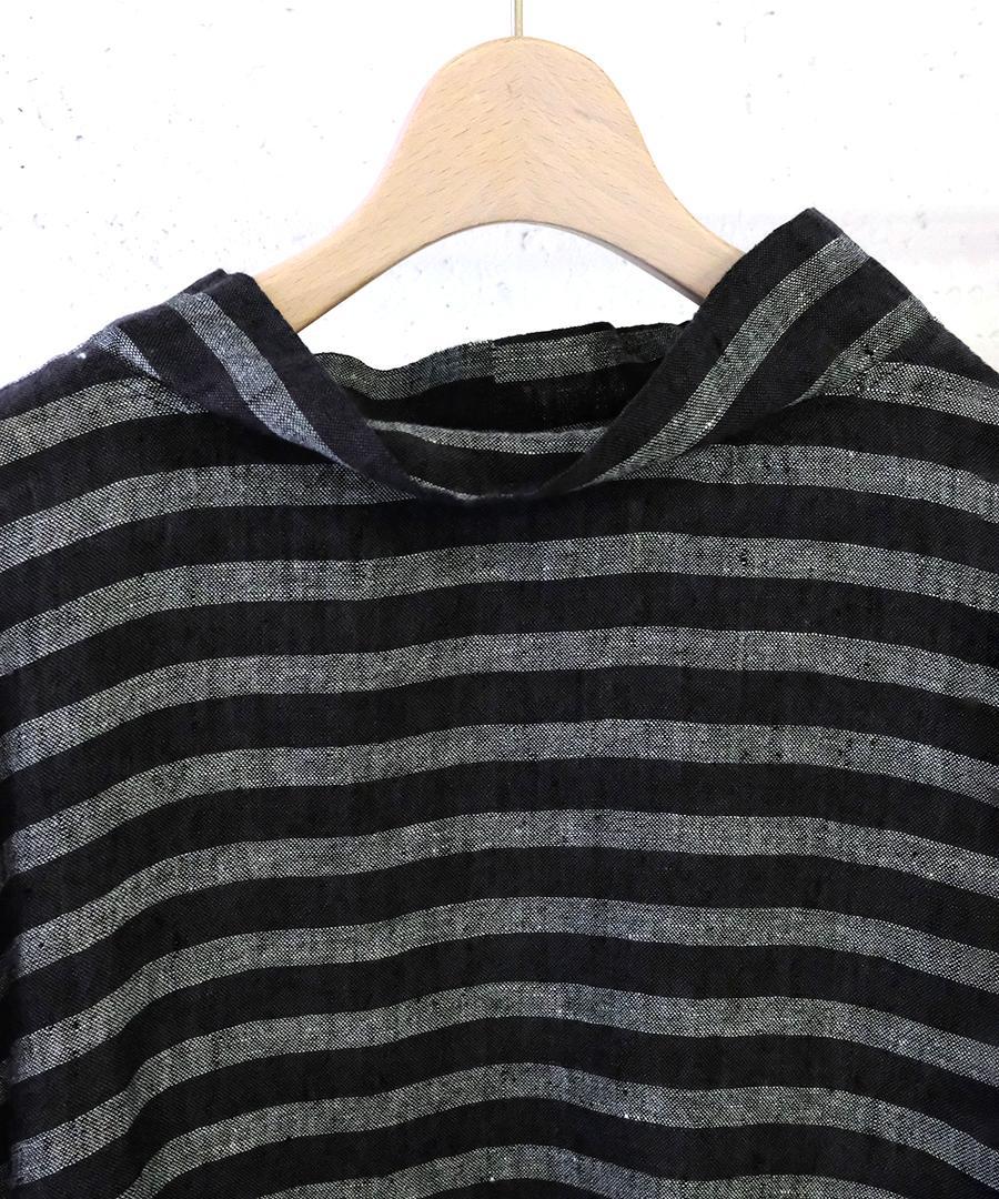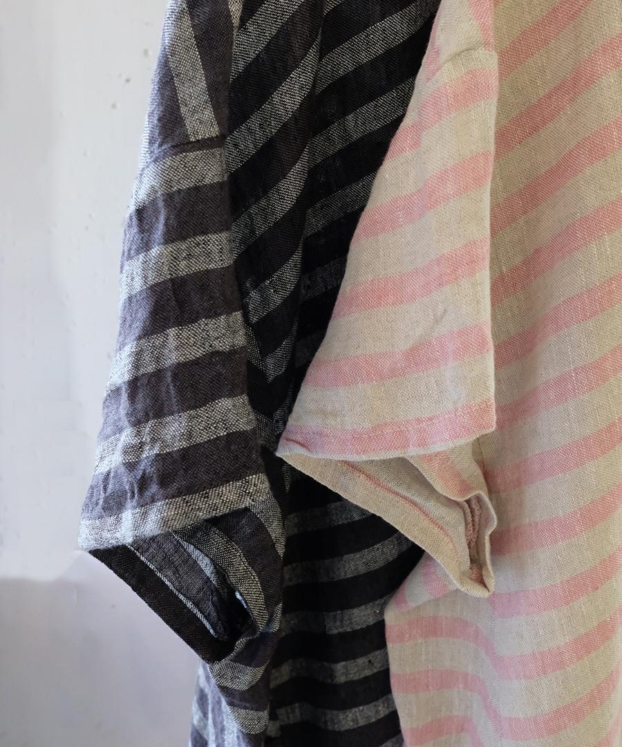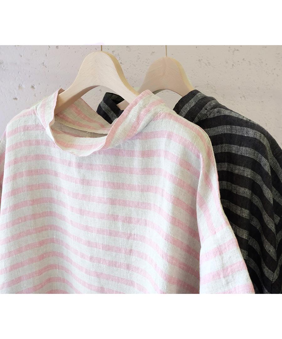 落ち着いた色合いのボーダー柄がナチュラルな雰囲気たっぷりのリネンプルオーバー。
