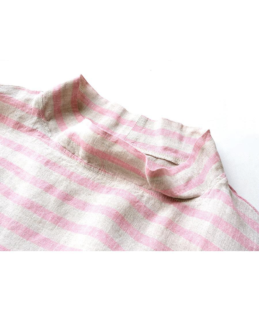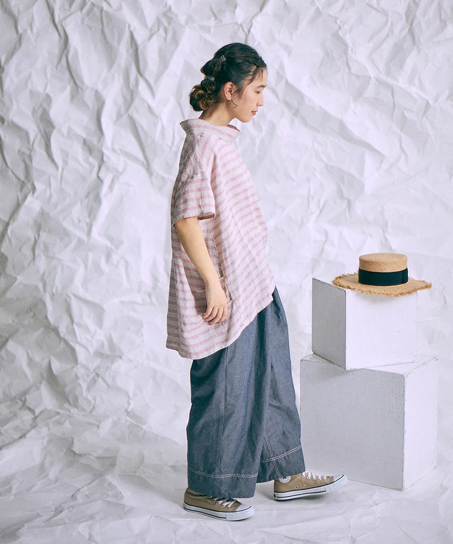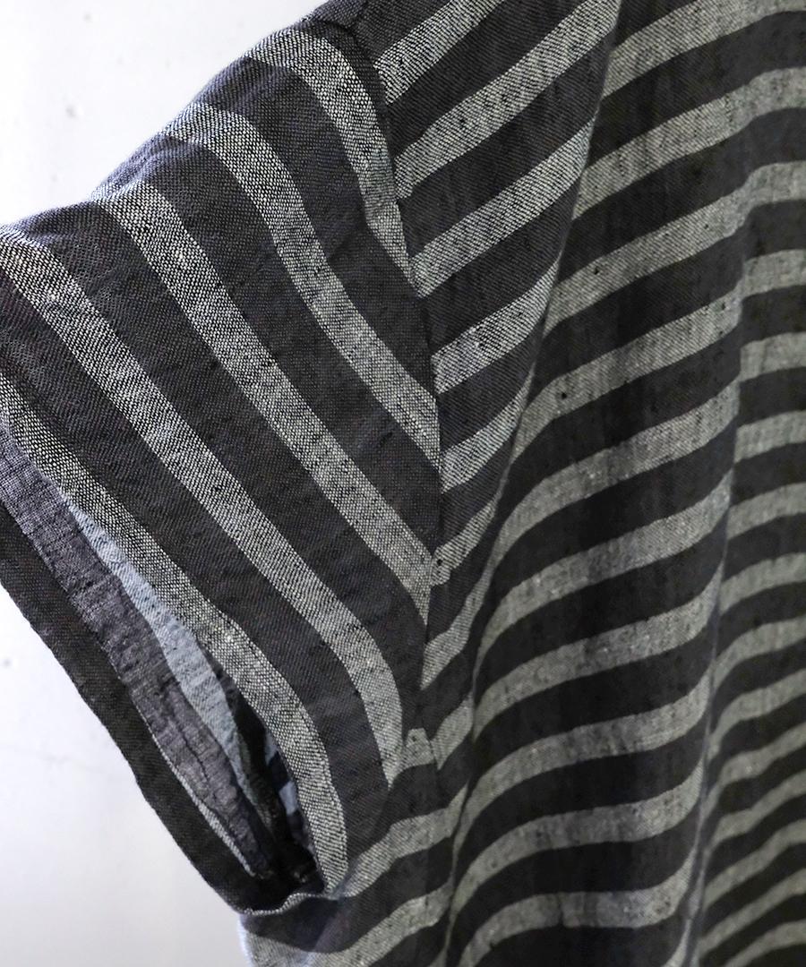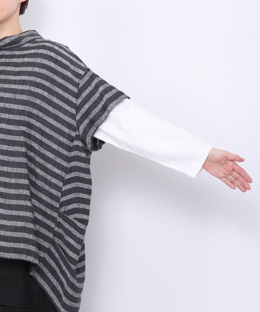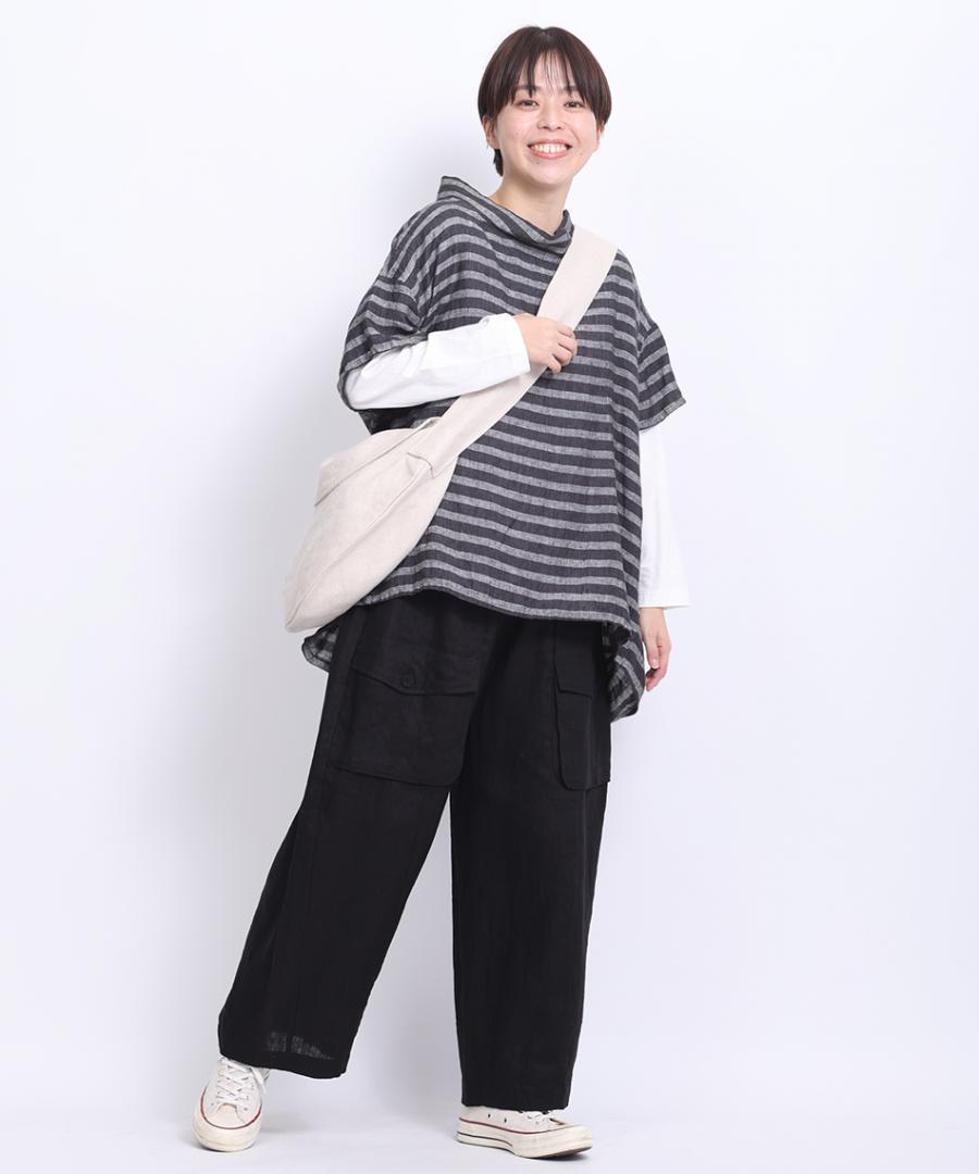 落ち着いた色合いのボーダー柄がナチュラルな雰囲気たっぷりのリネンプルオーバー。