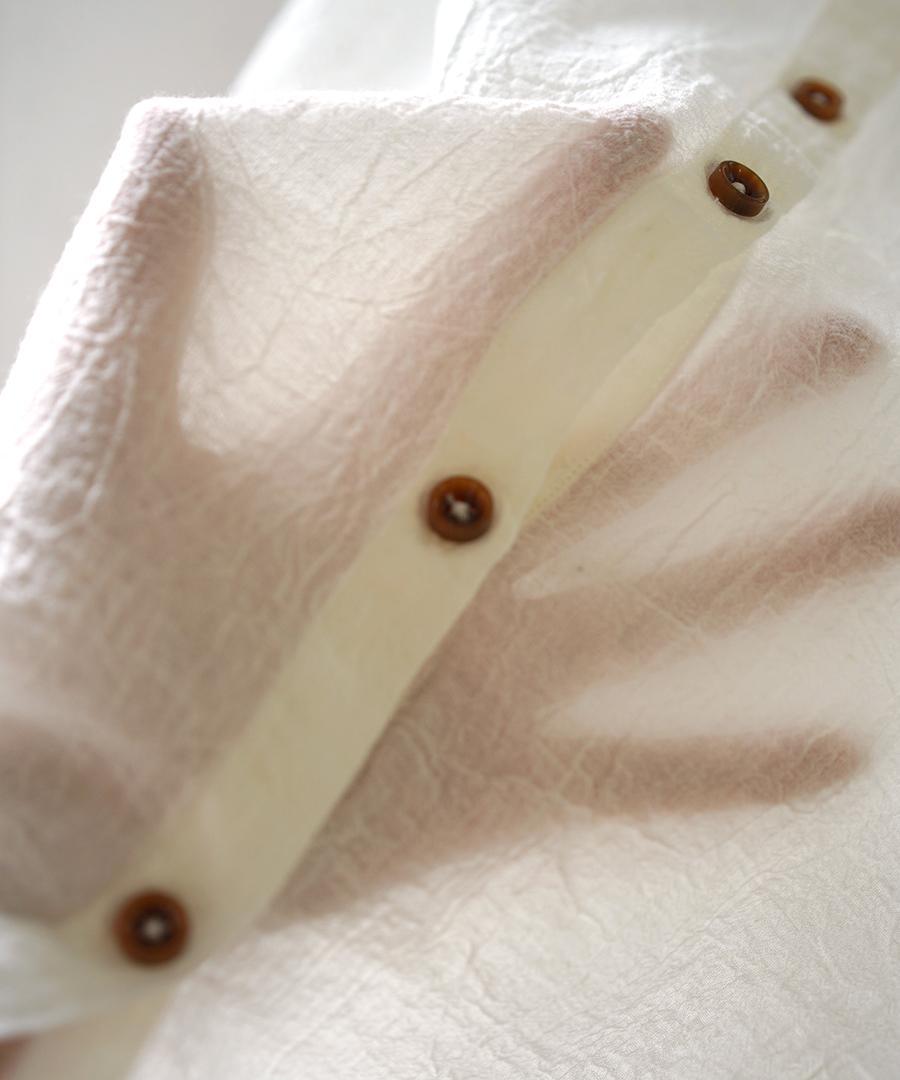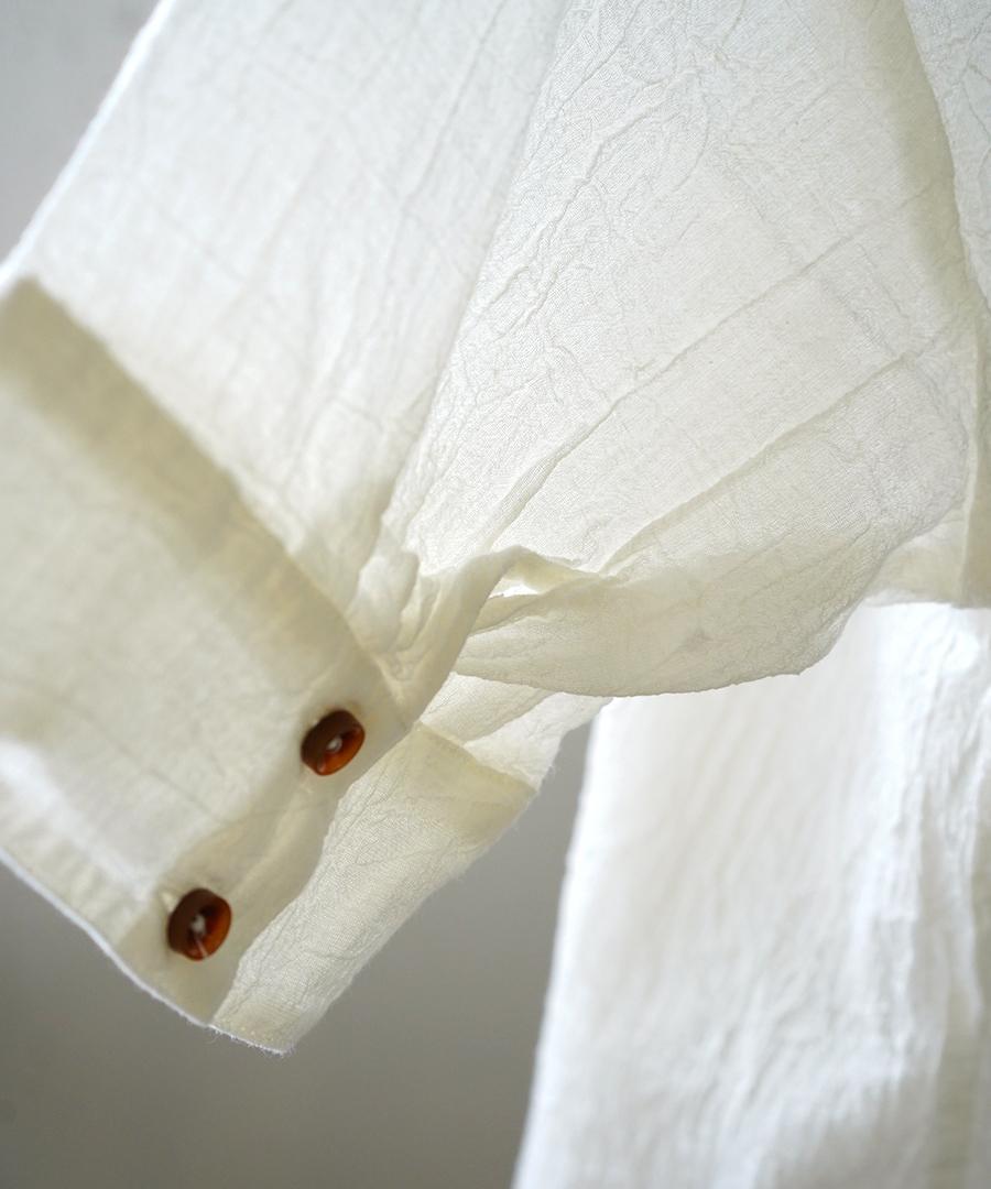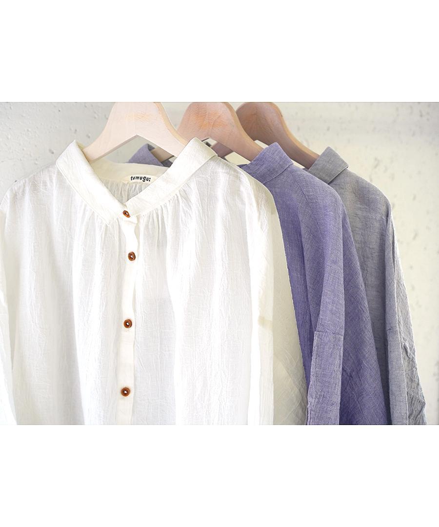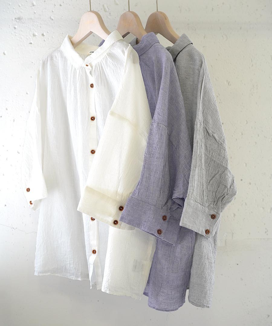 縦糸、横糸それぞれぞに撚糸を加えることで清涼感を出し、手作業でキャッチワッシャー加工をすることでシワをつけて凹凸感のある表情を作り出しています。