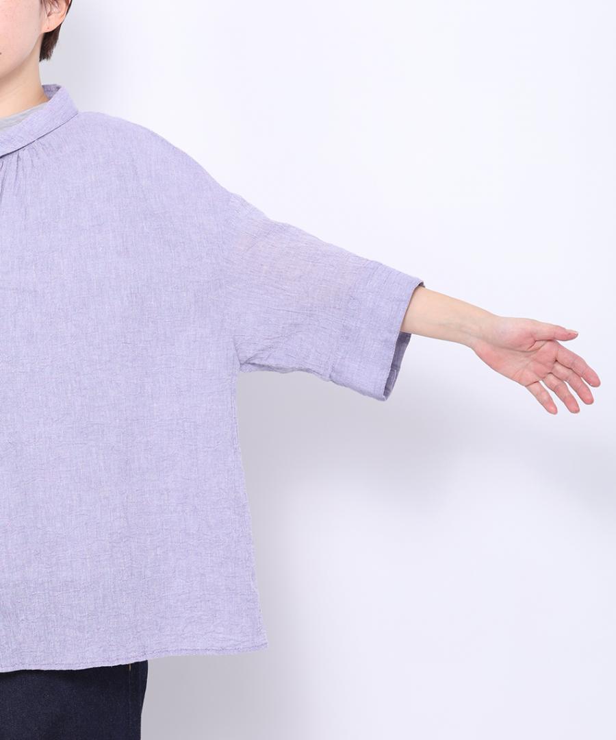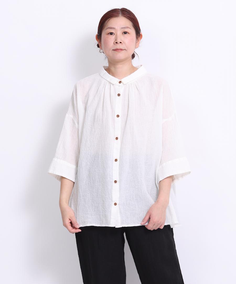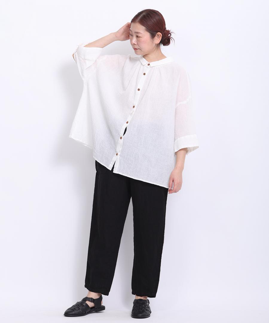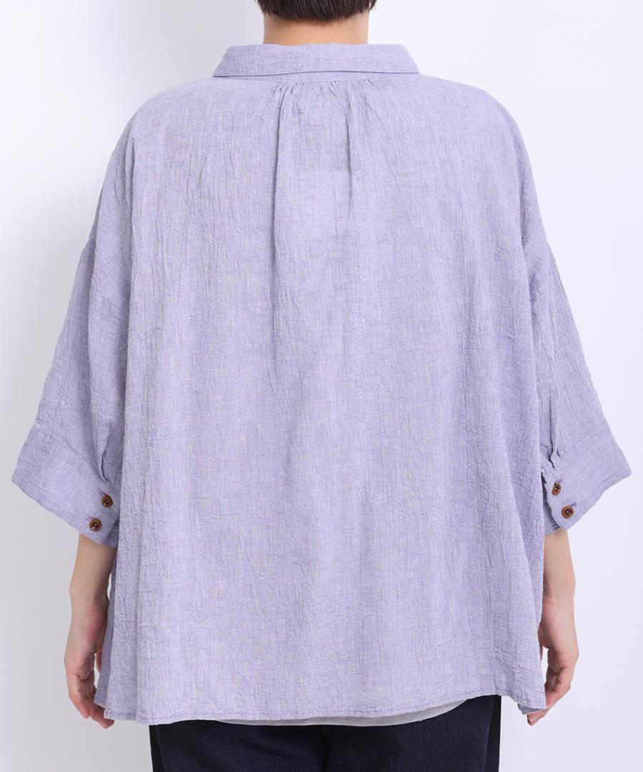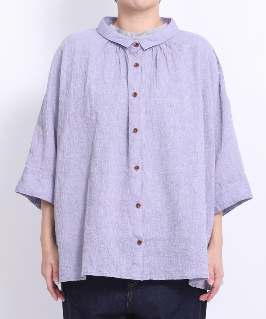 縦糸、横糸それぞれぞに撚糸を加えることで清涼感を出し、手作業でキャッチワッシャー加工をすることでシワをつけて凹凸感のある表情を作り出しています。