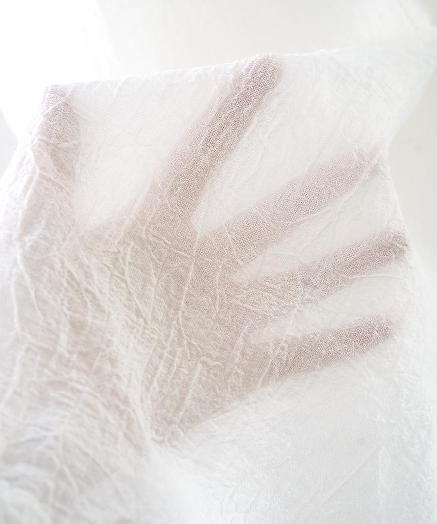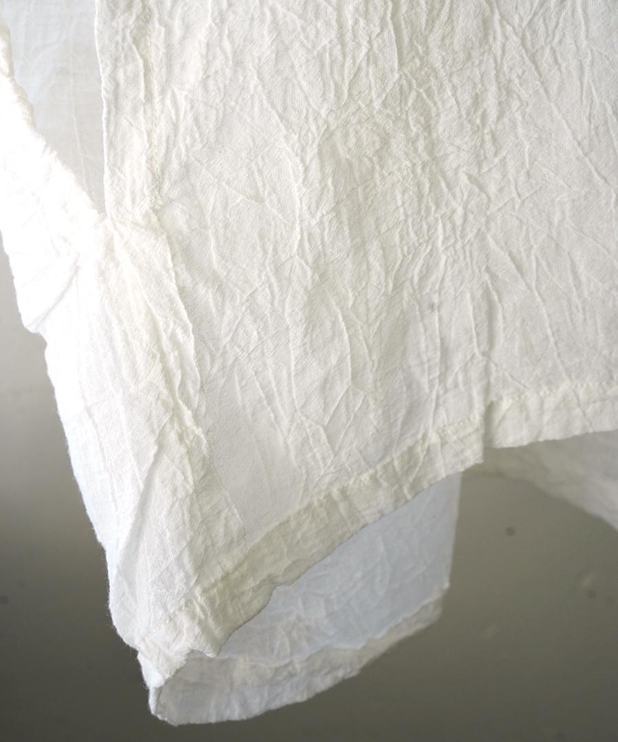 縦糸、横糸それぞれぞに撚糸を加えることで清涼感を出し、手作業でキャッチワッシャー加工をすることでシワをつけて凹凸感のある表情を作り出しています。