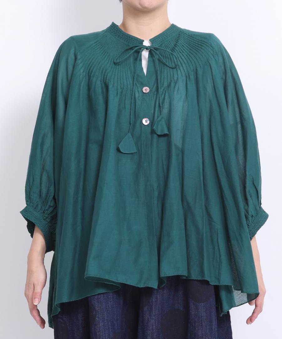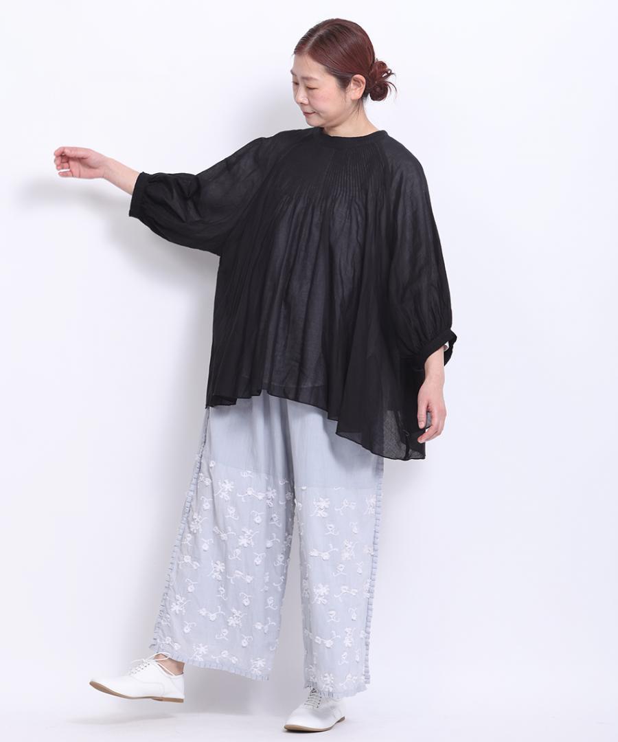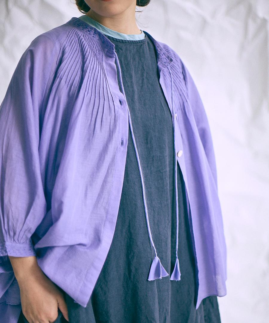 袖口と襟ぐりには太番手の手刺繍で1つ1つ丁寧に仕上げた贅沢な1着に仕上がっています。