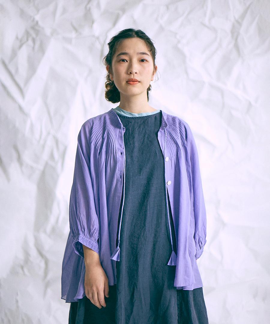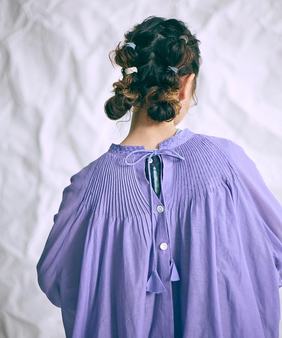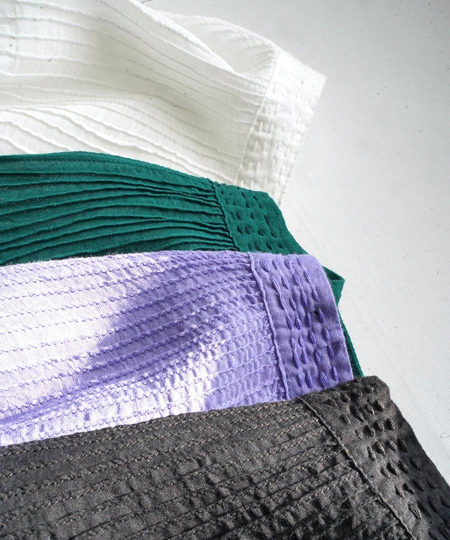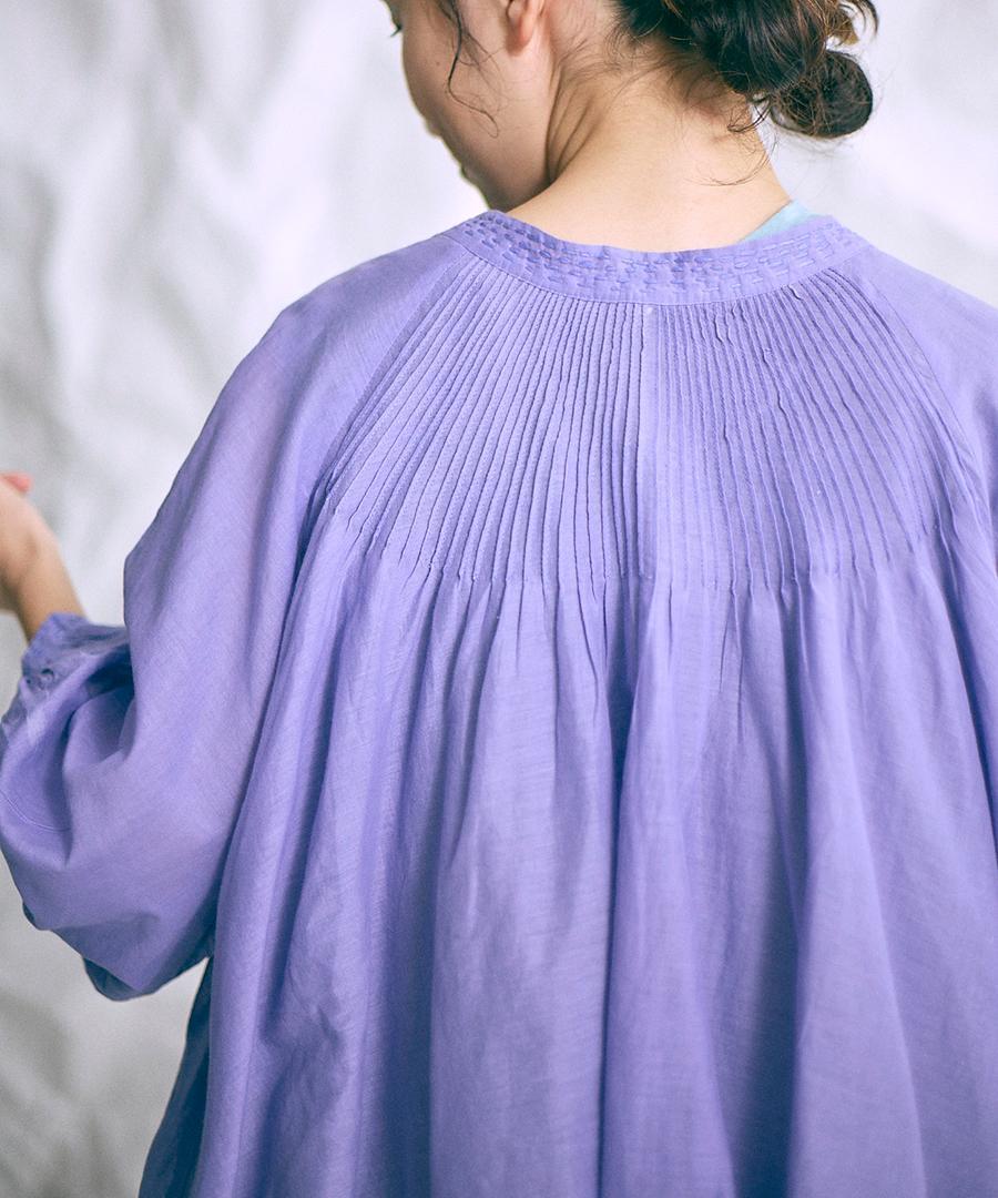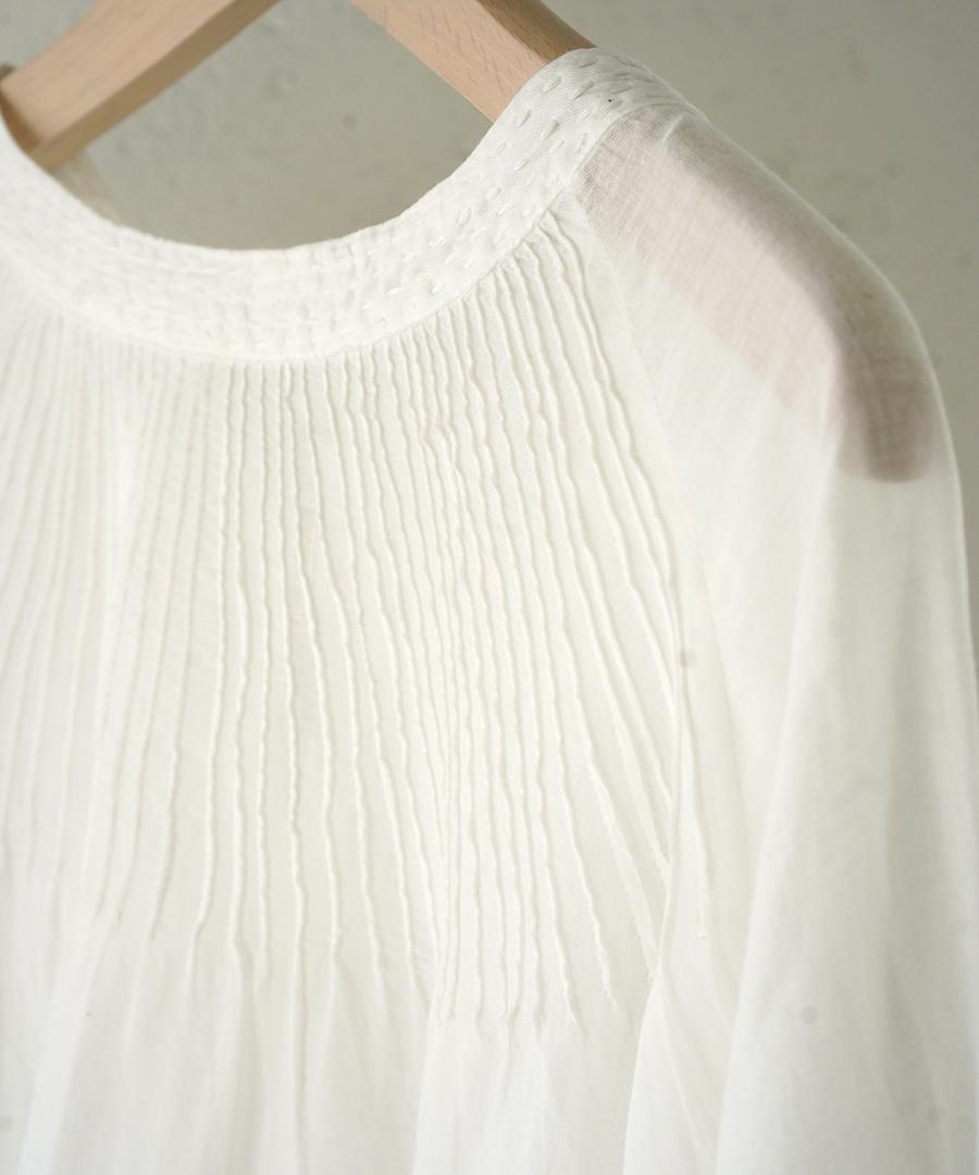 放射線状に細やかなピンタックを入れ、ふんわりと立体的なドレープ性のあるシルエットが特徴です。