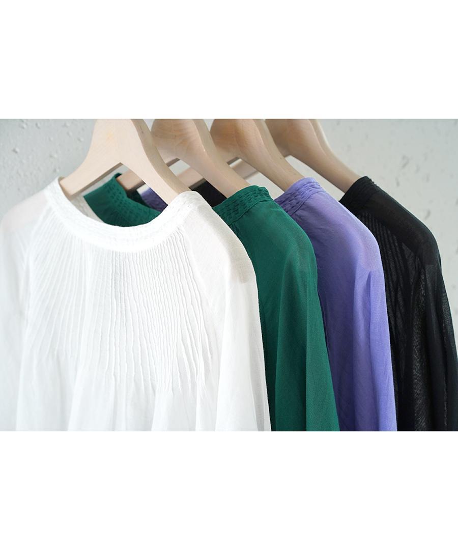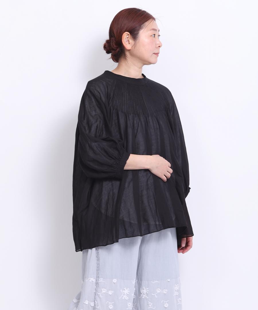柔らかな透け感とふんわり波打つドレープが魅力のブラウス。