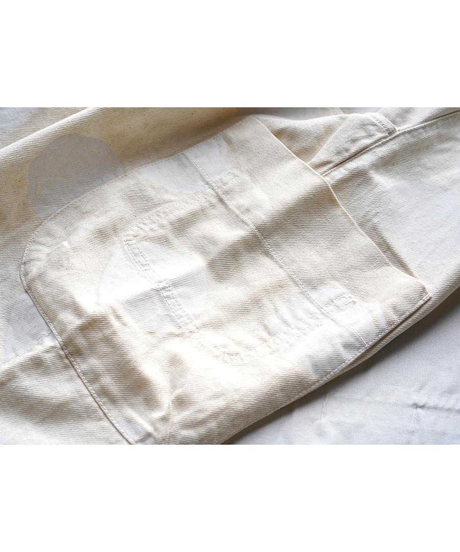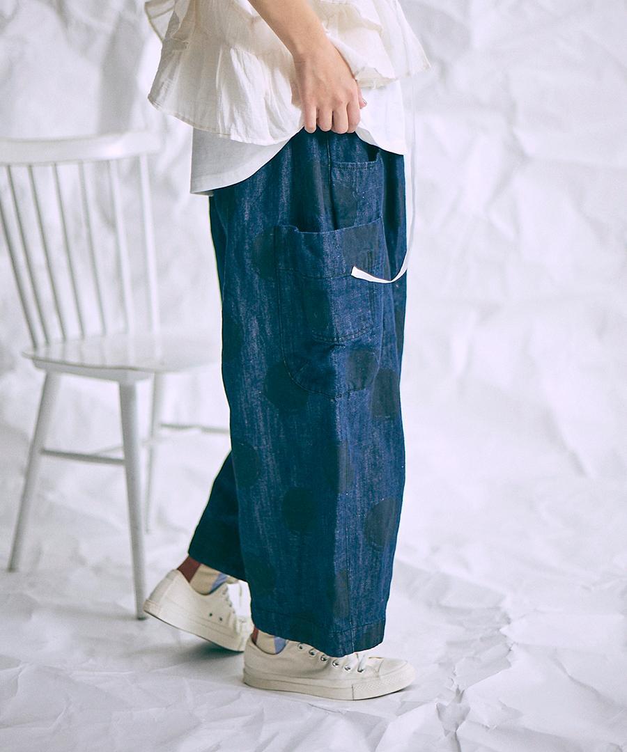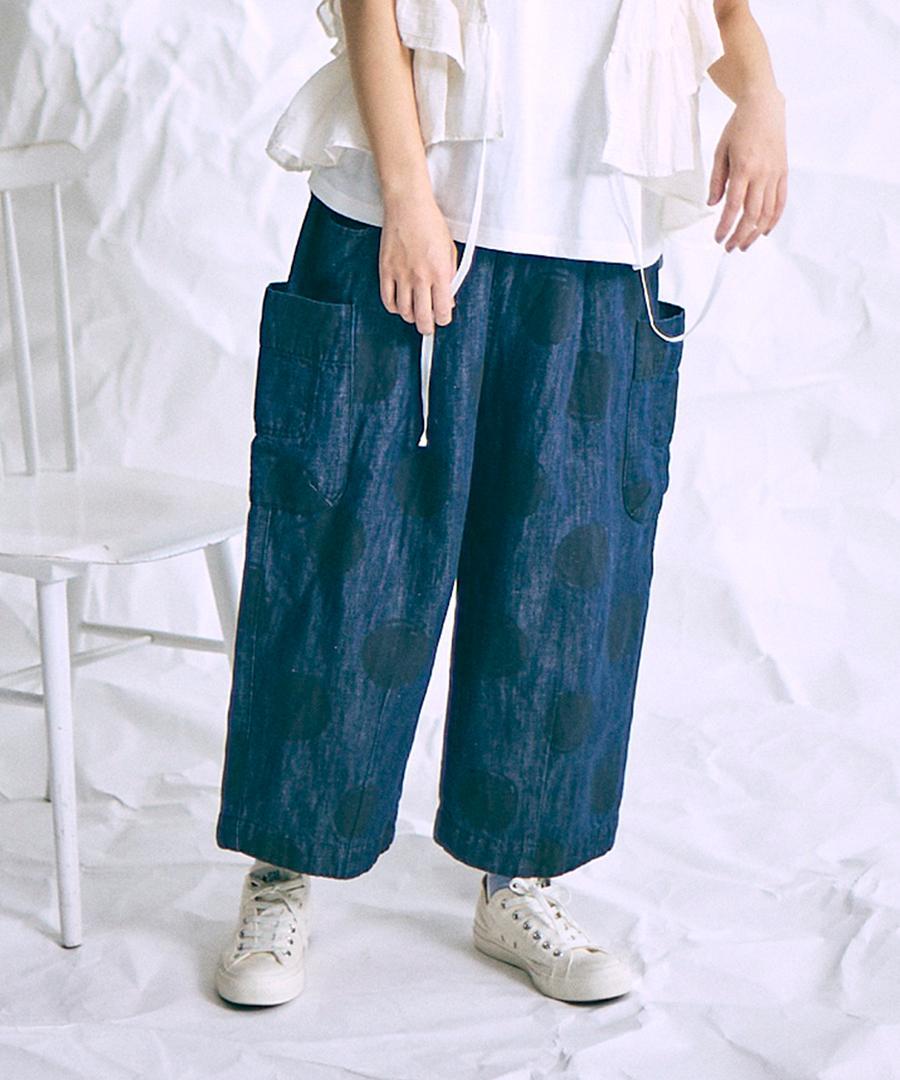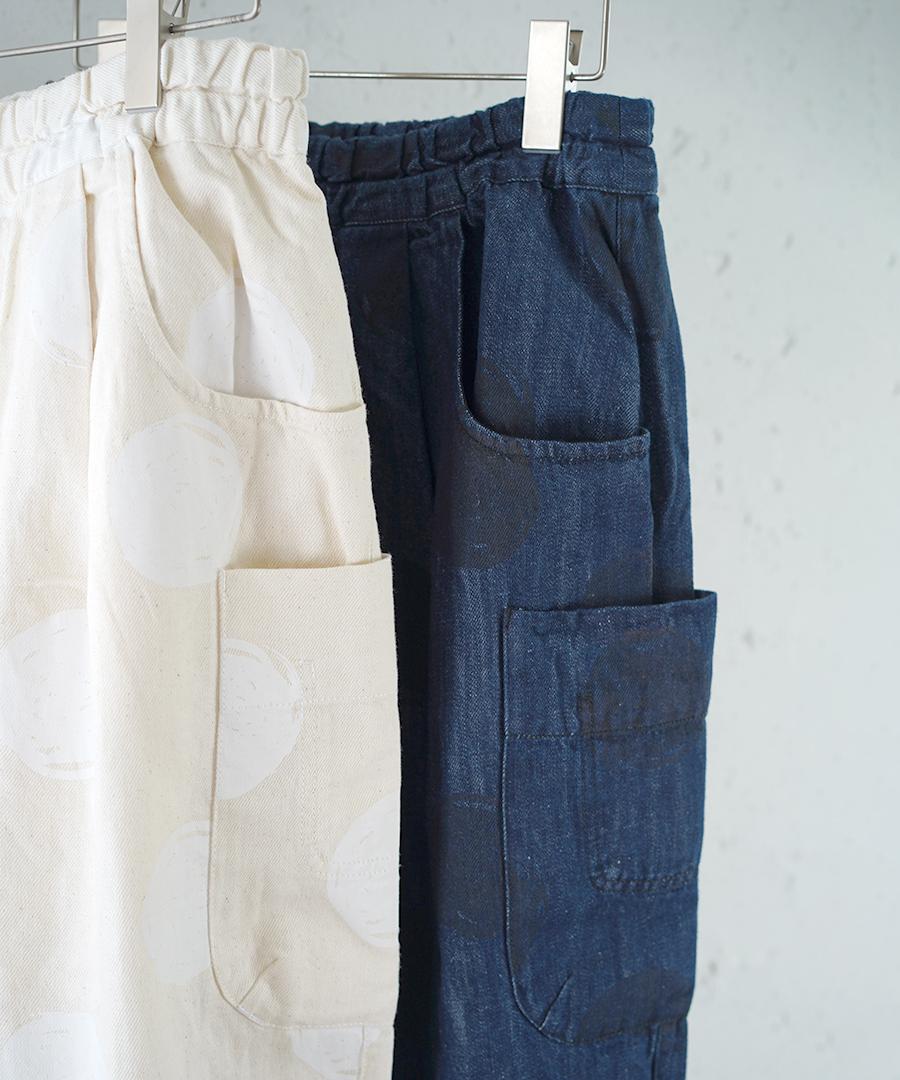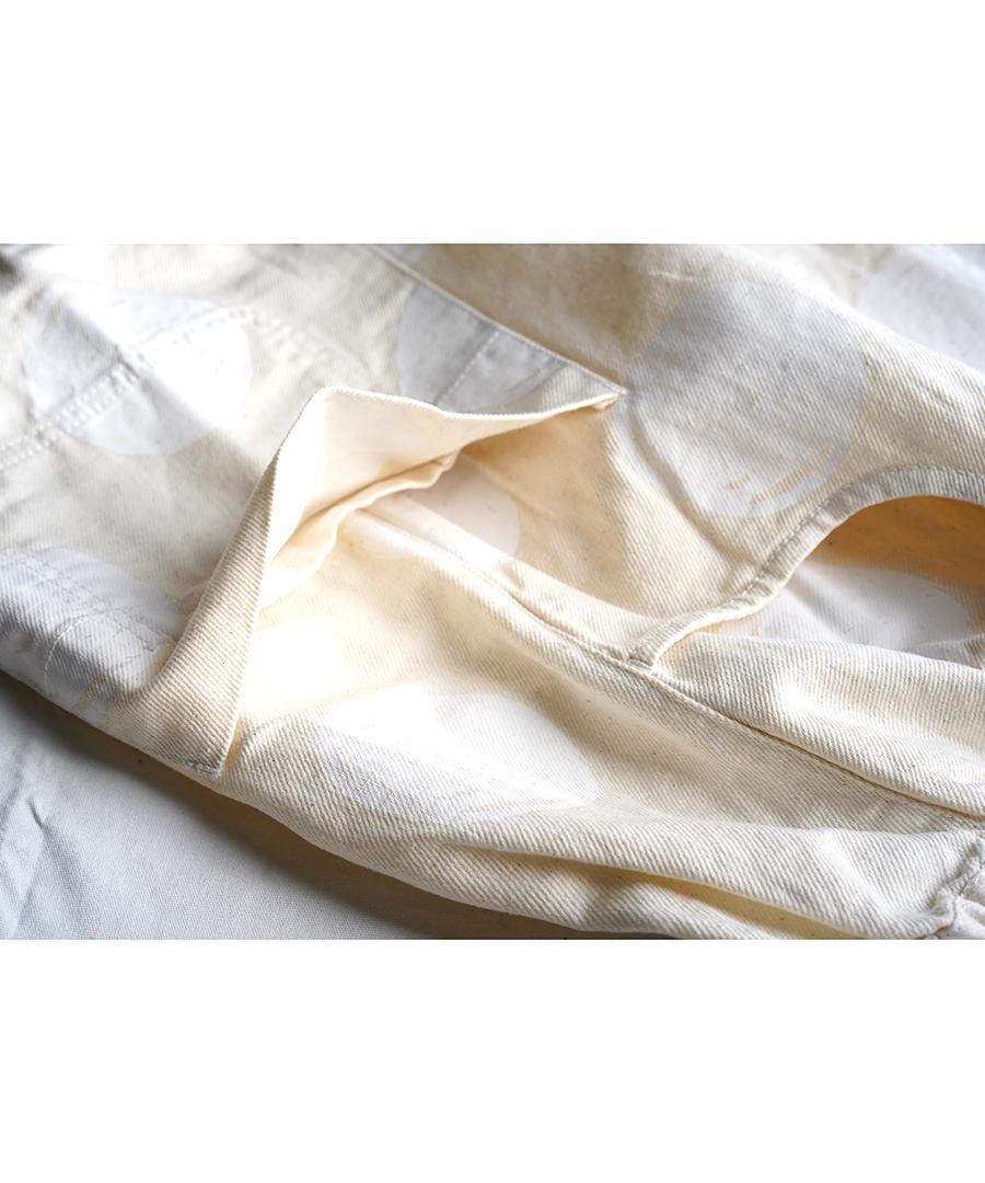 10オンスのコットンリネンデニムをベースにオリジナルの大柄の手描きドットプリントをのせました。