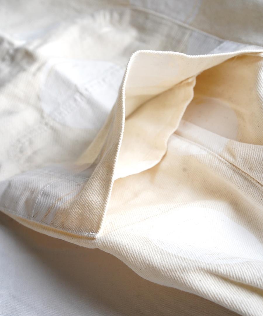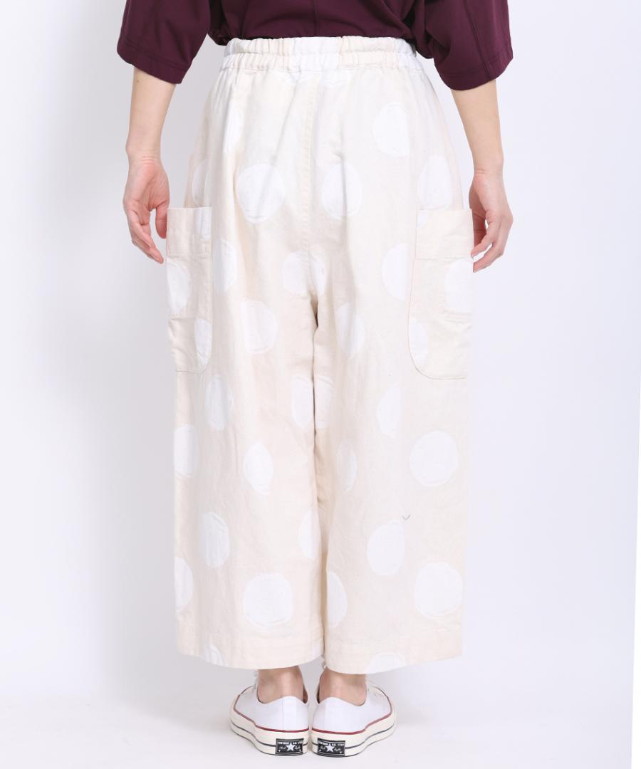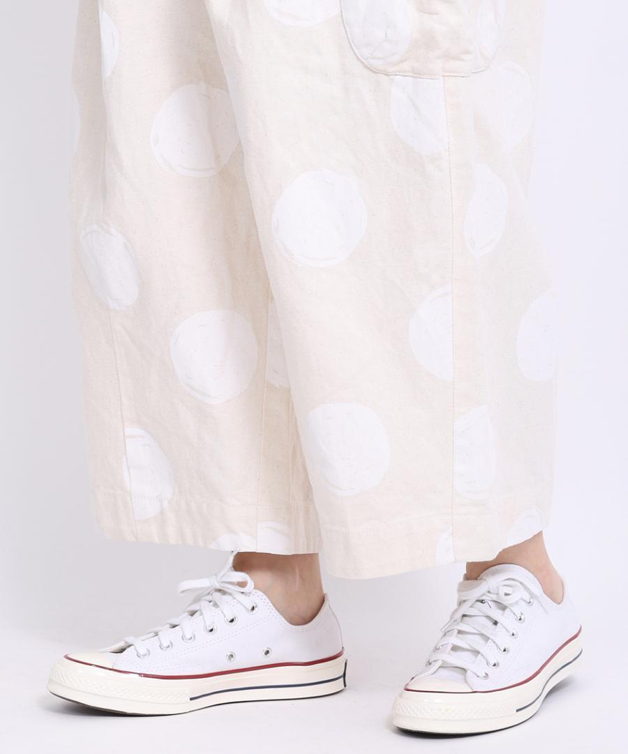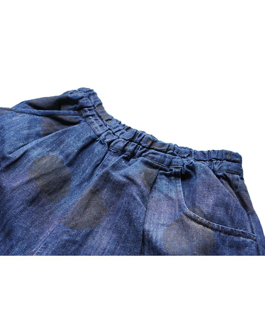 10オンスのコットンリネンデニムをベースにオリジナルの大柄の手描きドットプリントをのせました。