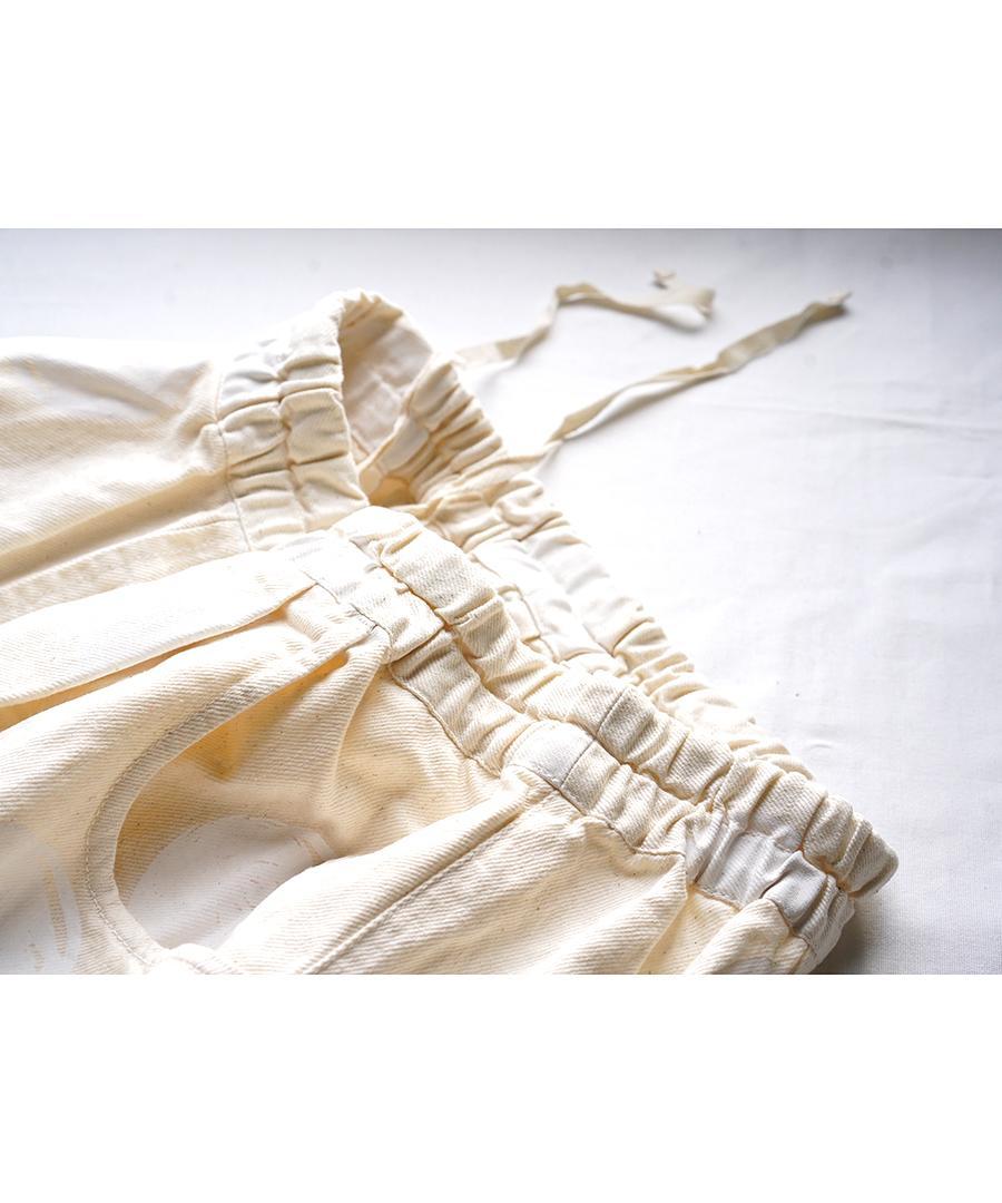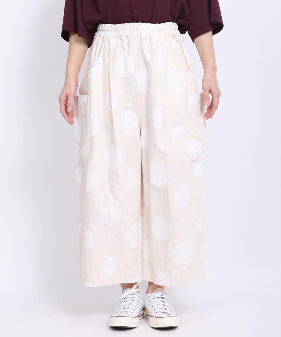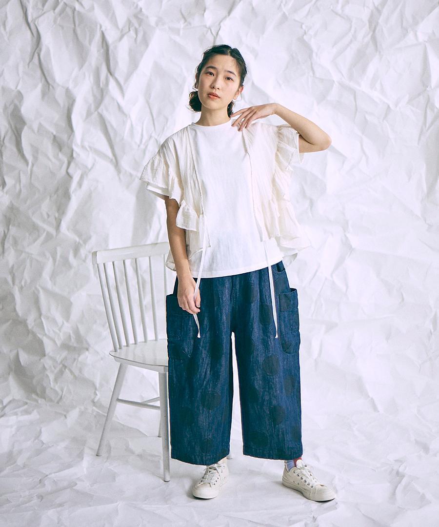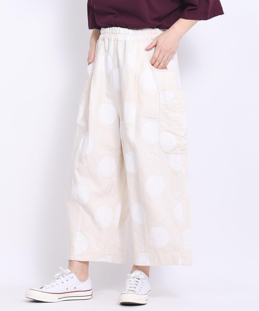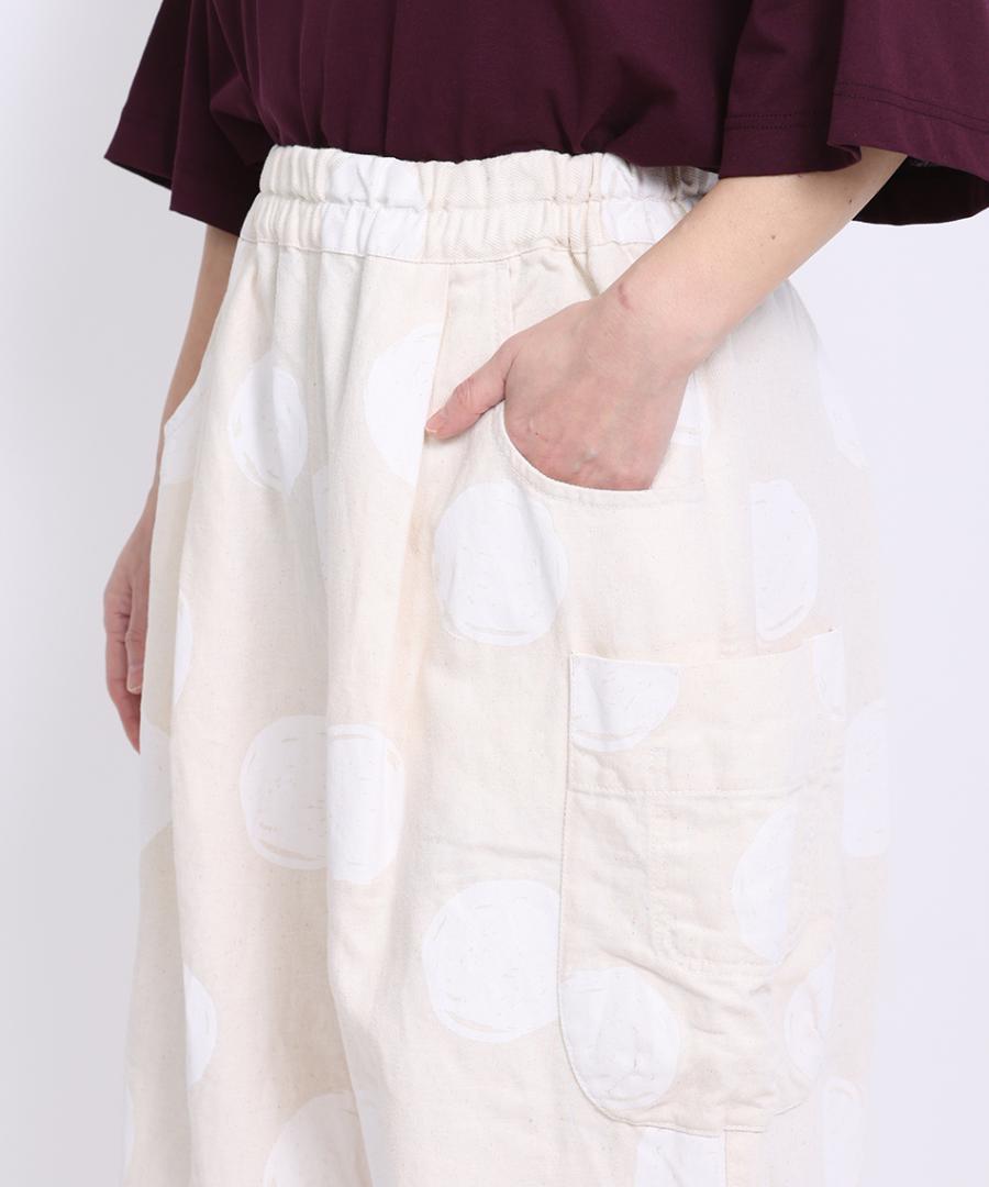 10オンスのコットンリネンデニムをベースにオリジナルの大柄の手描きドットプリントをのせました。