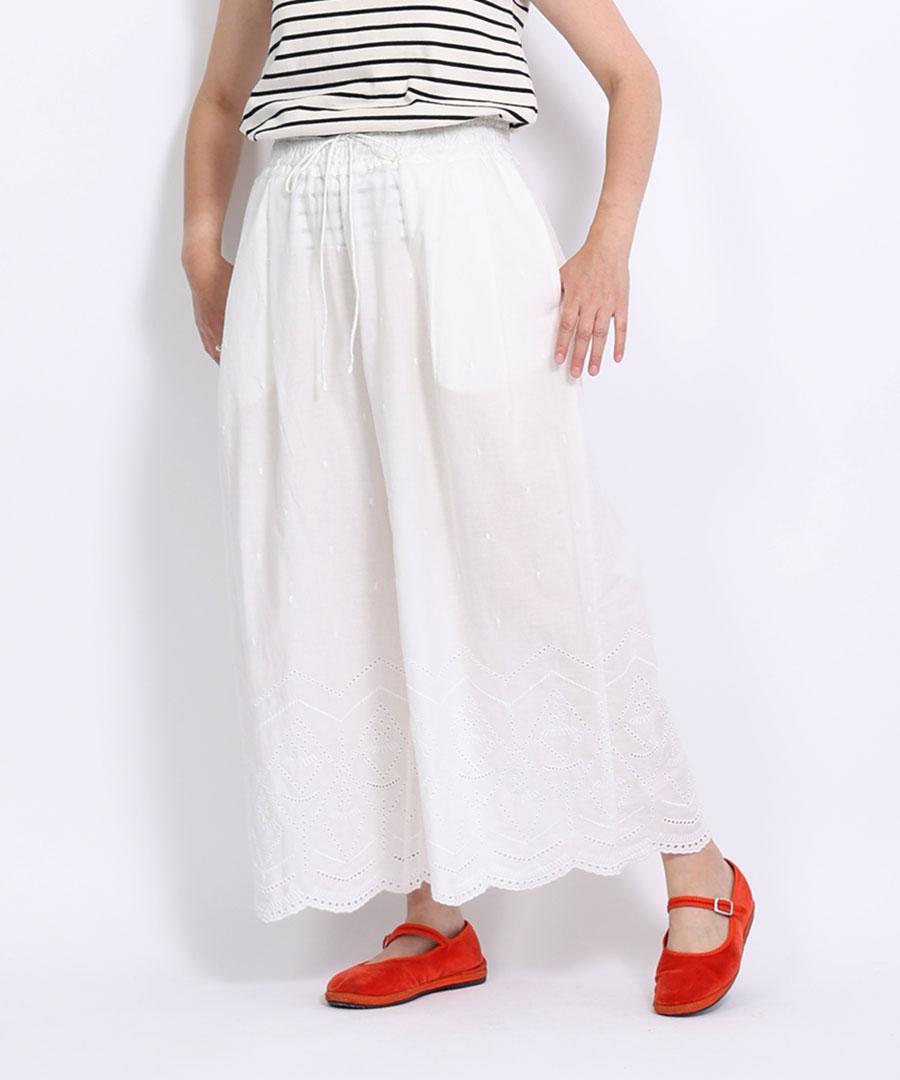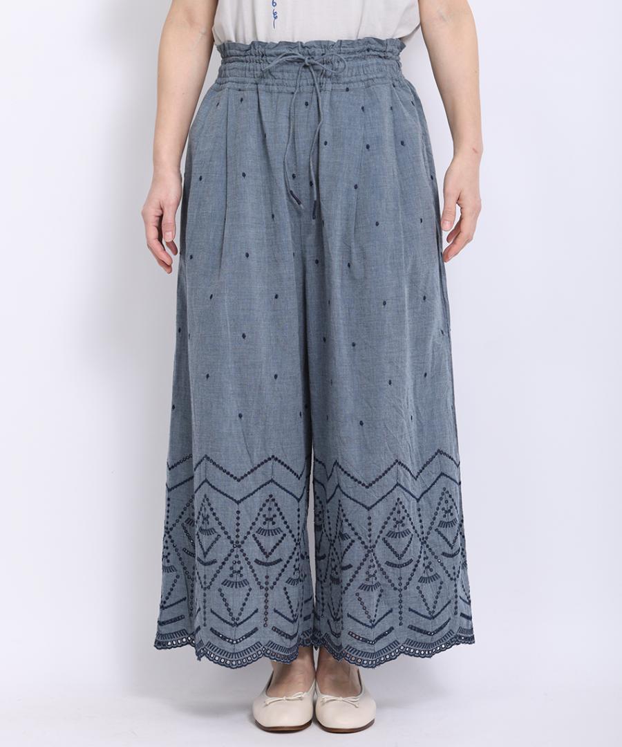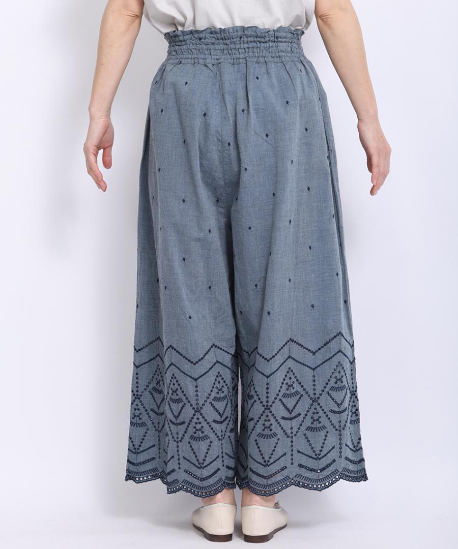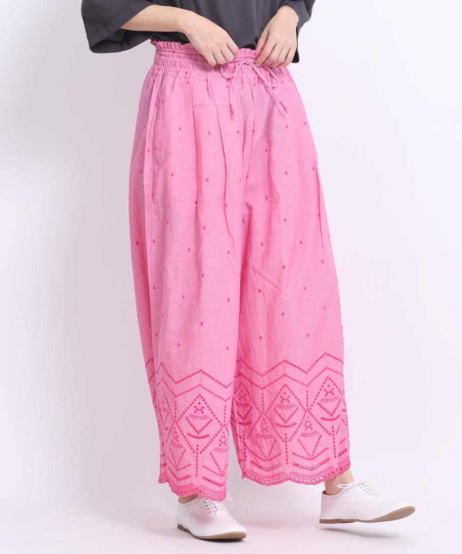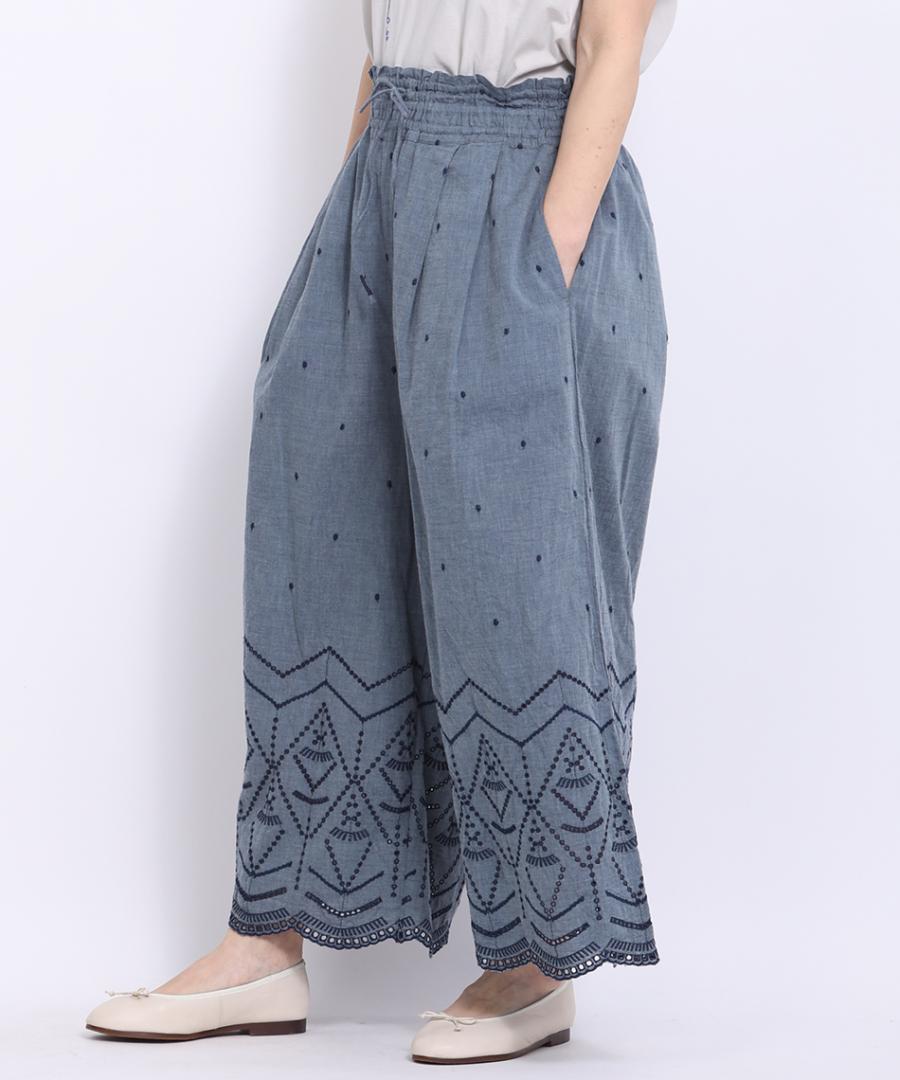 裾のカットワーク刺繍が華やかさを加えてくれるデザインパンツです。