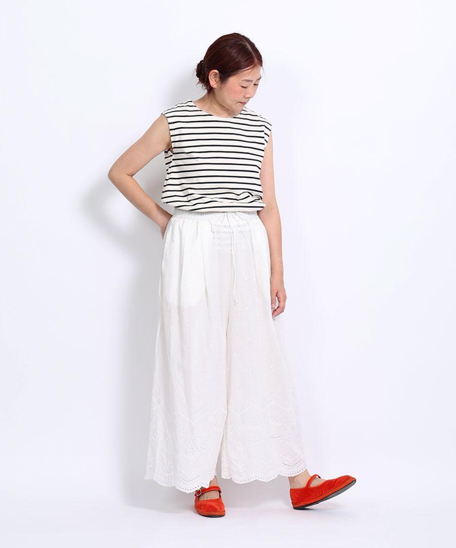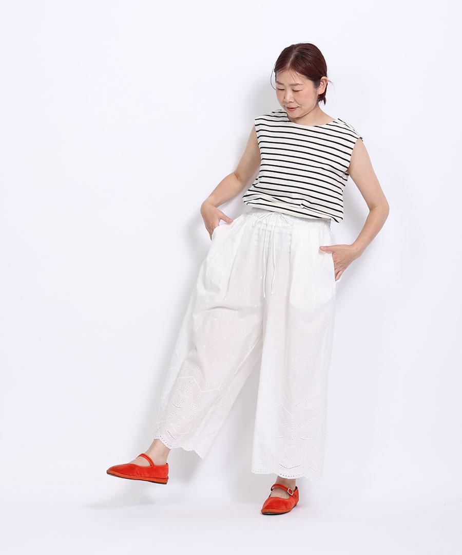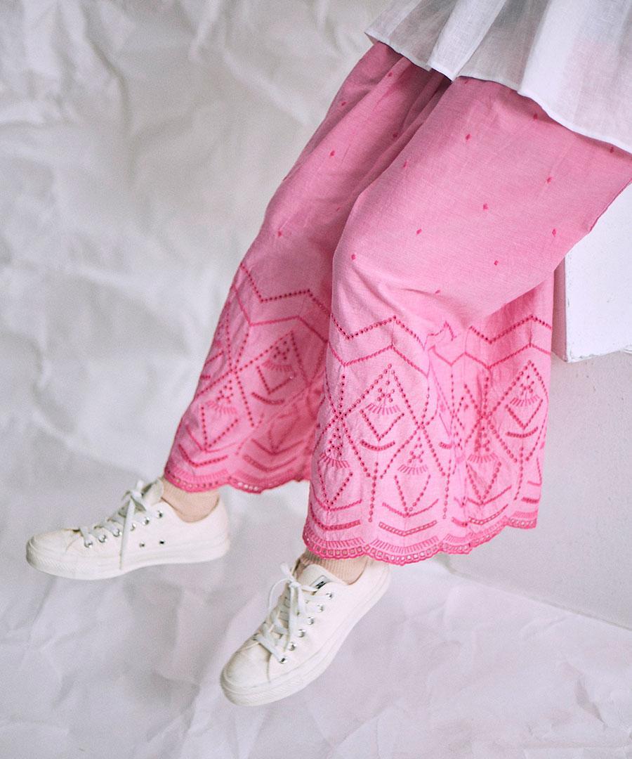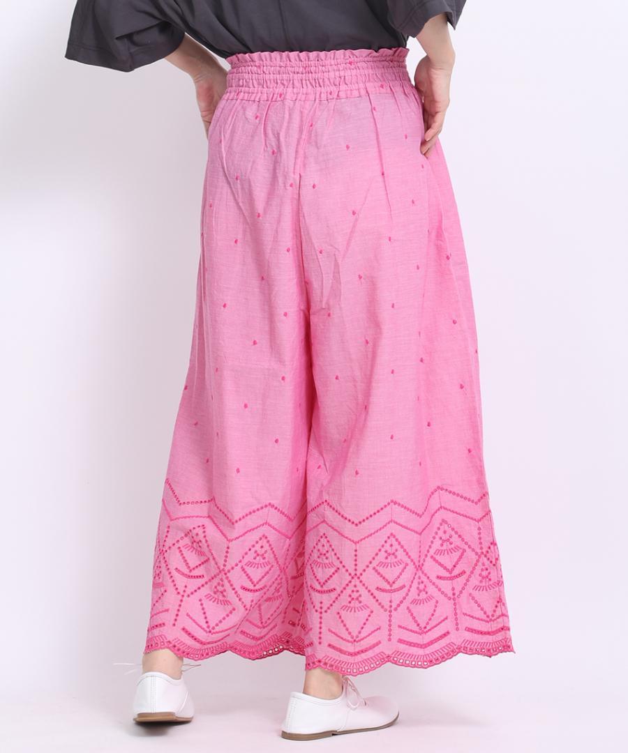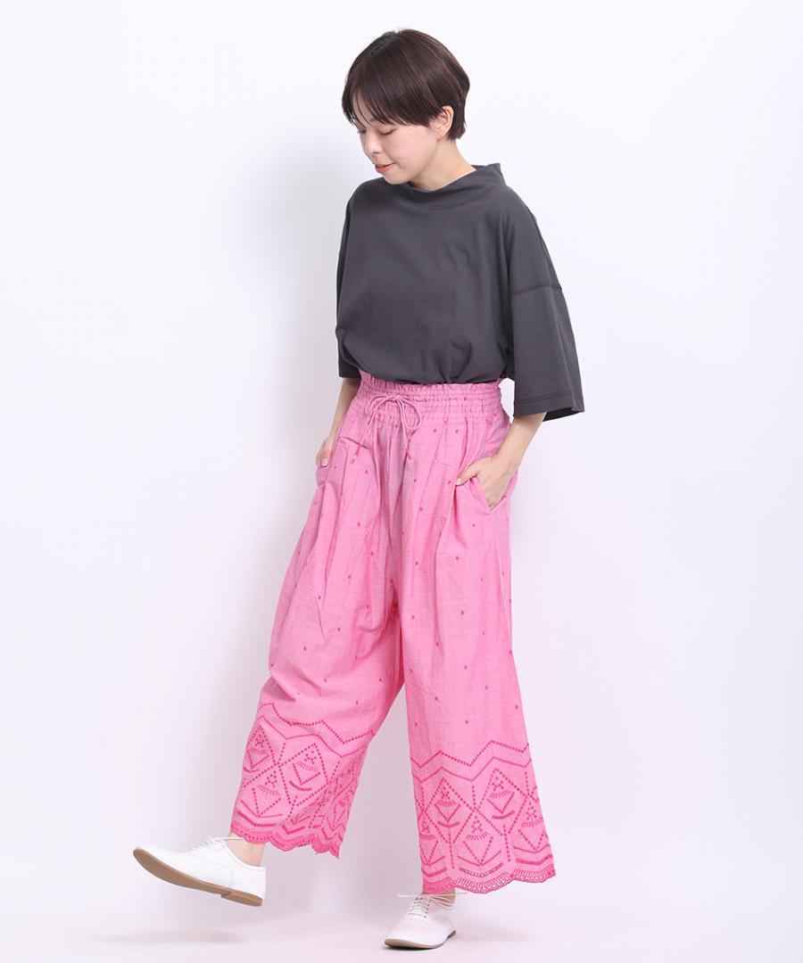 裾のカットワーク刺繍が華やかさを加えてくれるデザインパンツです。