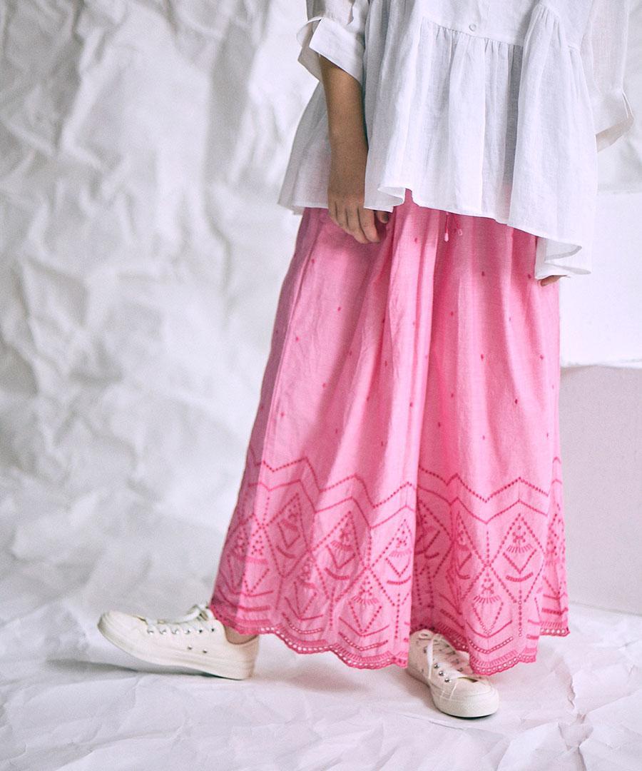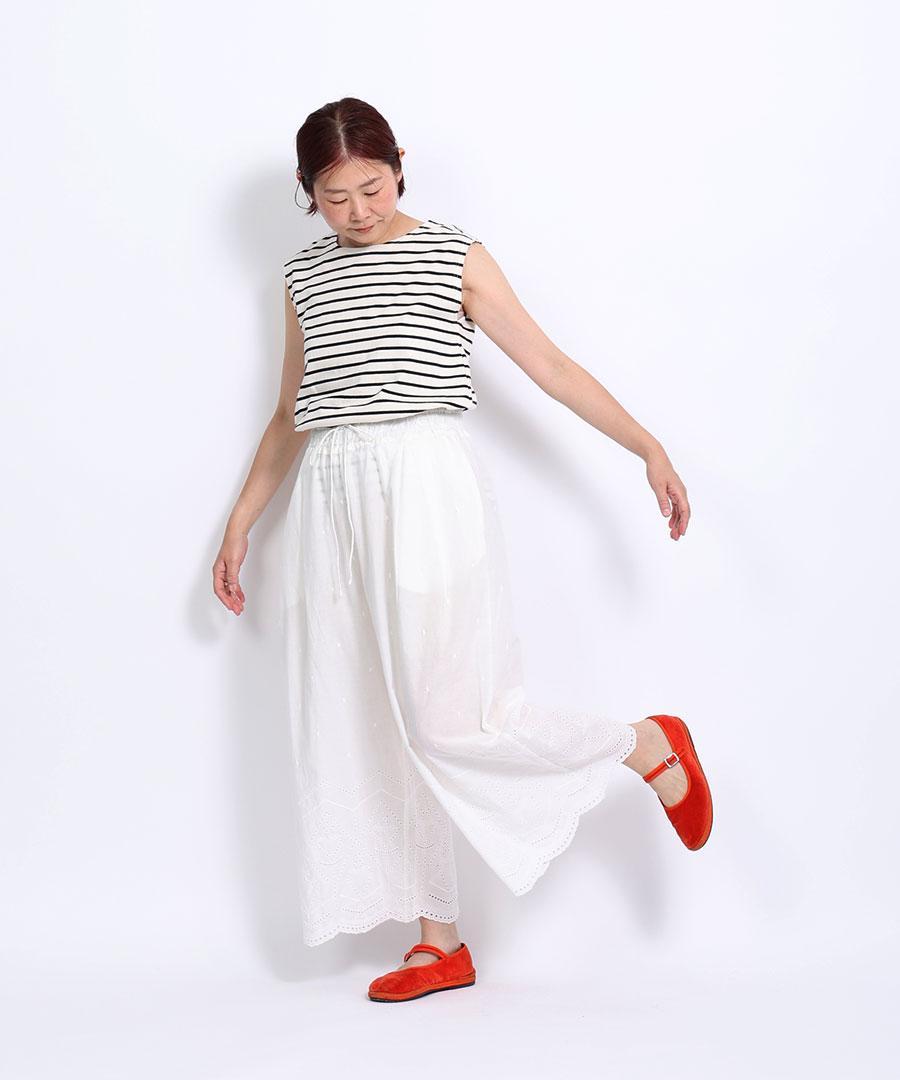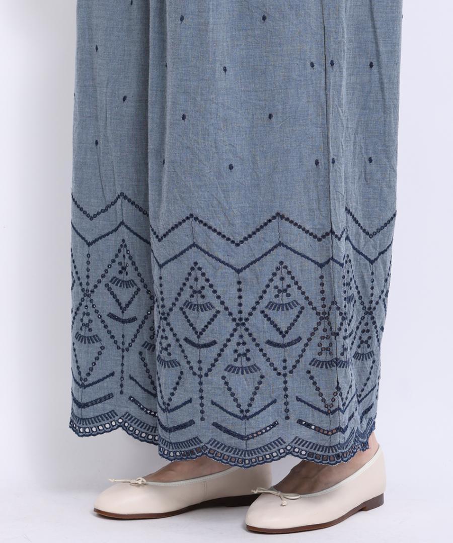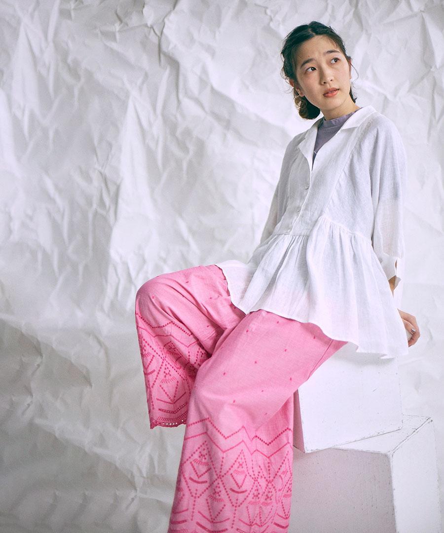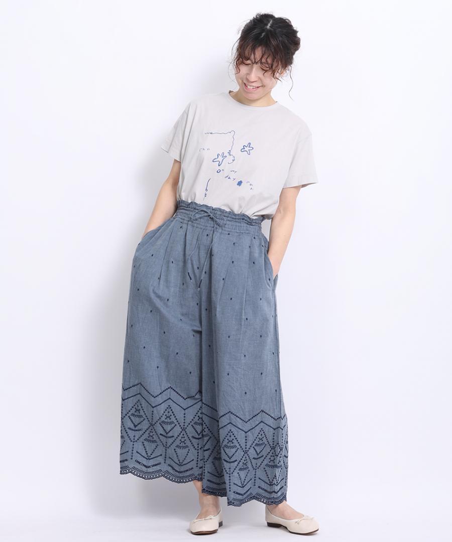 裾のカットワーク刺繍が華やかさを加えてくれるデザインパンツです。