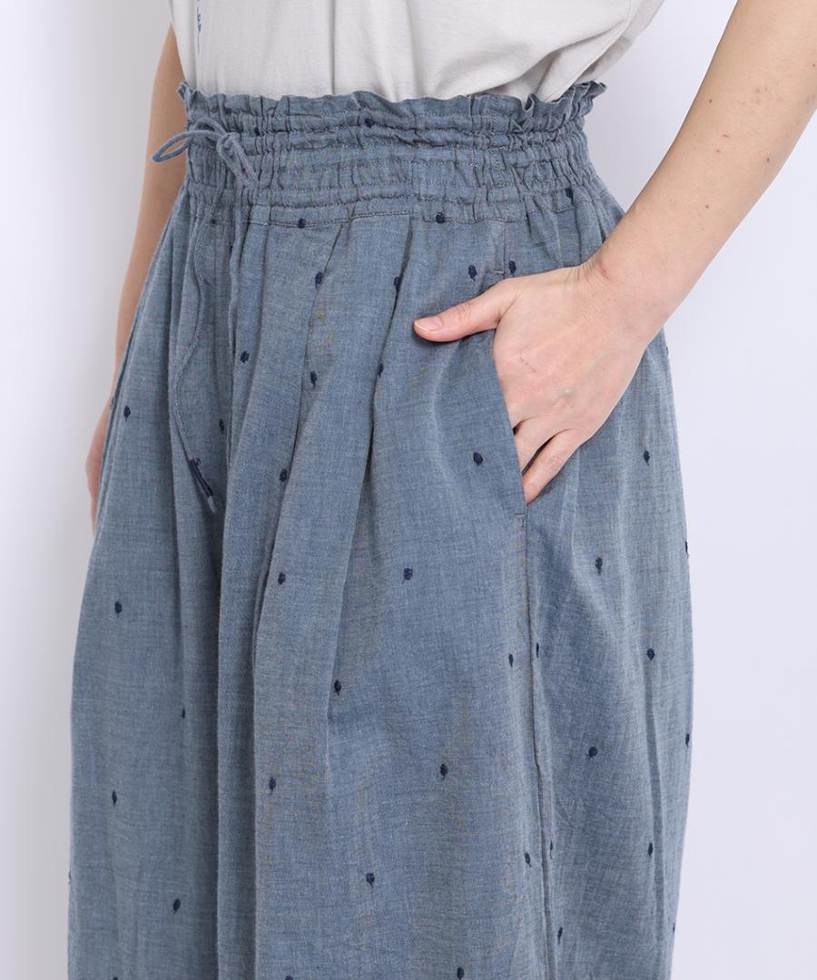 先染めのシャンブレー生地にオリジナルのオリジナルの幾何柄カットワークとドットの刺繍を施しました。