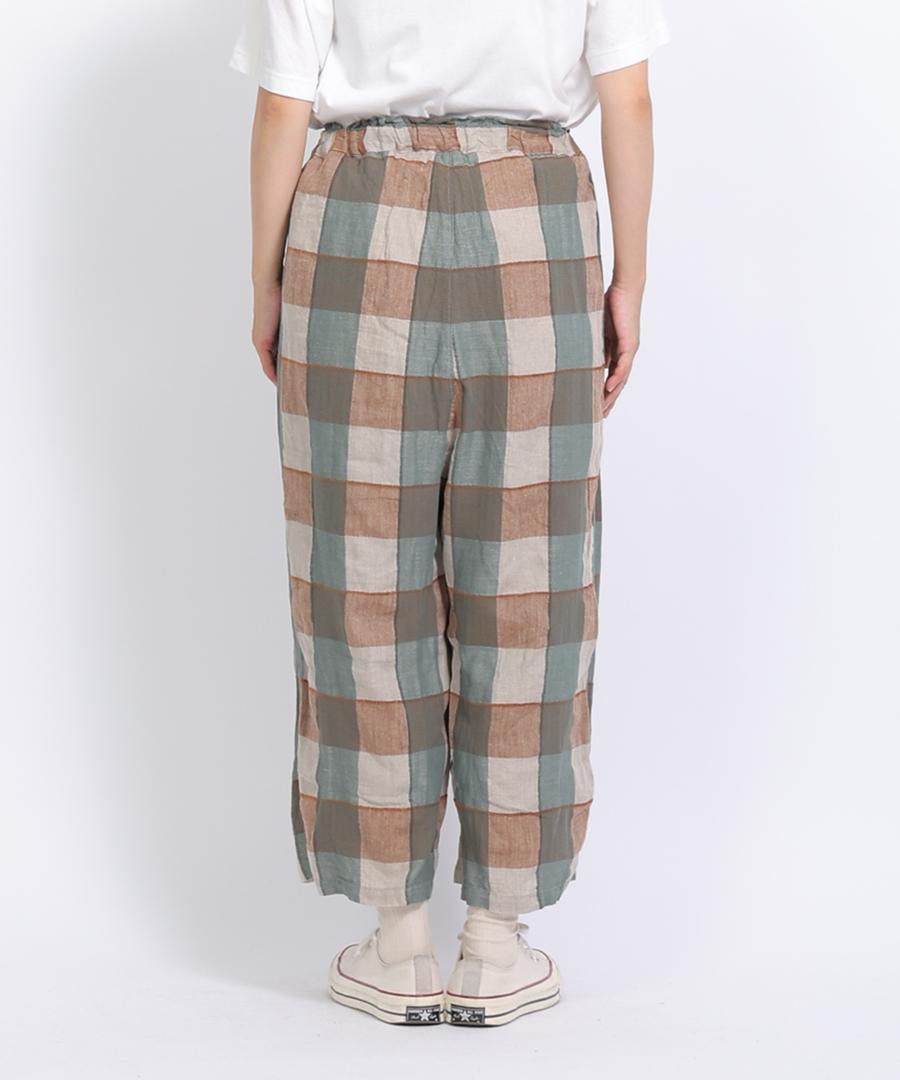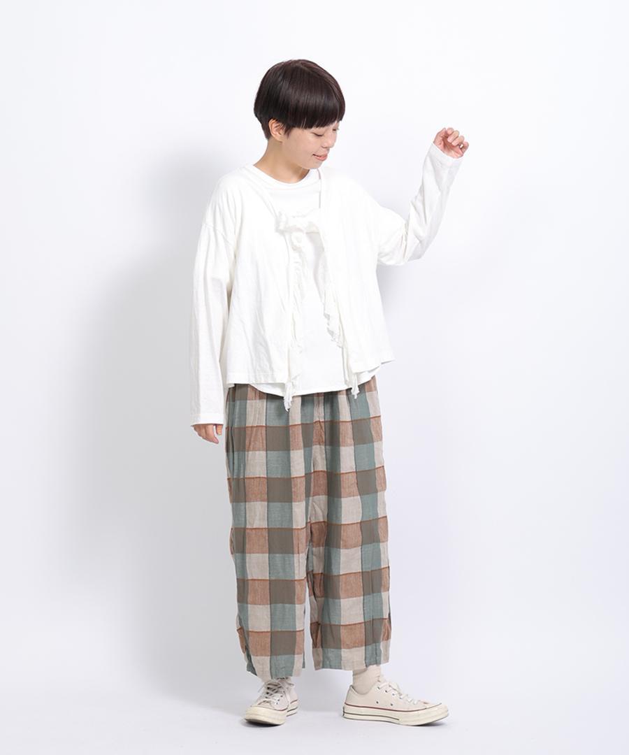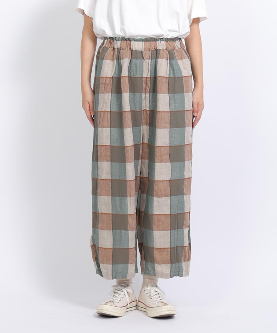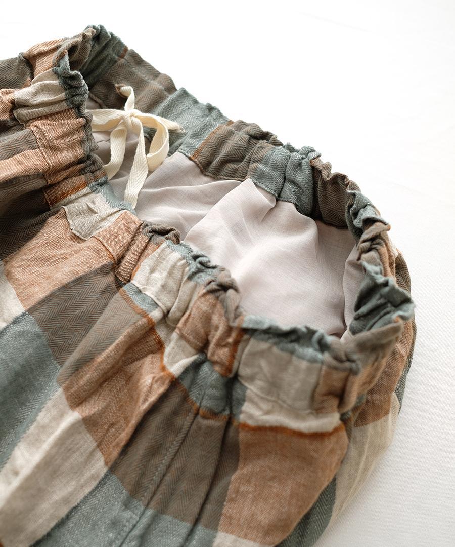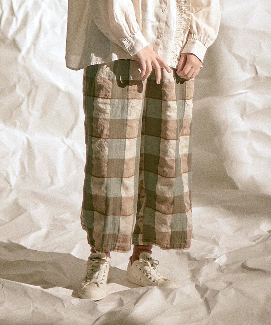 コットンとリネンのチェックにコットンモール糸を入れてポイントにしたオリジナル生地で仕立てた8分丈パンツ。