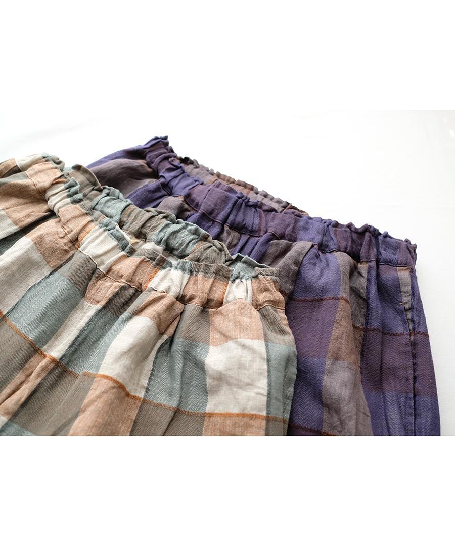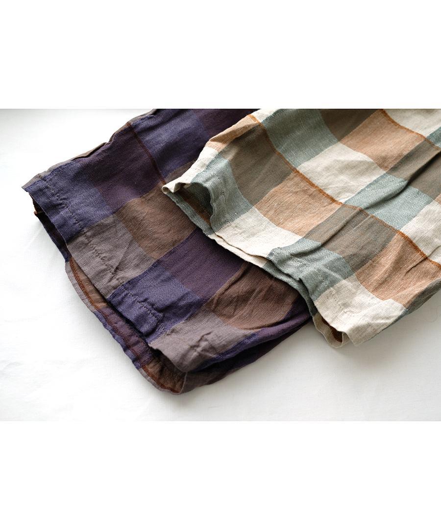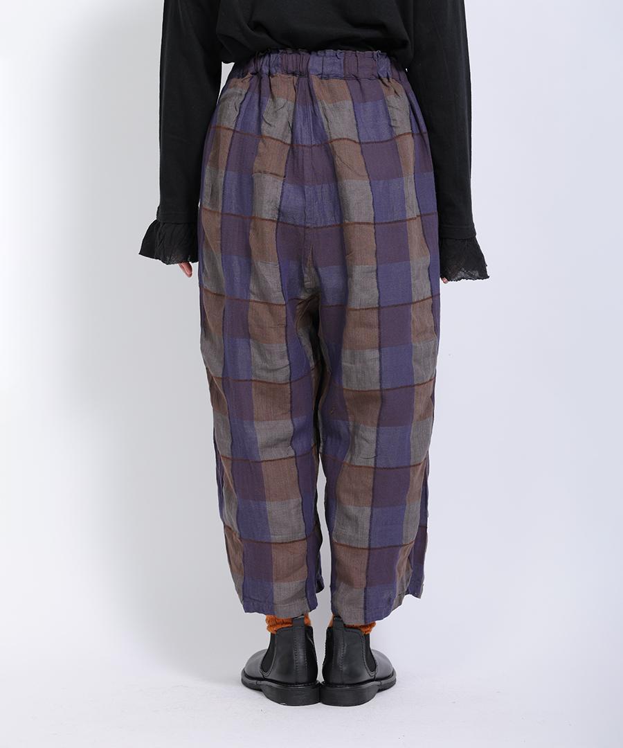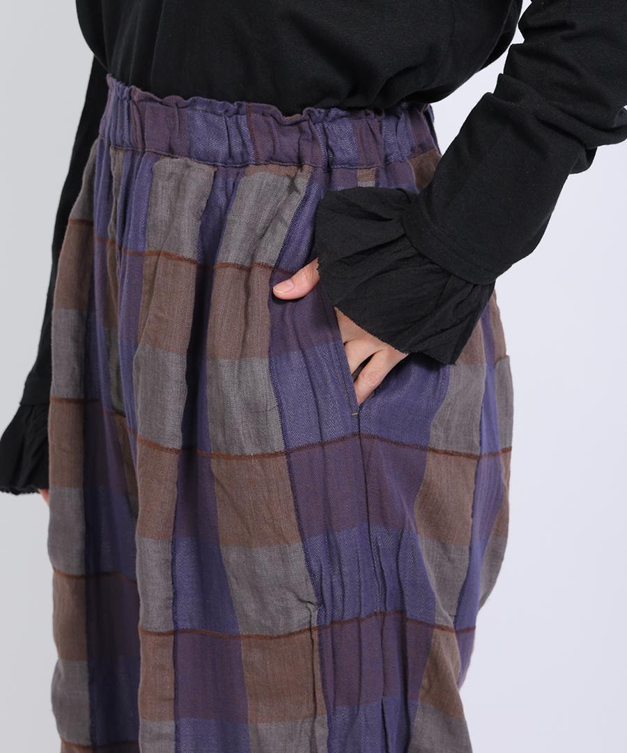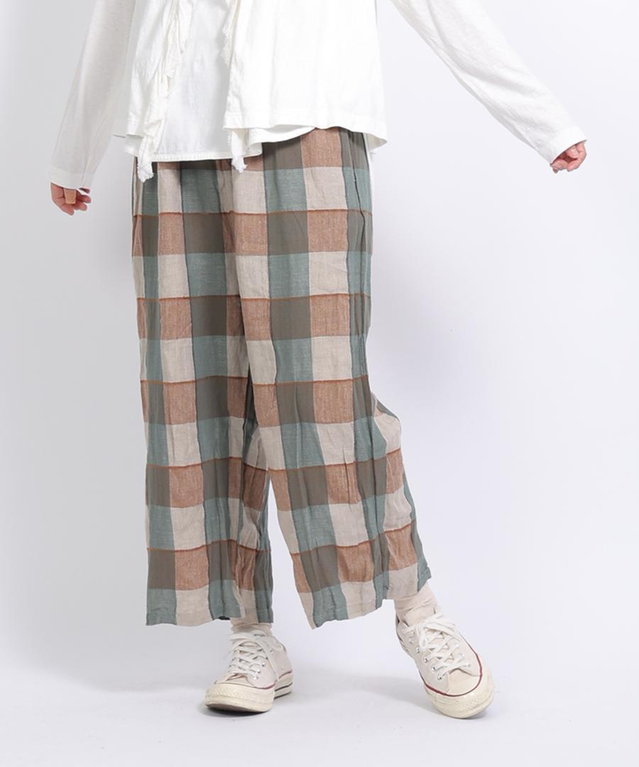 コットンとリネンのチェックにコットンモール糸を入れてポイントにしたオリジナル生地で仕立てた8分丈パンツ。