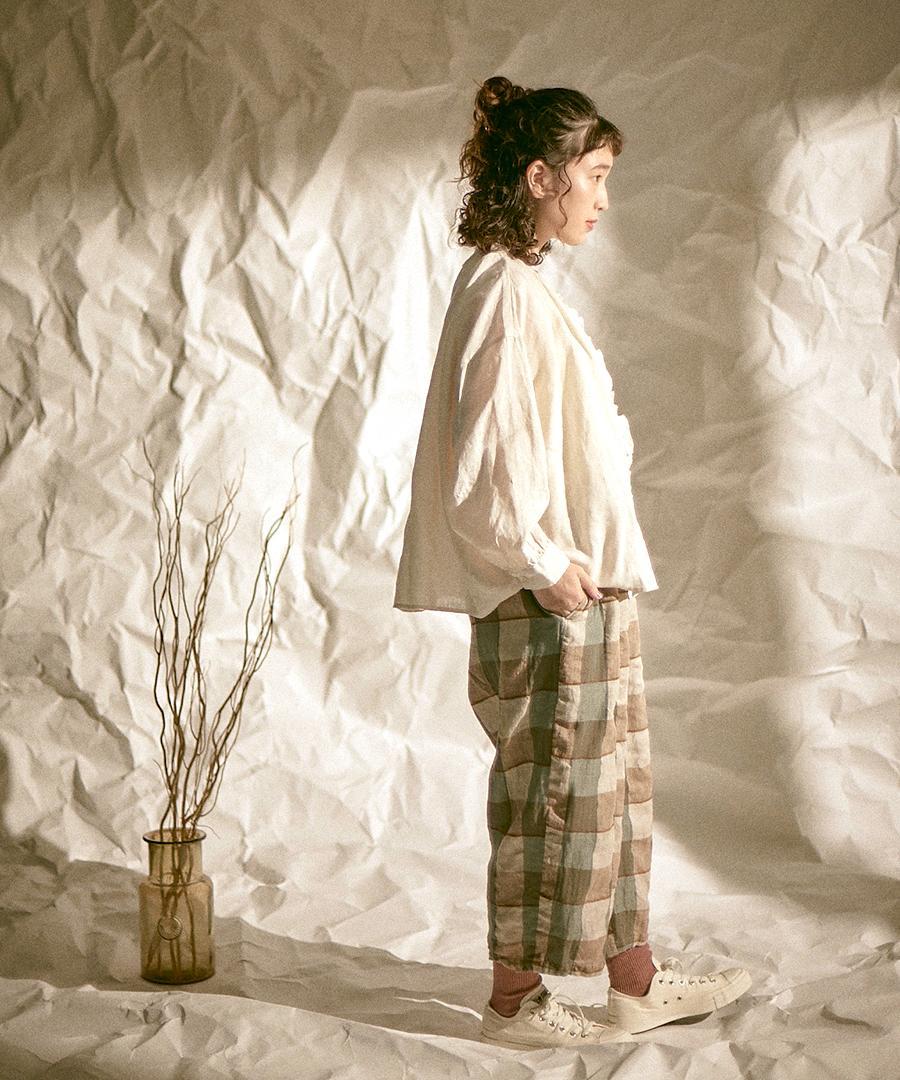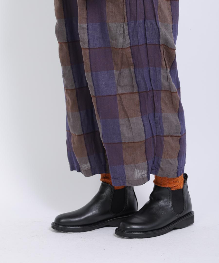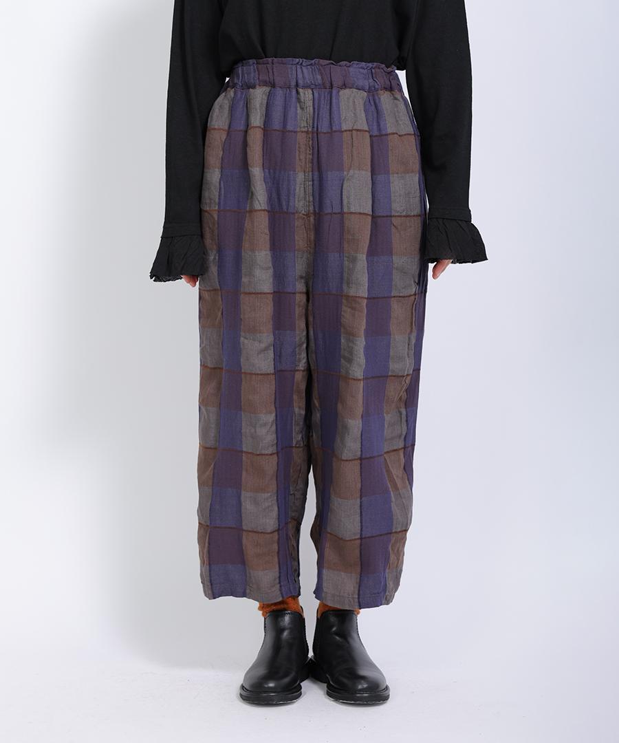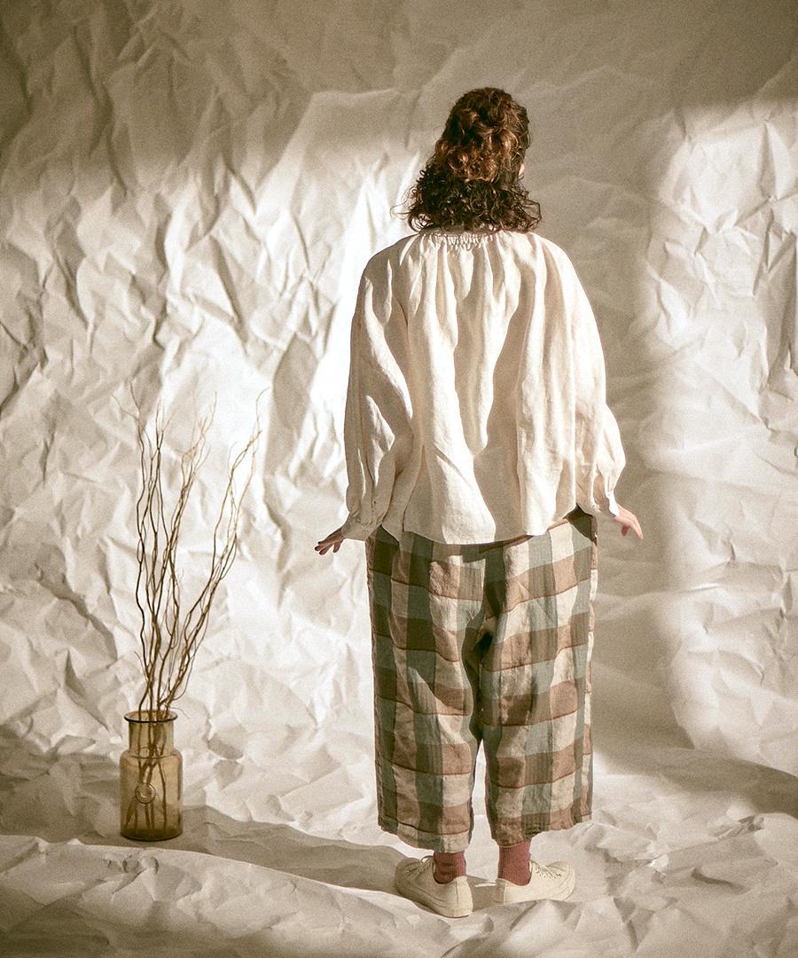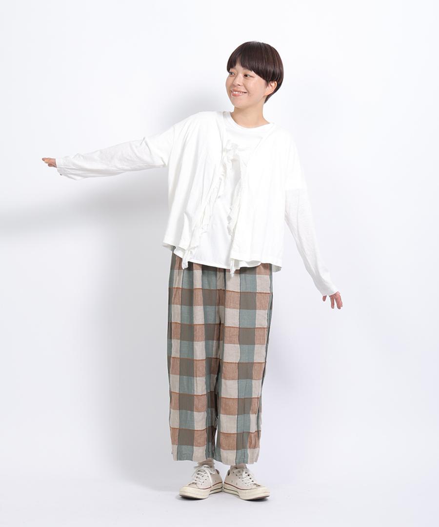 コットンとリネンのチェックにコットンモール糸を入れてポイントにしたオリジナル生地で仕立てた8分丈パンツ。