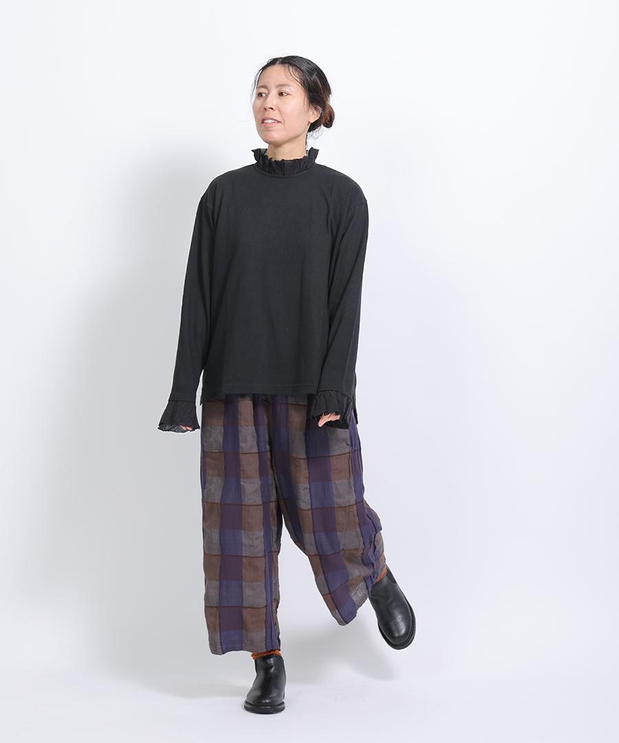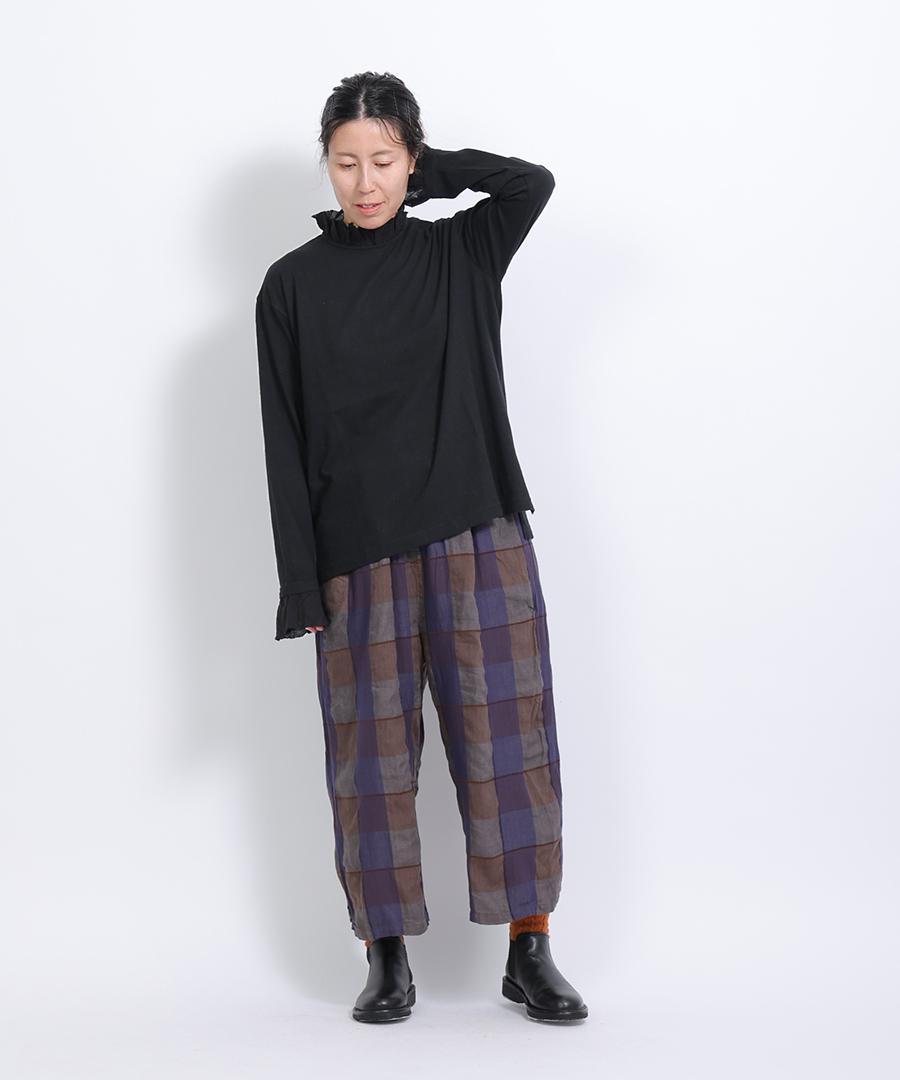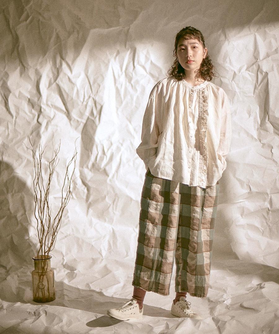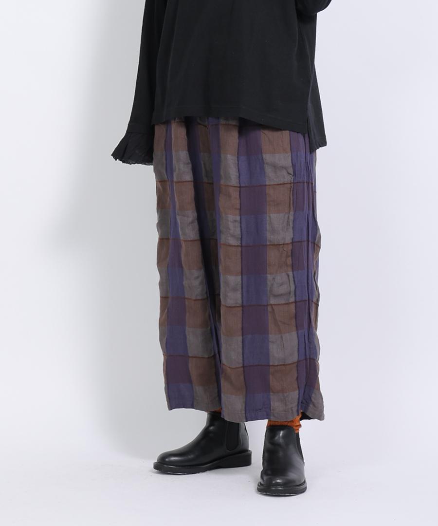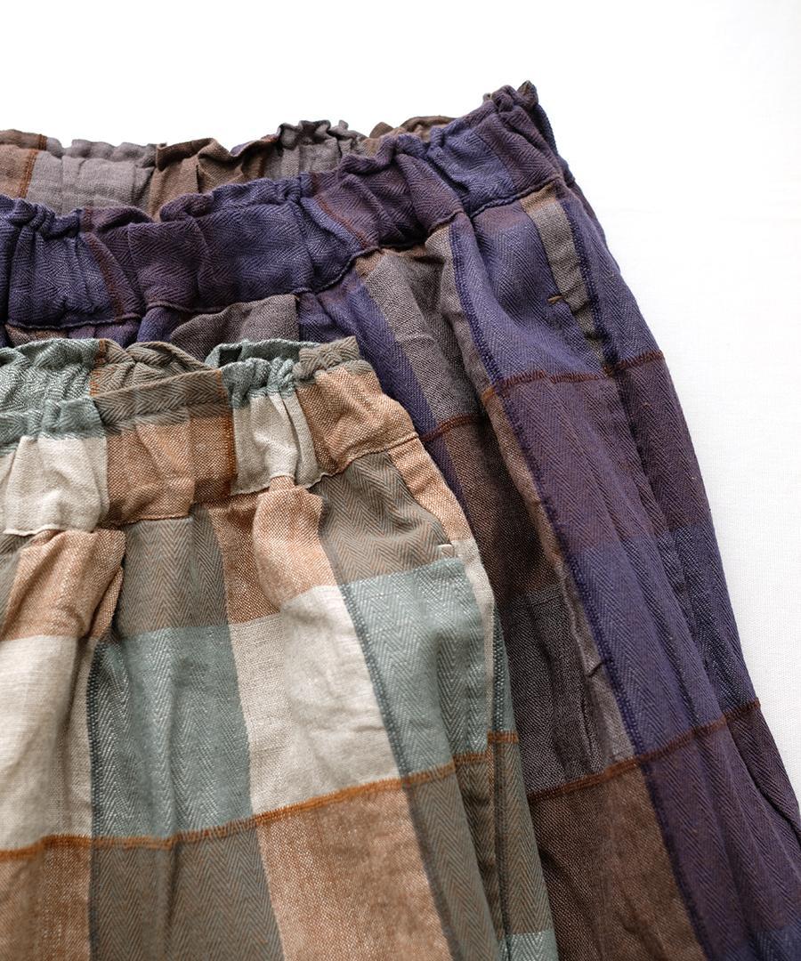 コットンとリネンのチェックにコットンモール糸を入れてポイントにしたオリジナル生地で仕立てた8分丈パンツ。