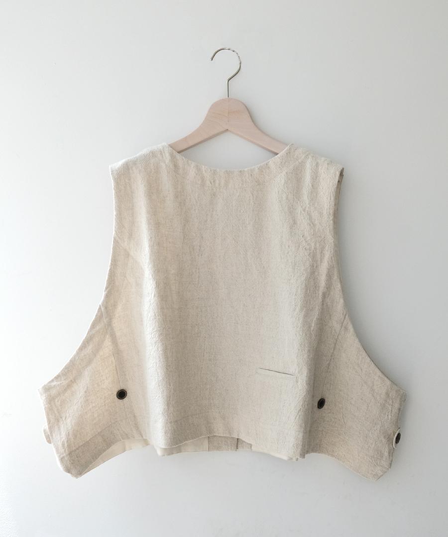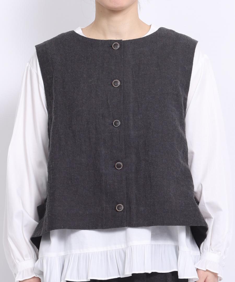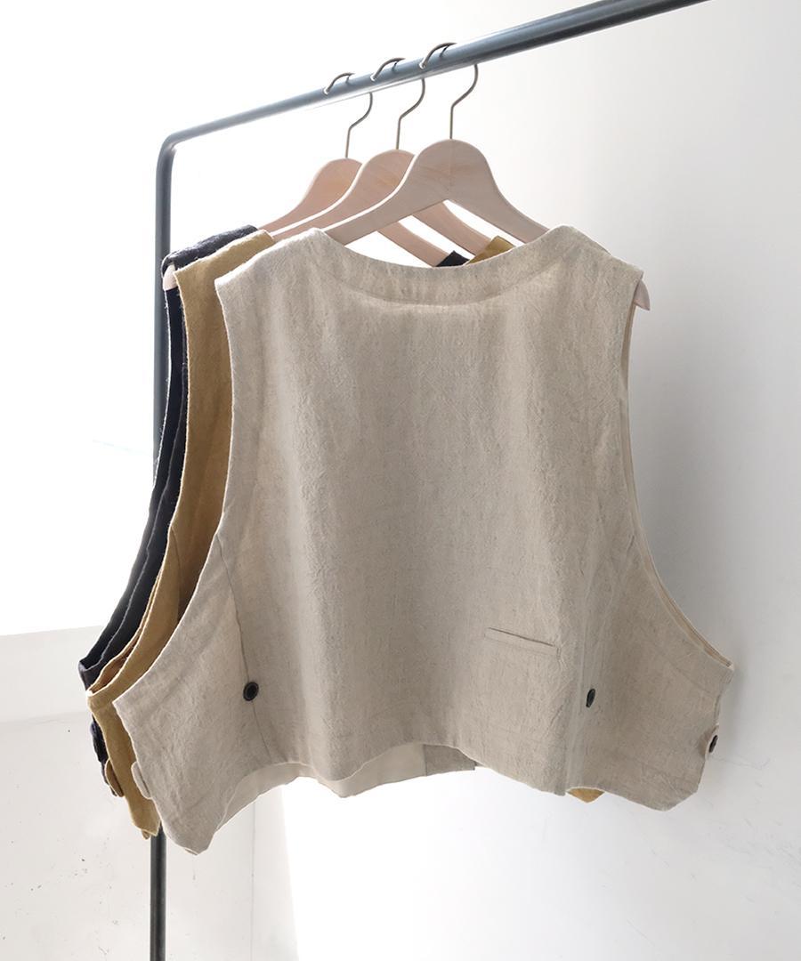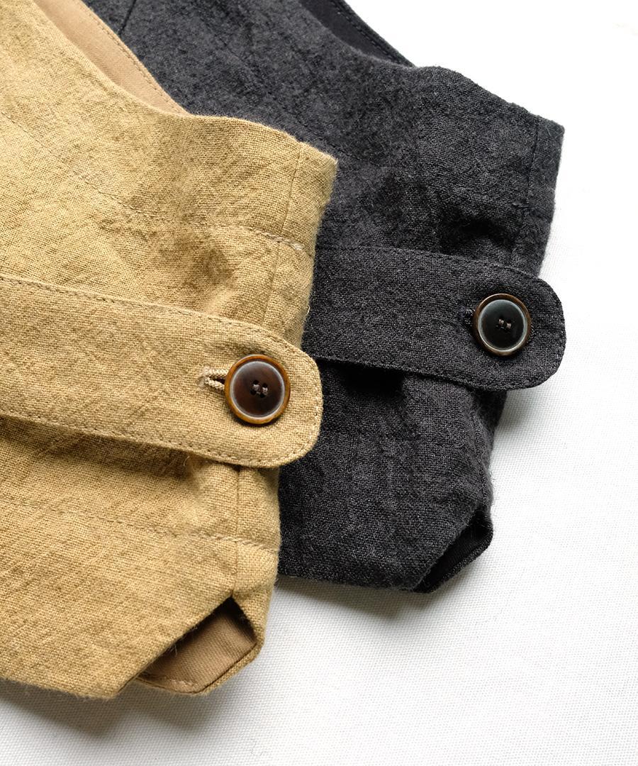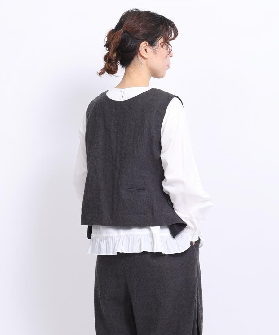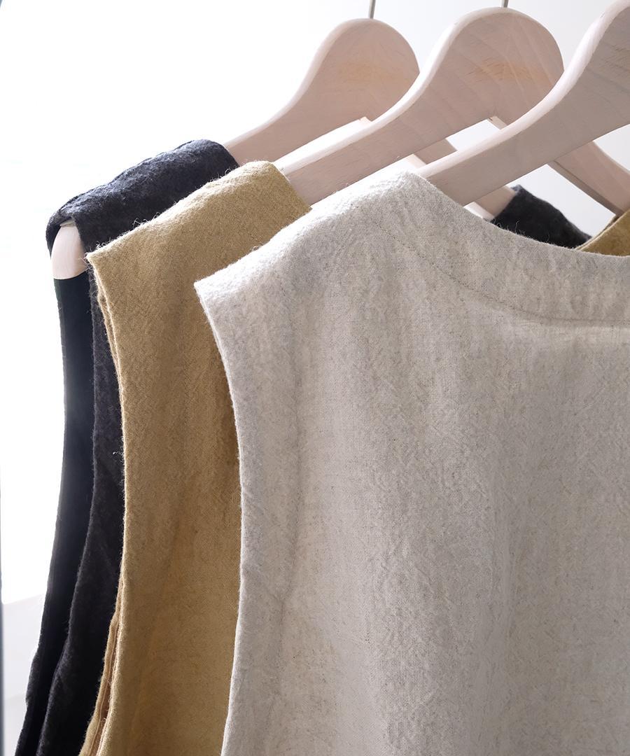 麻ウールの混紡糸を使用したウォーム感のある素材で仕立てたベスト。