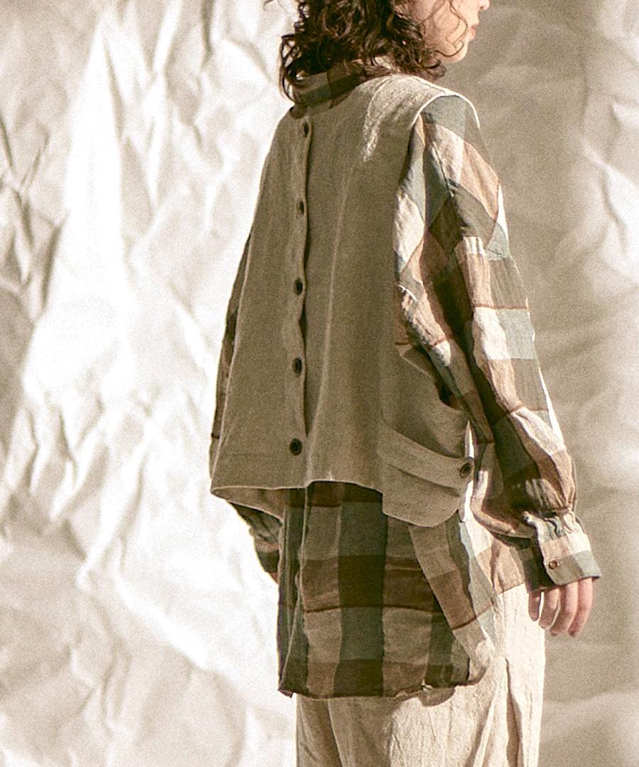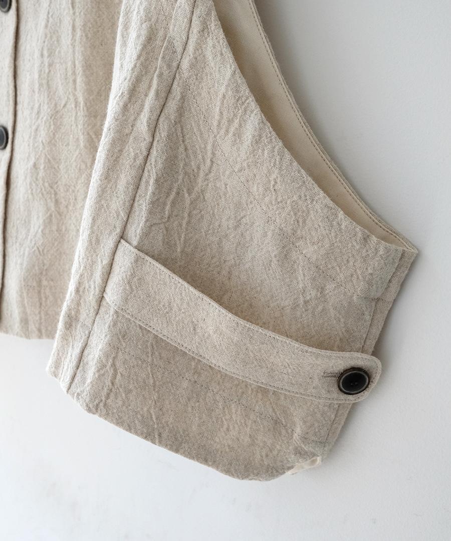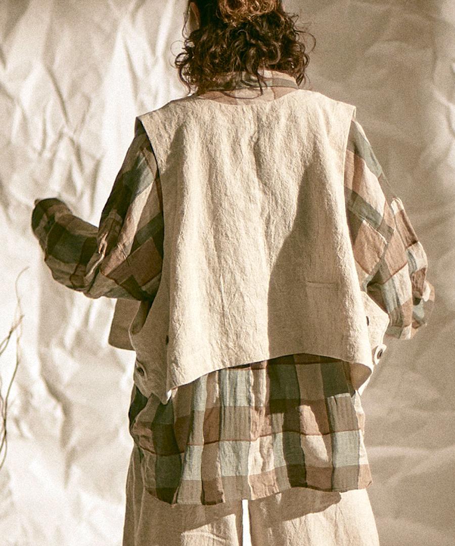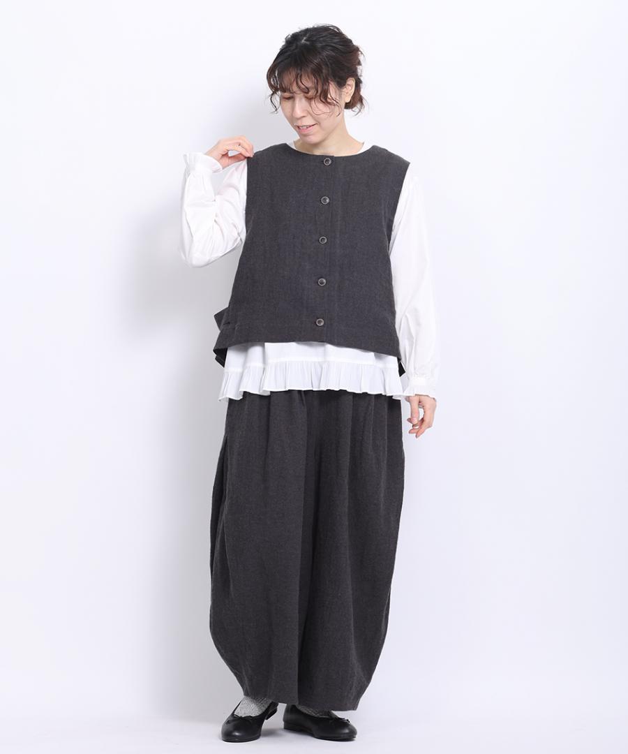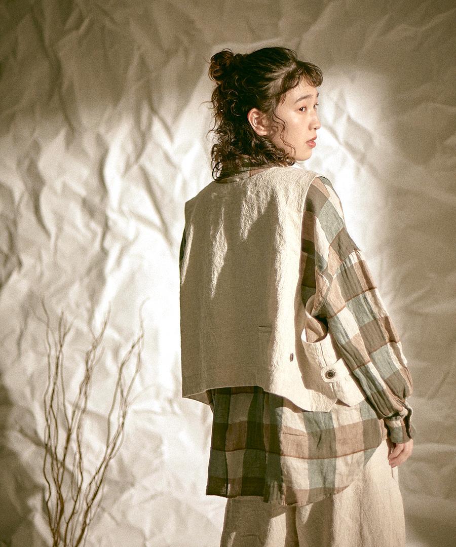 麻ウールの混紡糸を使用したウォーム感のある素材で仕立てたベスト。