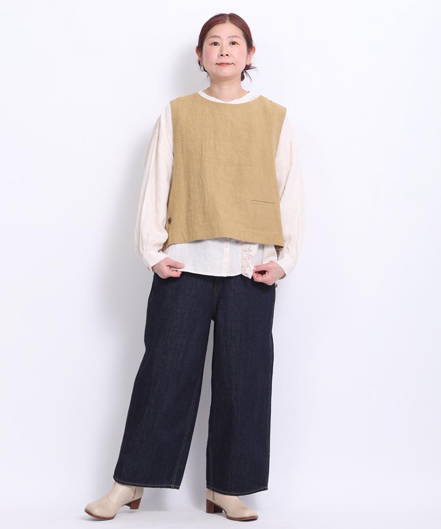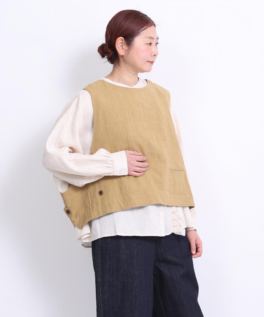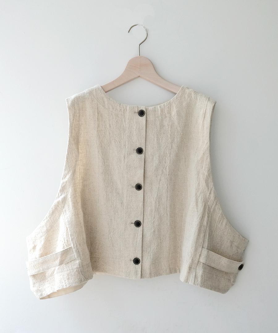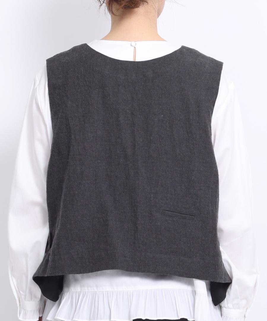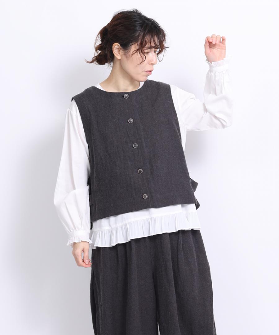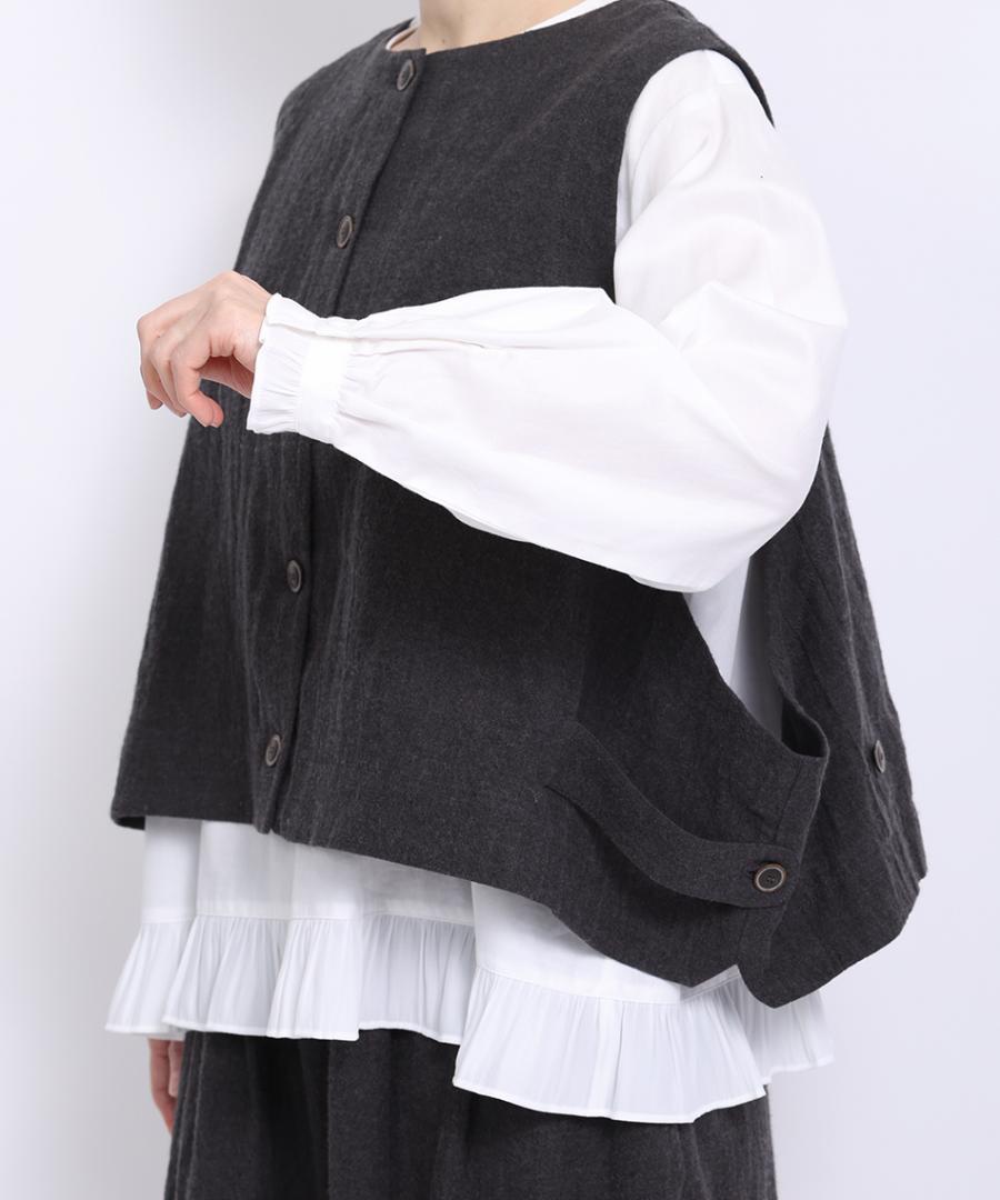 麻ウールの混紡糸を使用したウォーム感のある素材で仕立てたベスト。