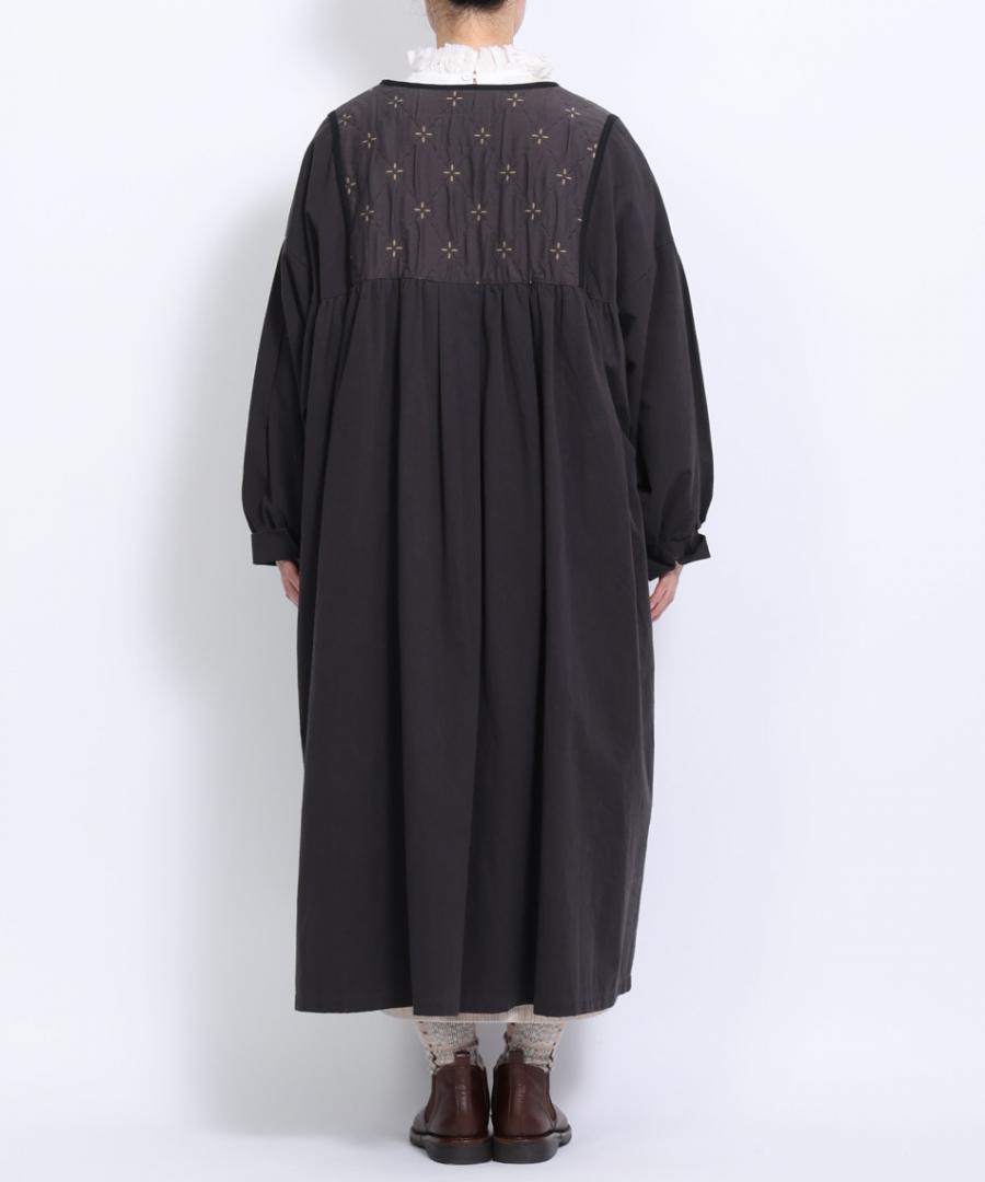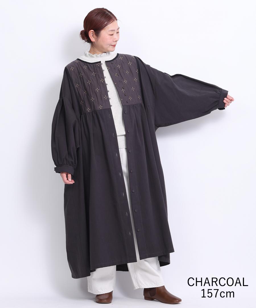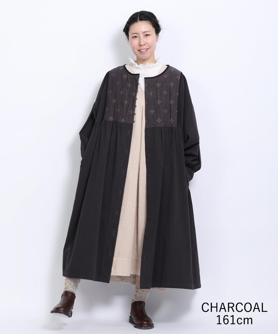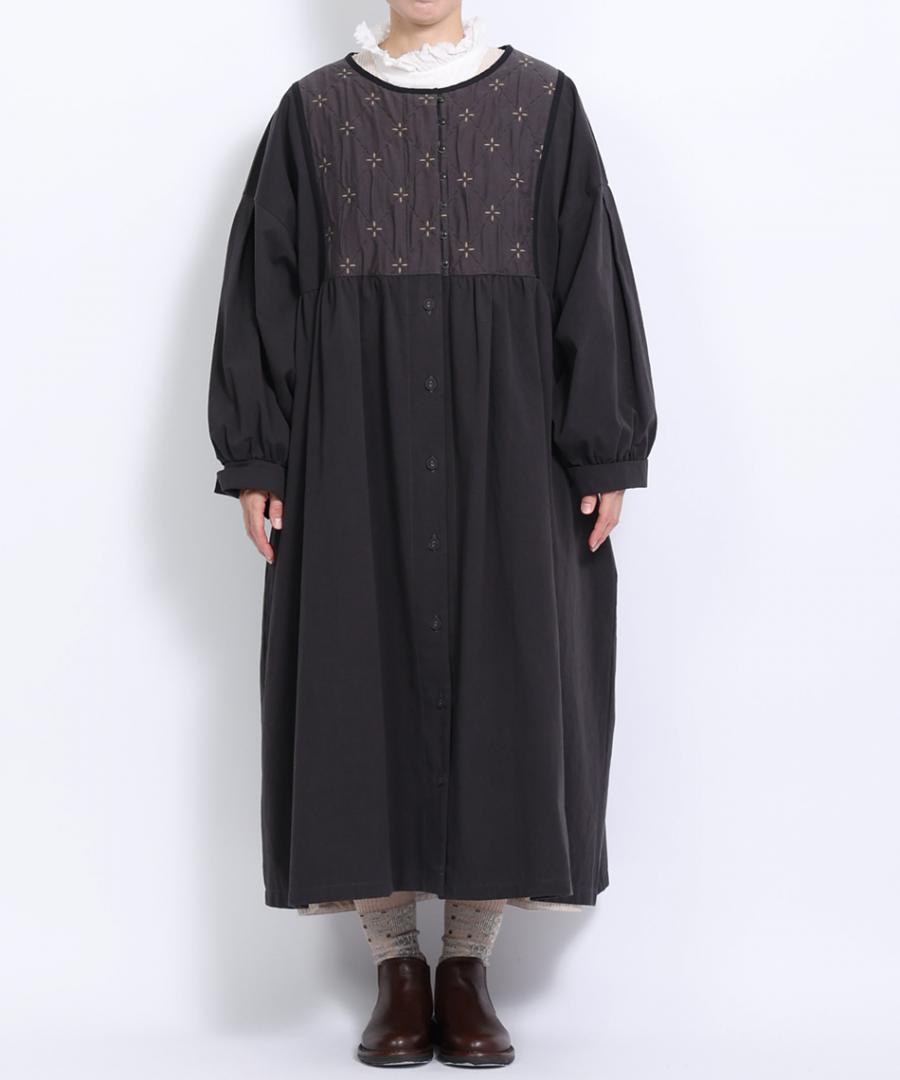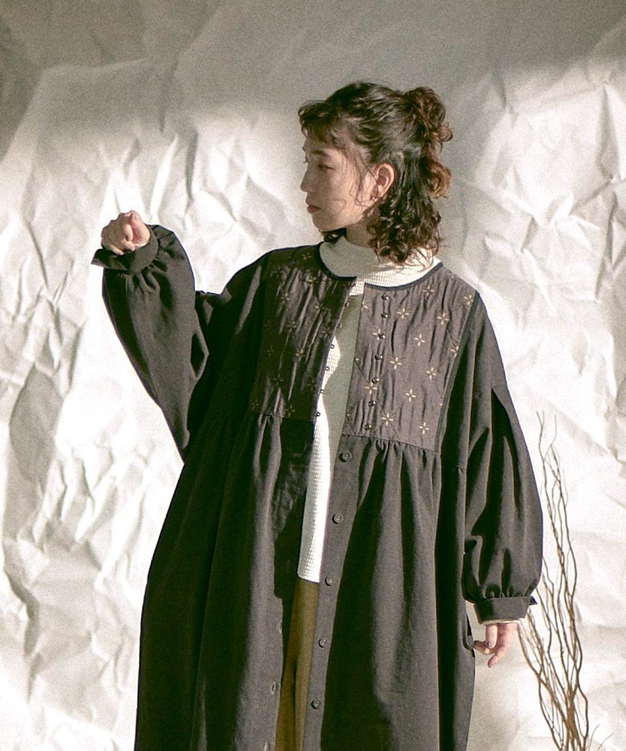 ステッチダイヤ柄と小花を組み合わせてキルトのようなジャガード素材が魅力のコートワンピース。