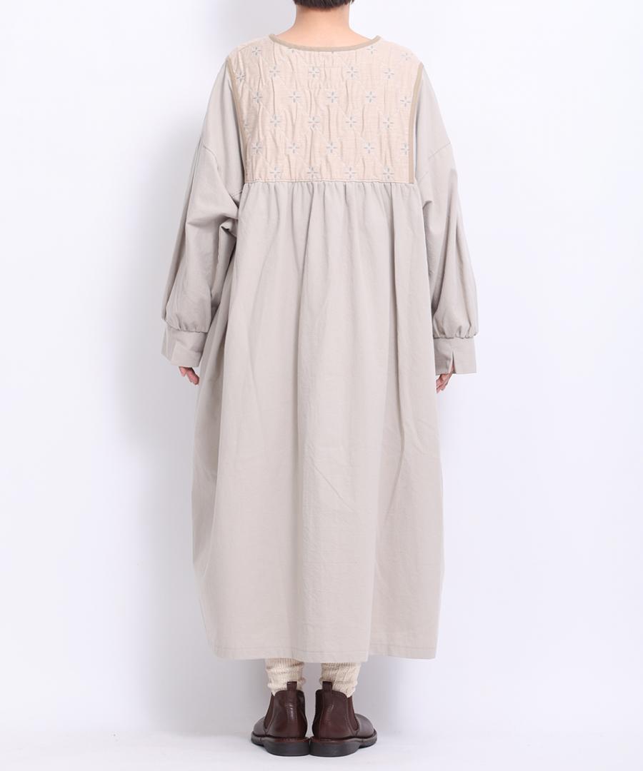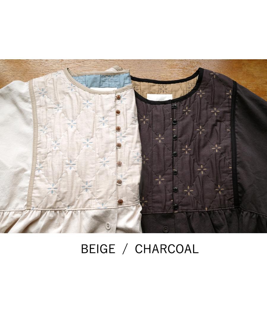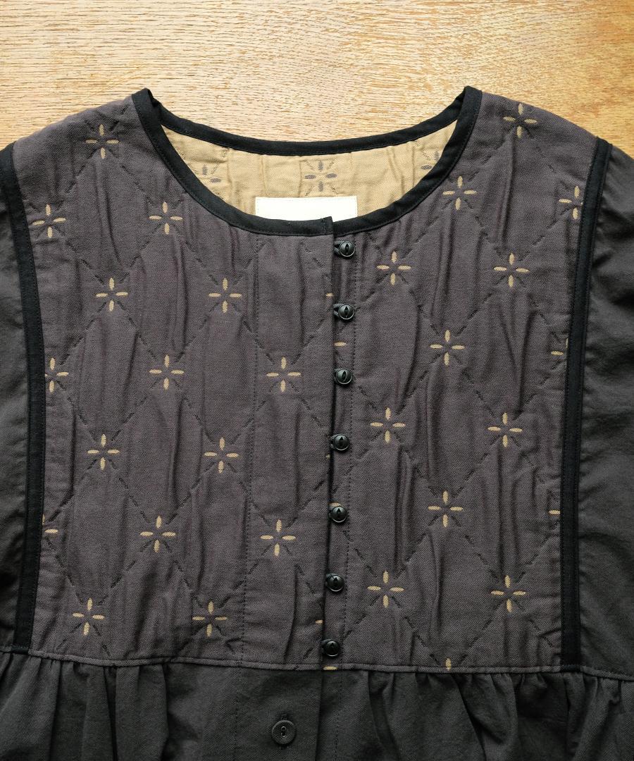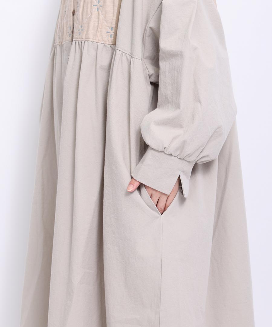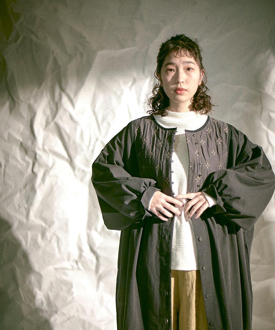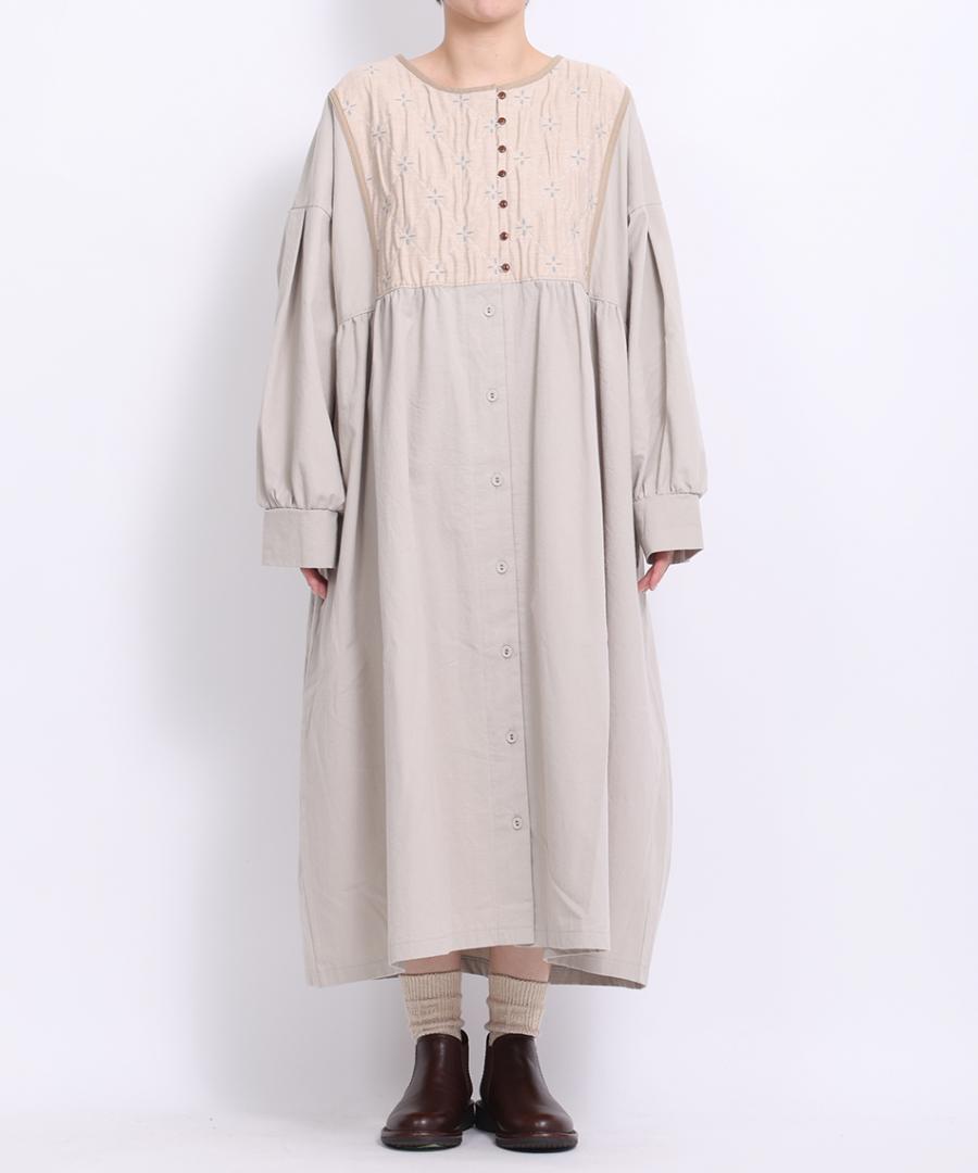 ステッチダイヤ柄と小花を組み合わせてキルトのようなジャガード素材が魅力のコートワンピース。