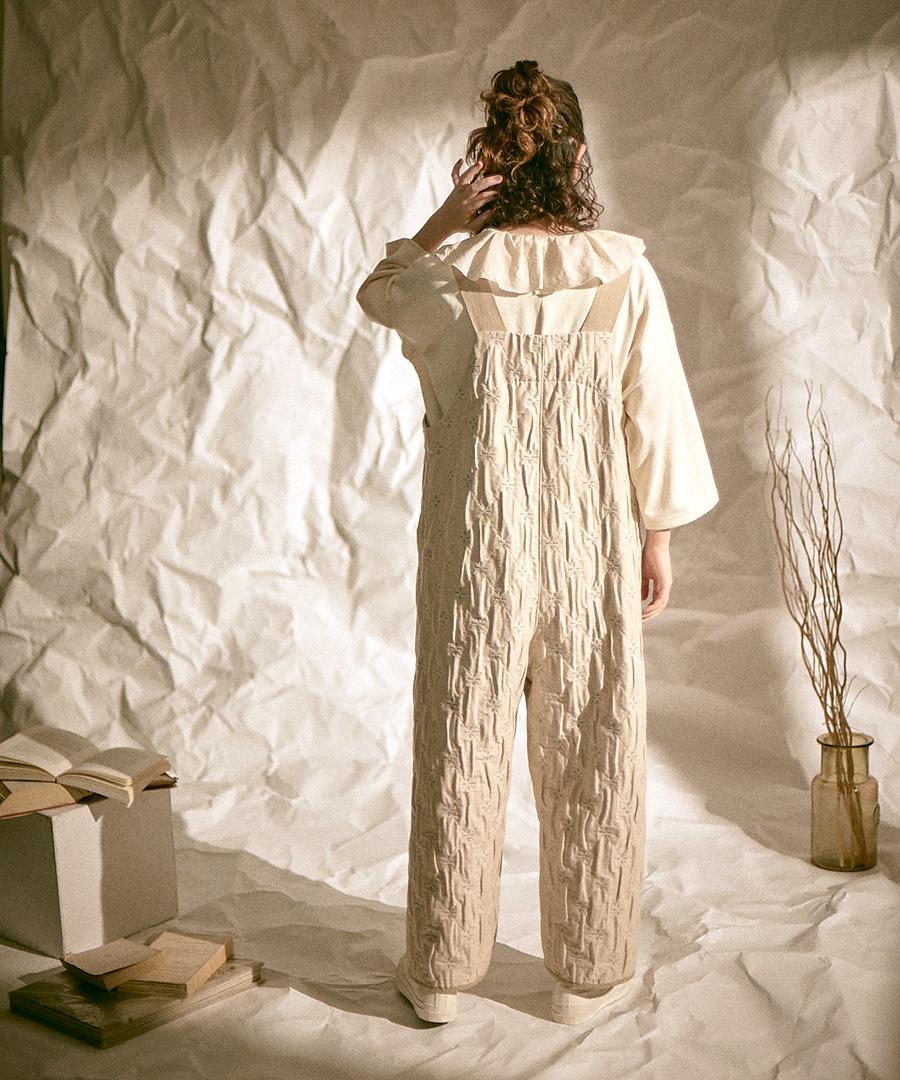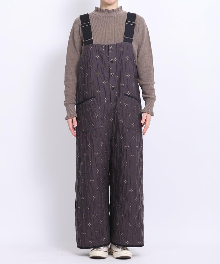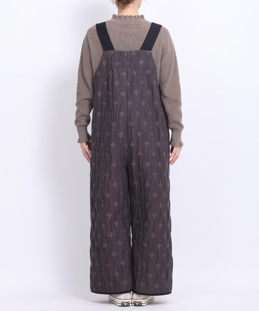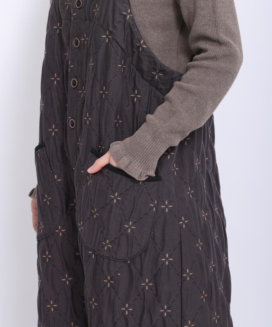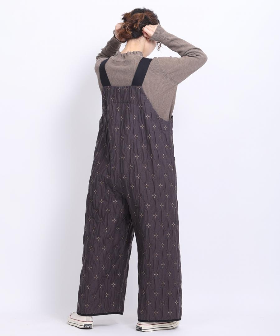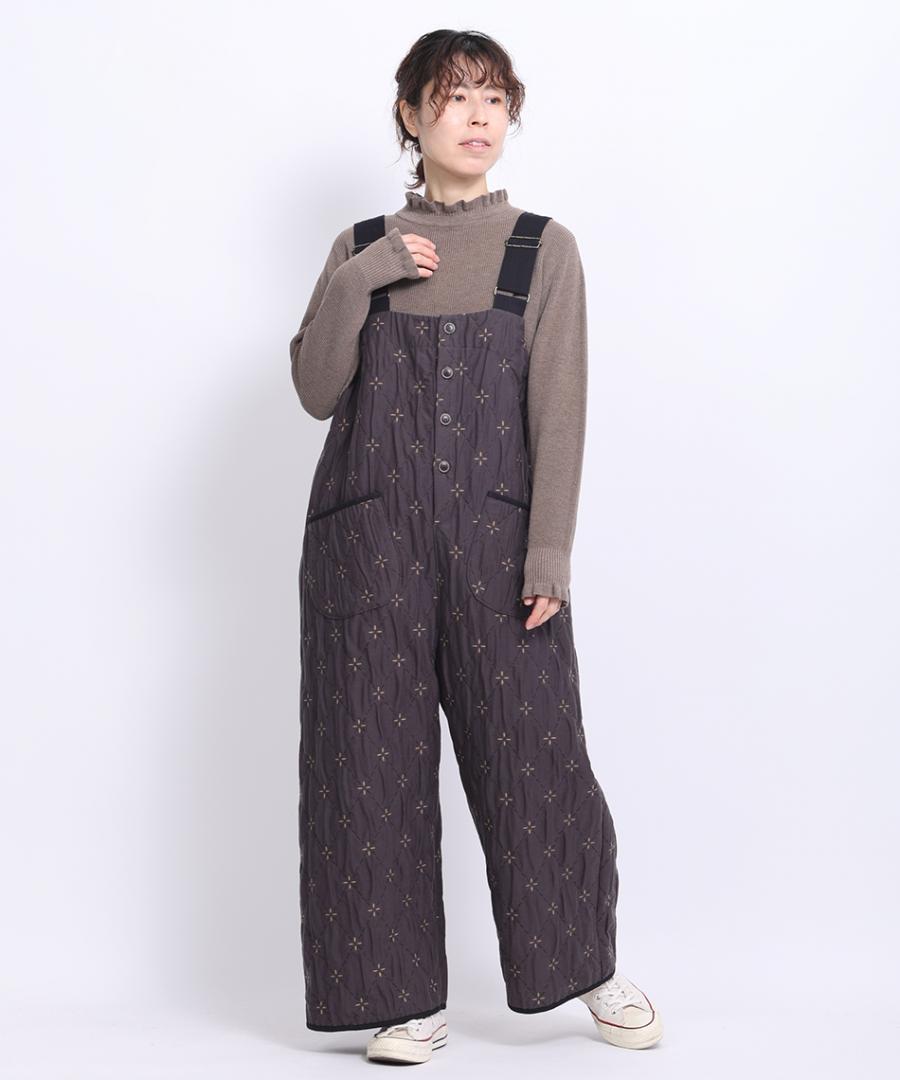 ステッチダイヤ柄と小花を組み合わせてキルトのようなジャガード素材が魅力のサロペット。