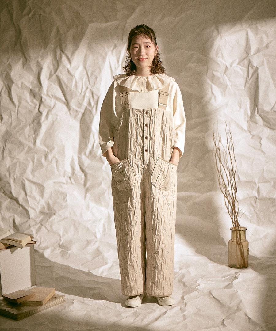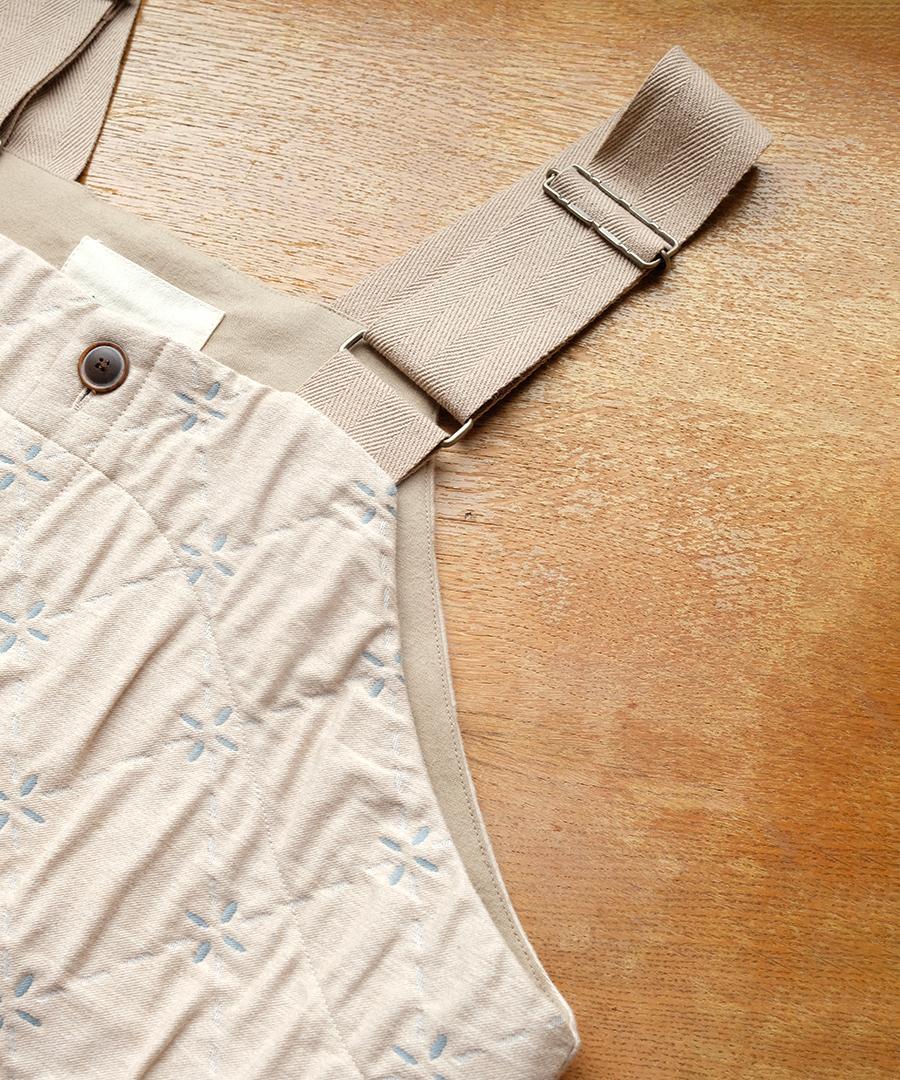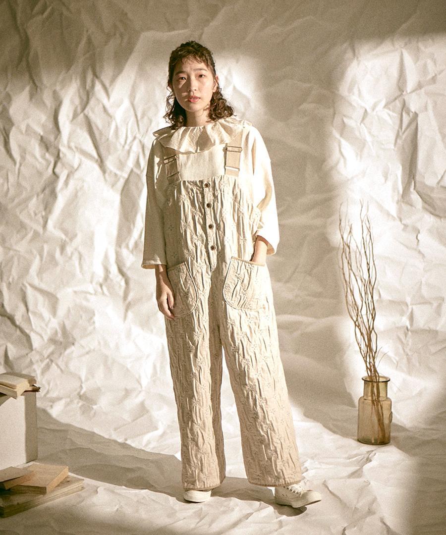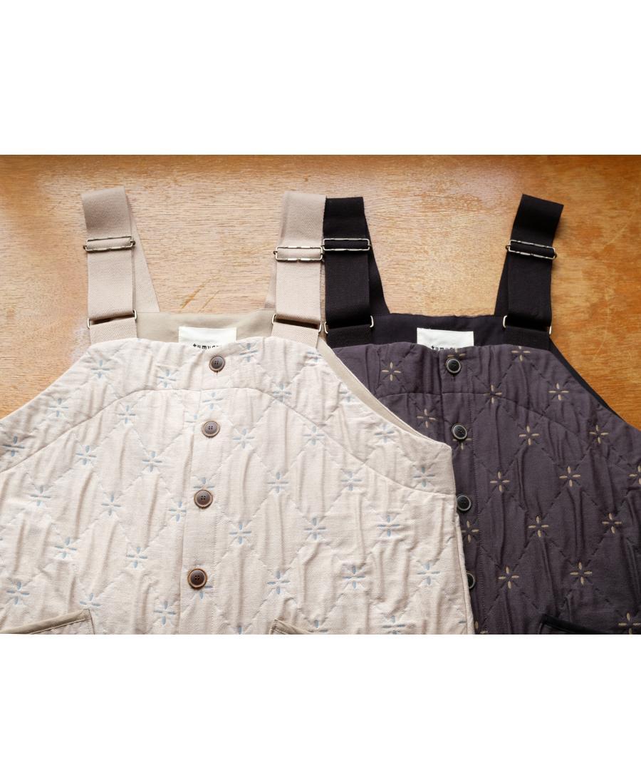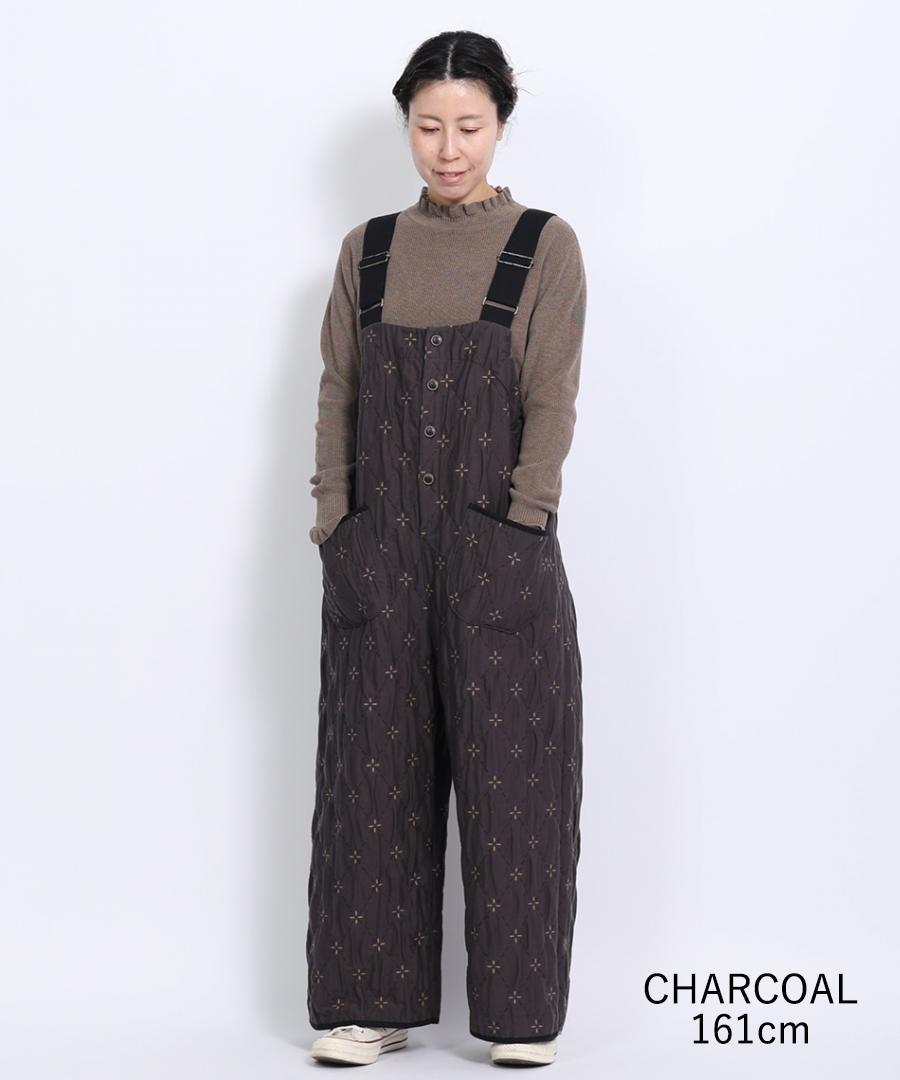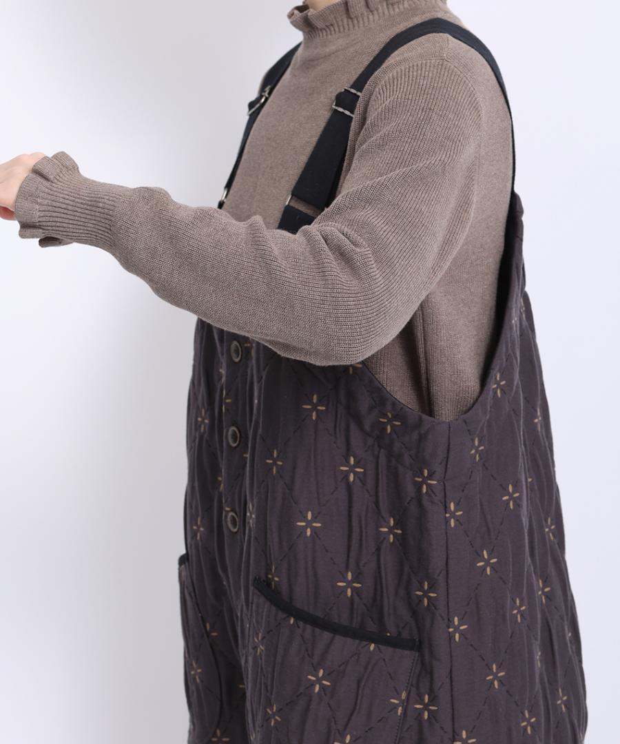 ステッチダイヤ柄と小花を組み合わせてキルトのようなジャガード素材が魅力のサロペット。