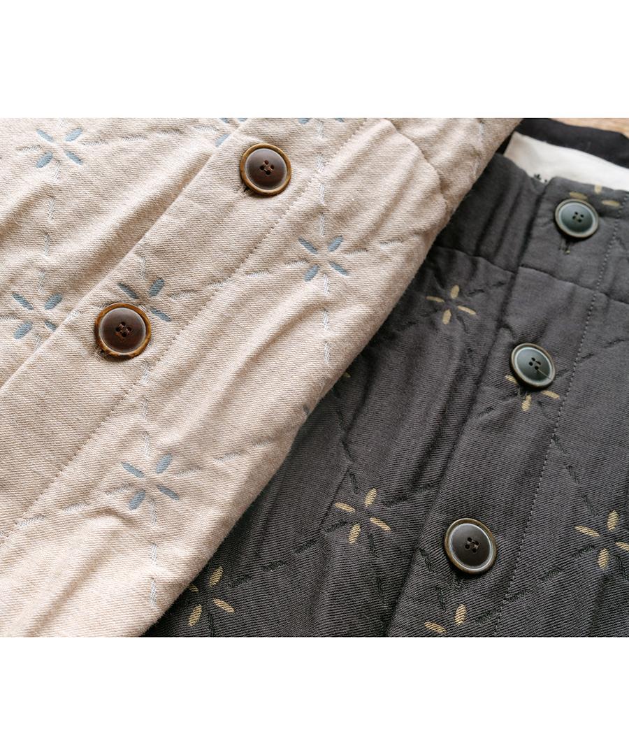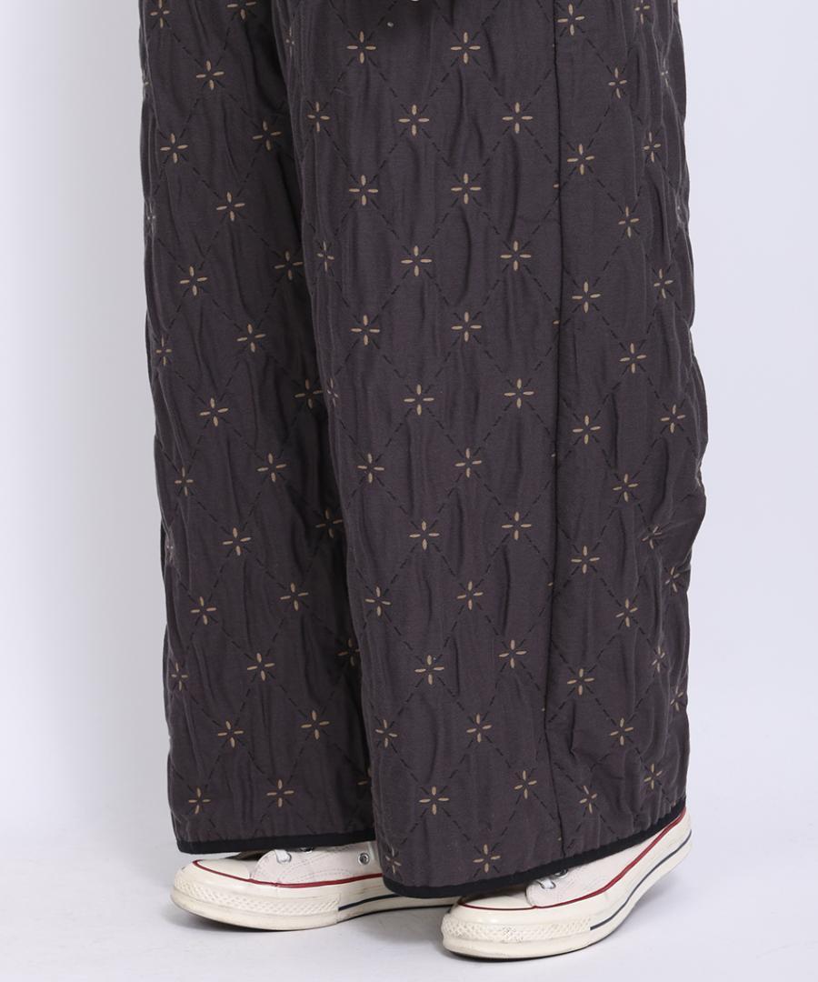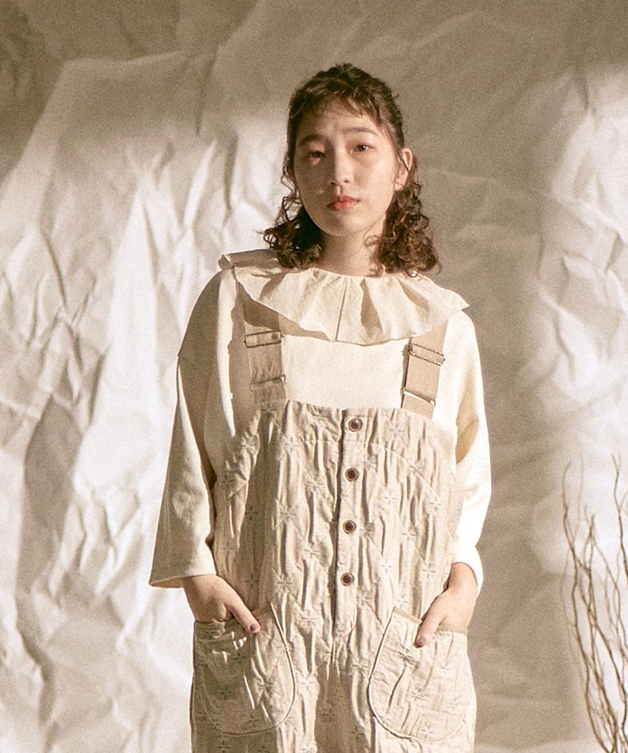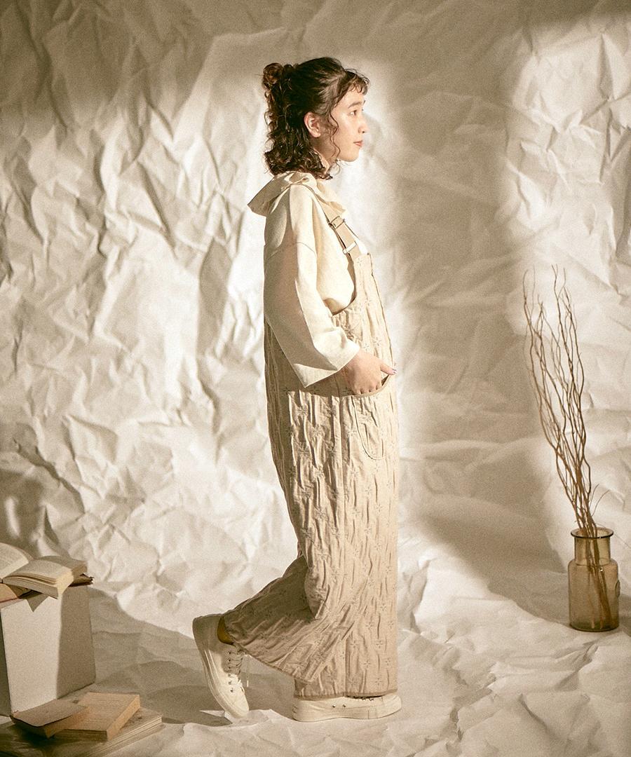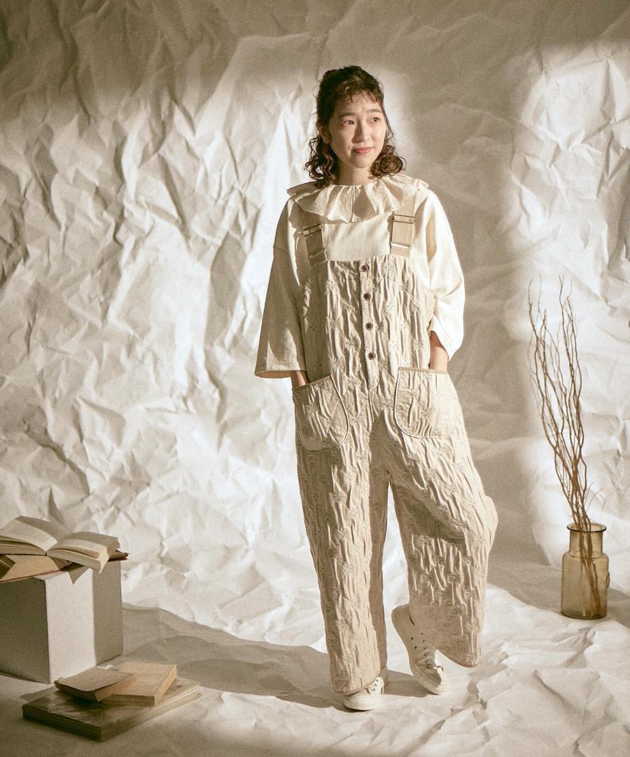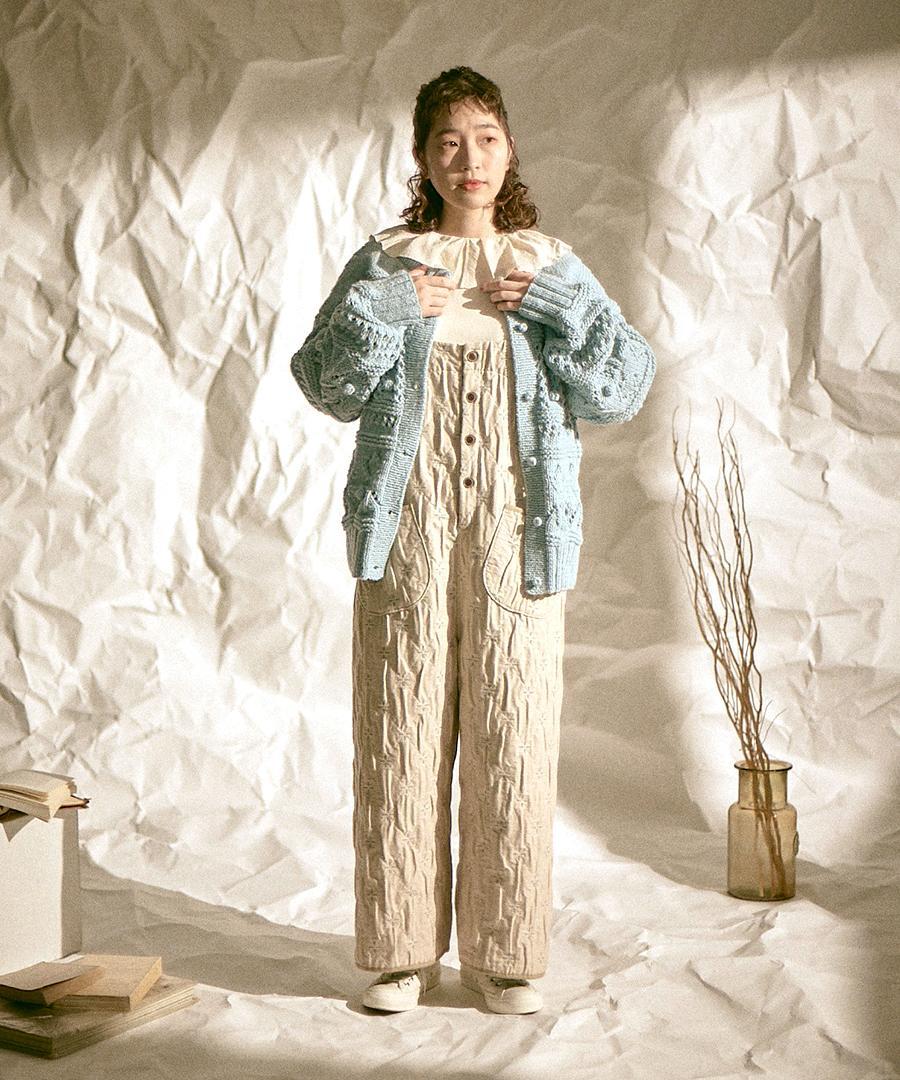 ステッチダイヤ柄と小花を組み合わせてキルトのようなジャガード素材が魅力のサロペット。