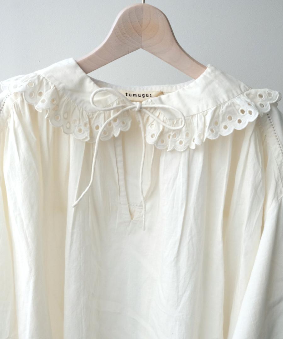 刺繍をした生地をカットし、模様で表現したカットワーク、背中部分や袖口に施した細やかなピンタック、同素材のくるみ釦など、隅々までtumugu:のこだわりが感じられるシリーズです。