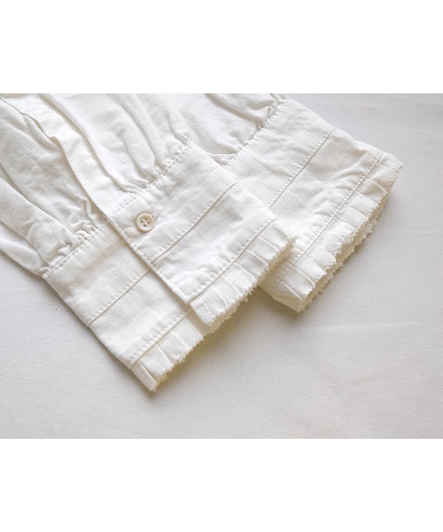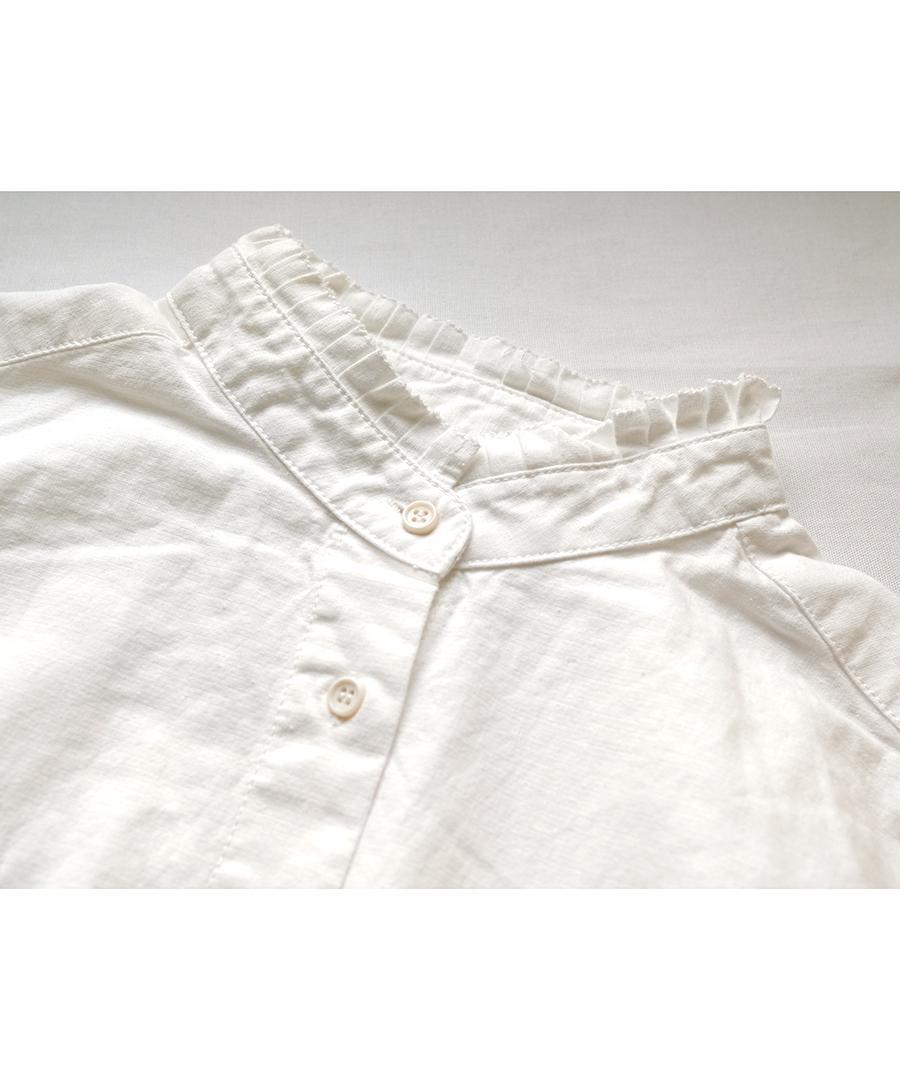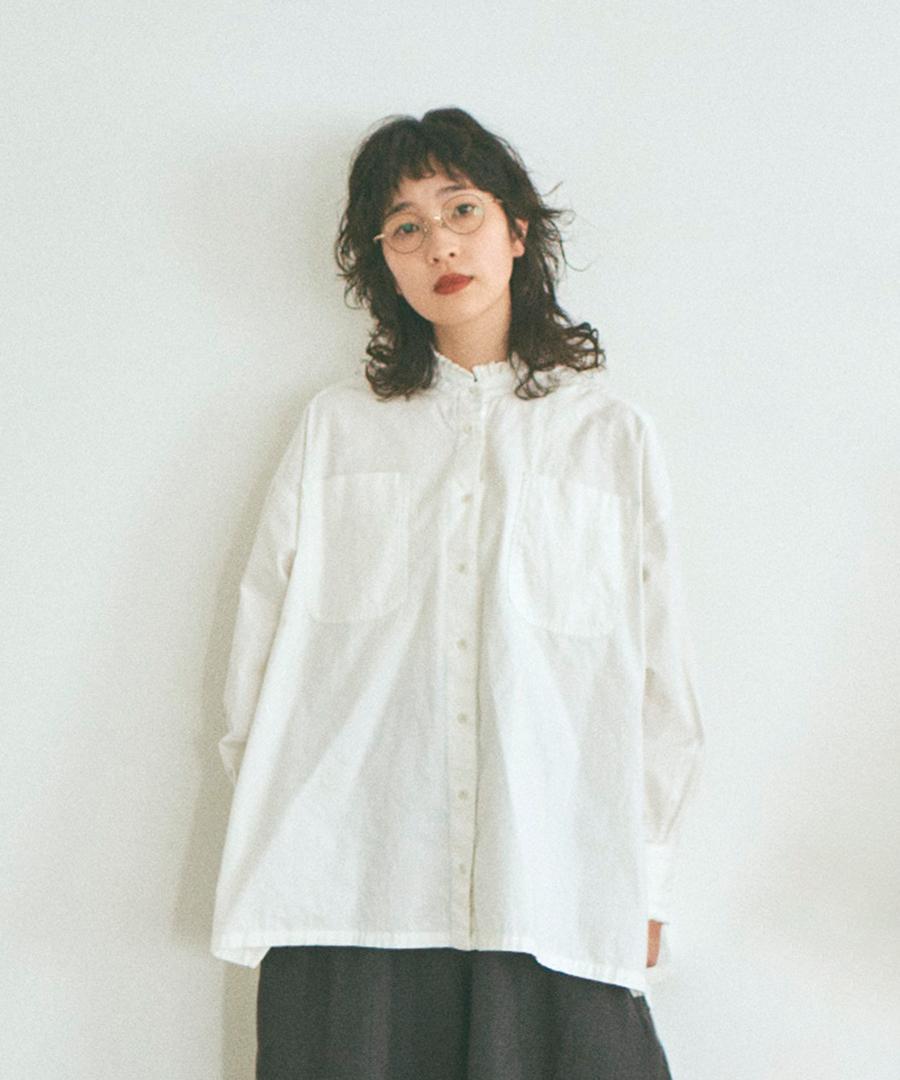 スタンドカラーと袖口にフリルがあしらわれており、シンプルな中にもフェミニンなアクセントをプラスしました。