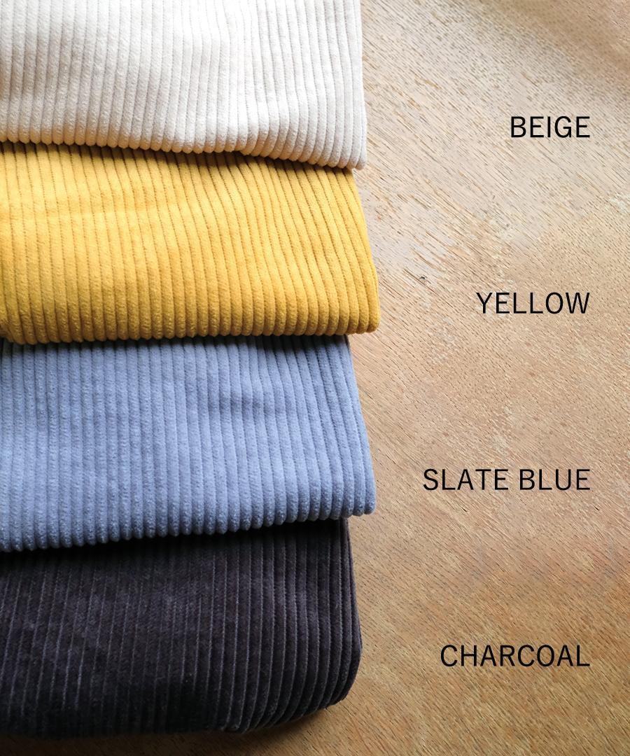 コットンの太畝のコーデュロイ生地を製品染め加工して柔らかく仕上げました。