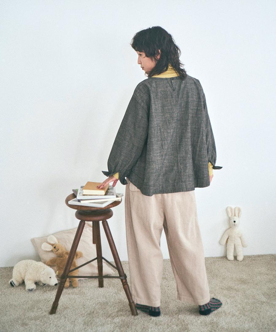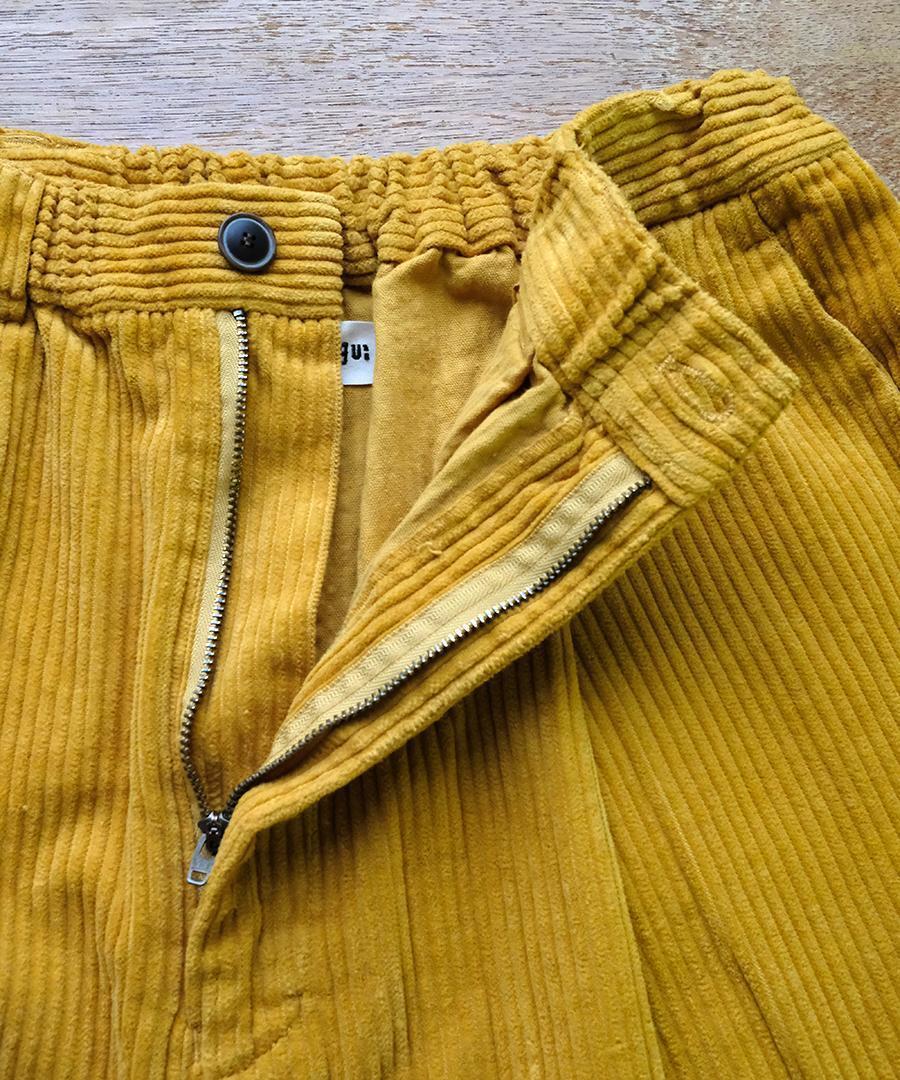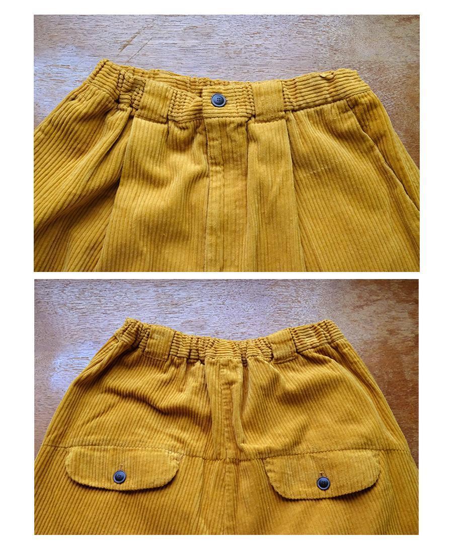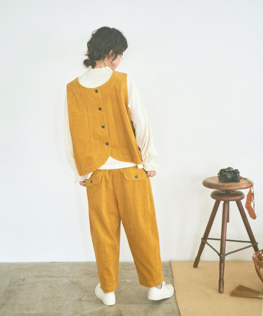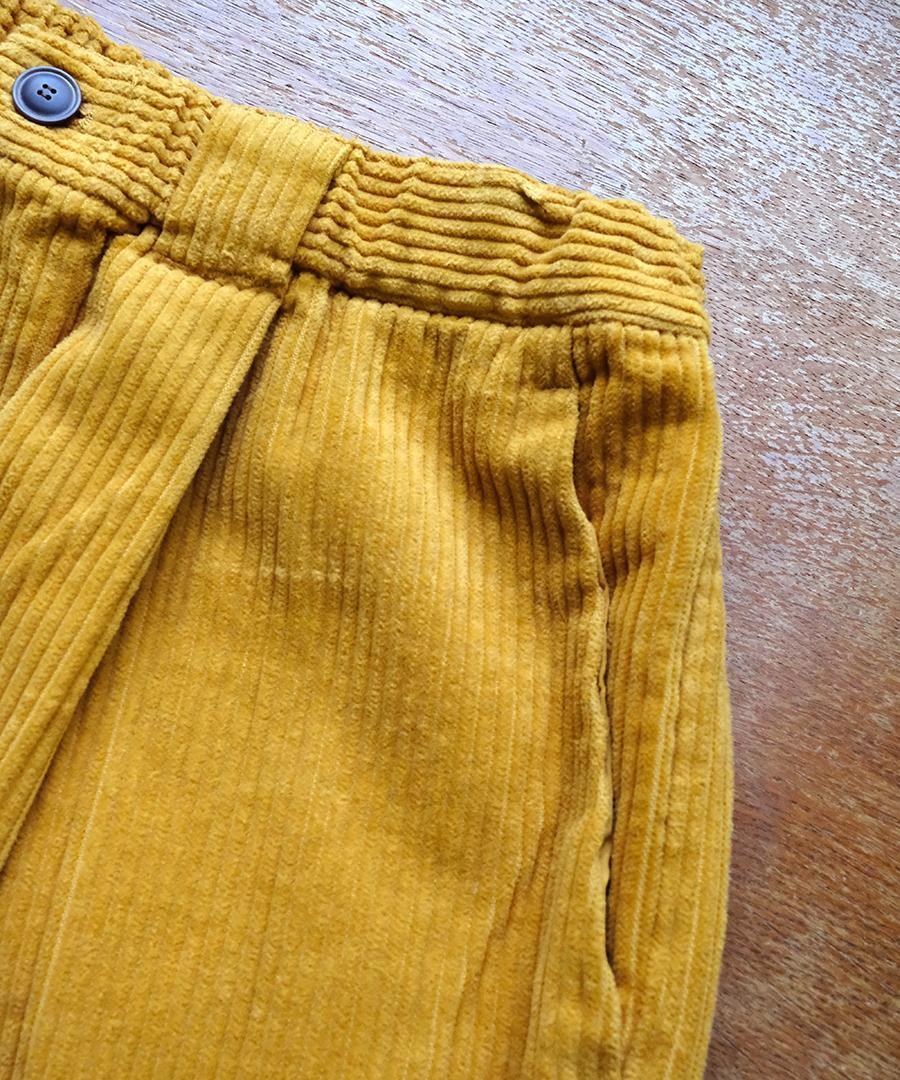 コットンの太畝のコーデュロイ生地を製品染め加工して柔らかく仕上げました。