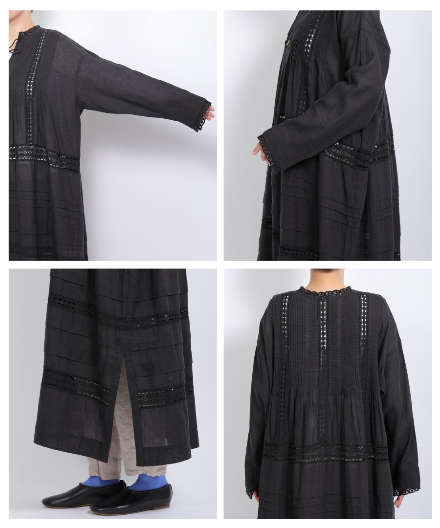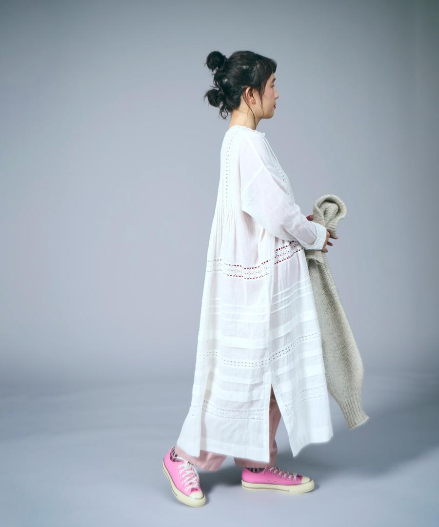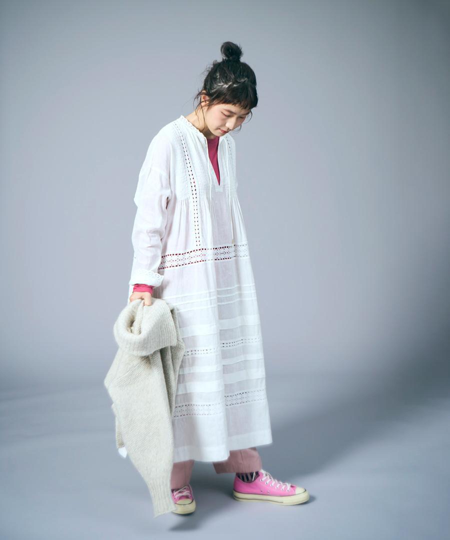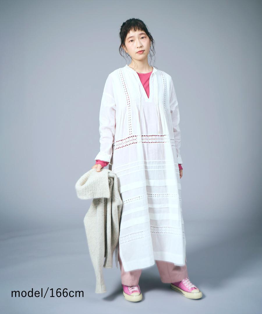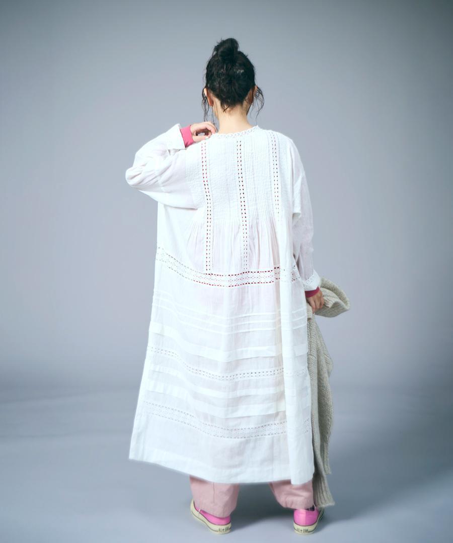 インドならではのレースやピンタック使いが贅沢な、アンティークな雰囲気のワンピース。