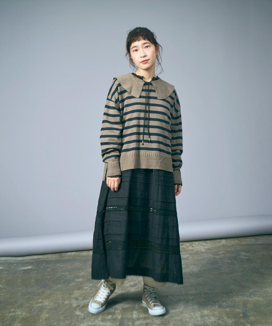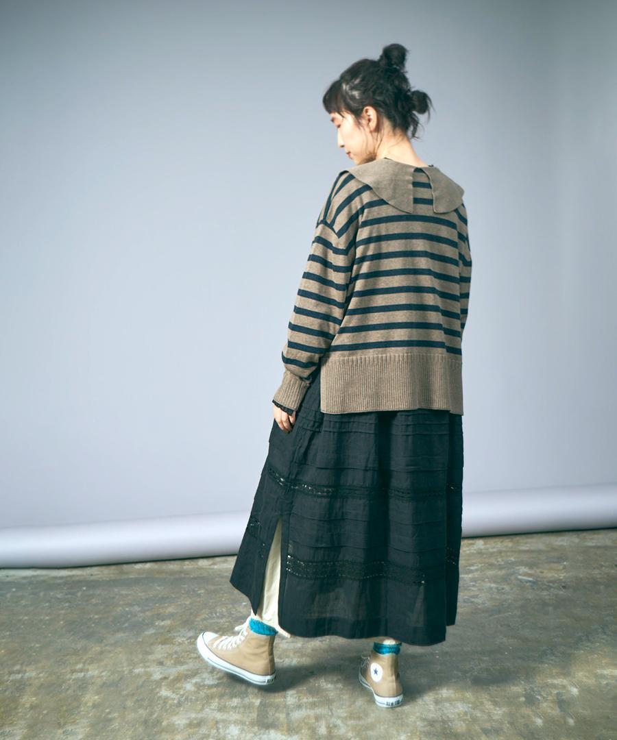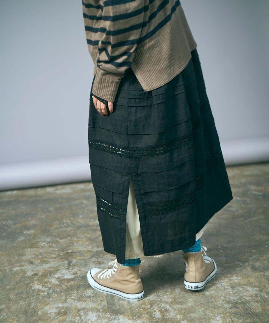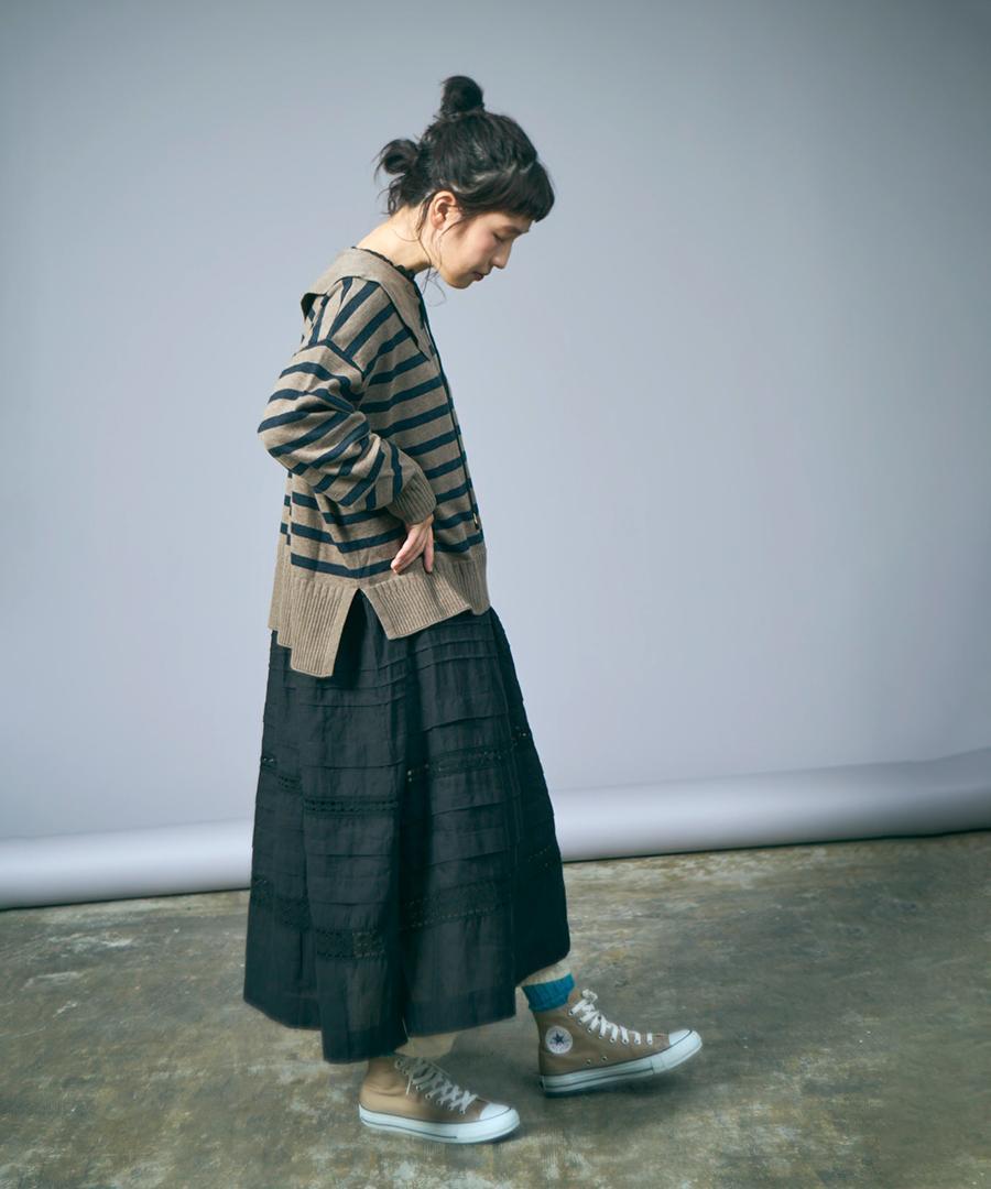 ゆったりとしたボリュームシルエットで、さりげなくカラダのラインをカバーしつつ、裾の両サイドのスリットで動きやすさもプラス。