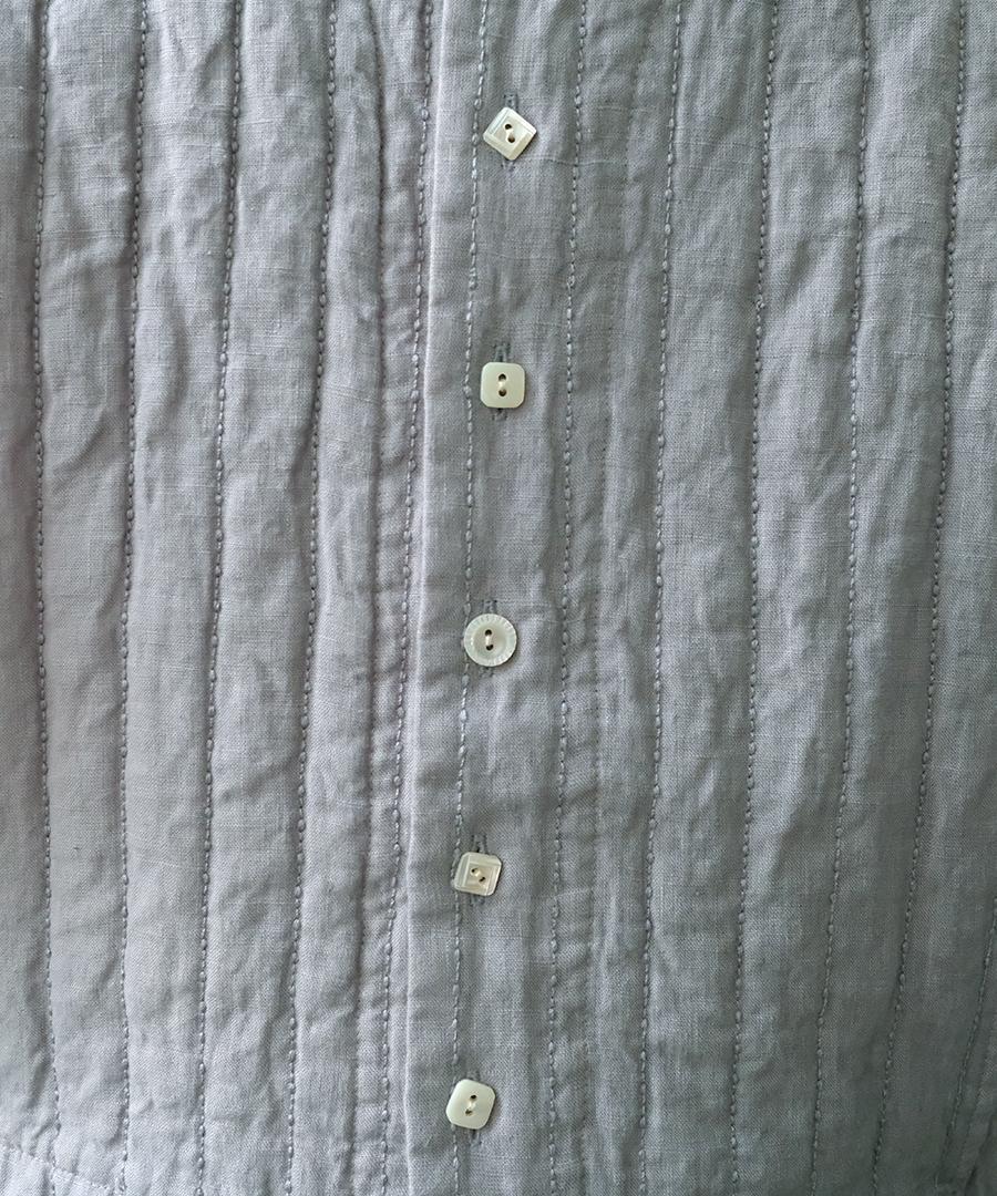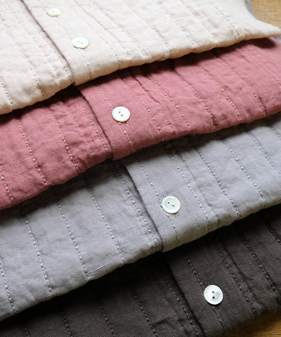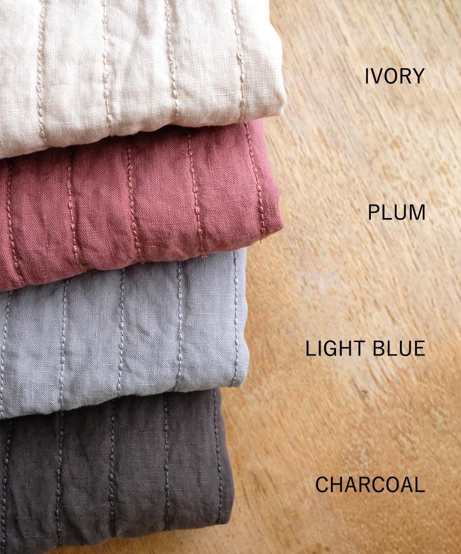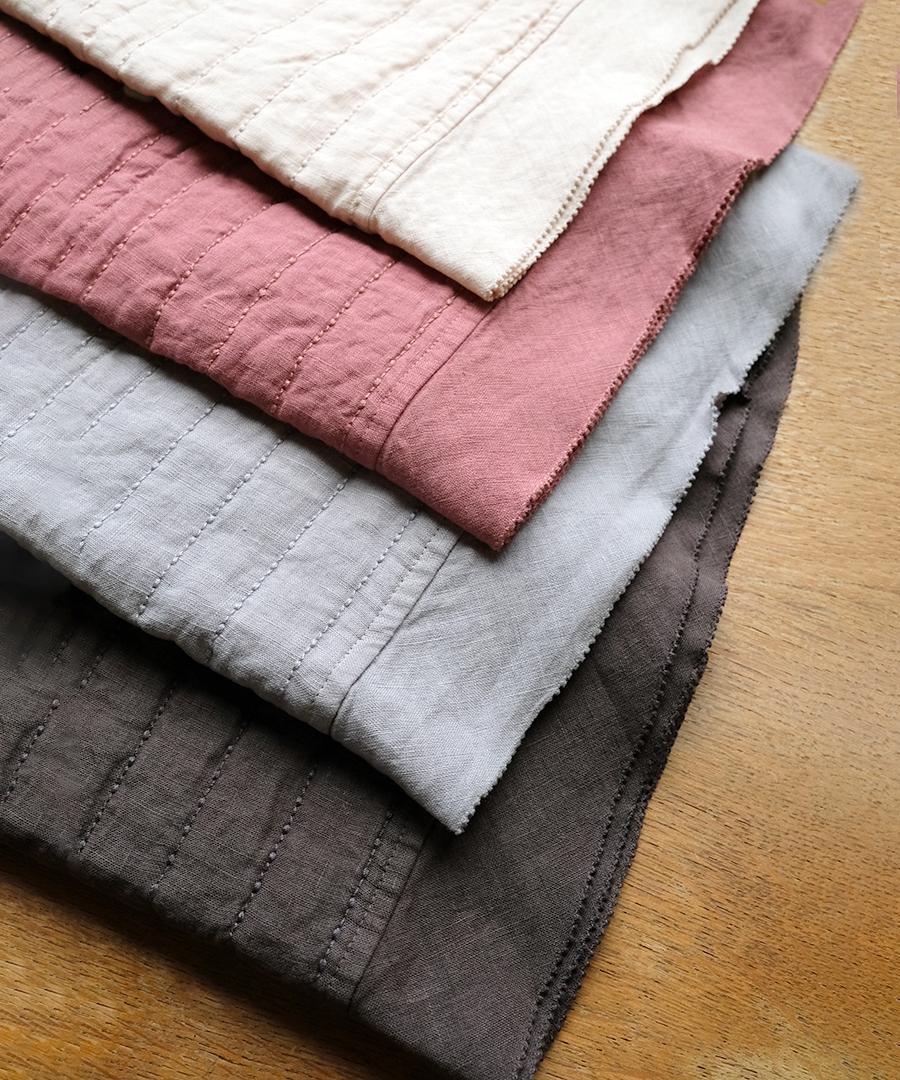 リネン生地に特殊ミシンでストライプ柄のステッチ刺繍を施しました。