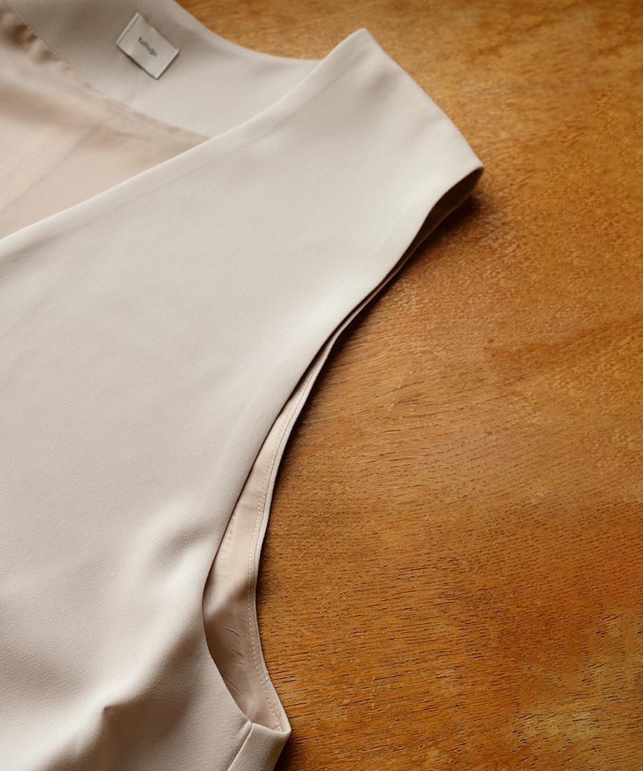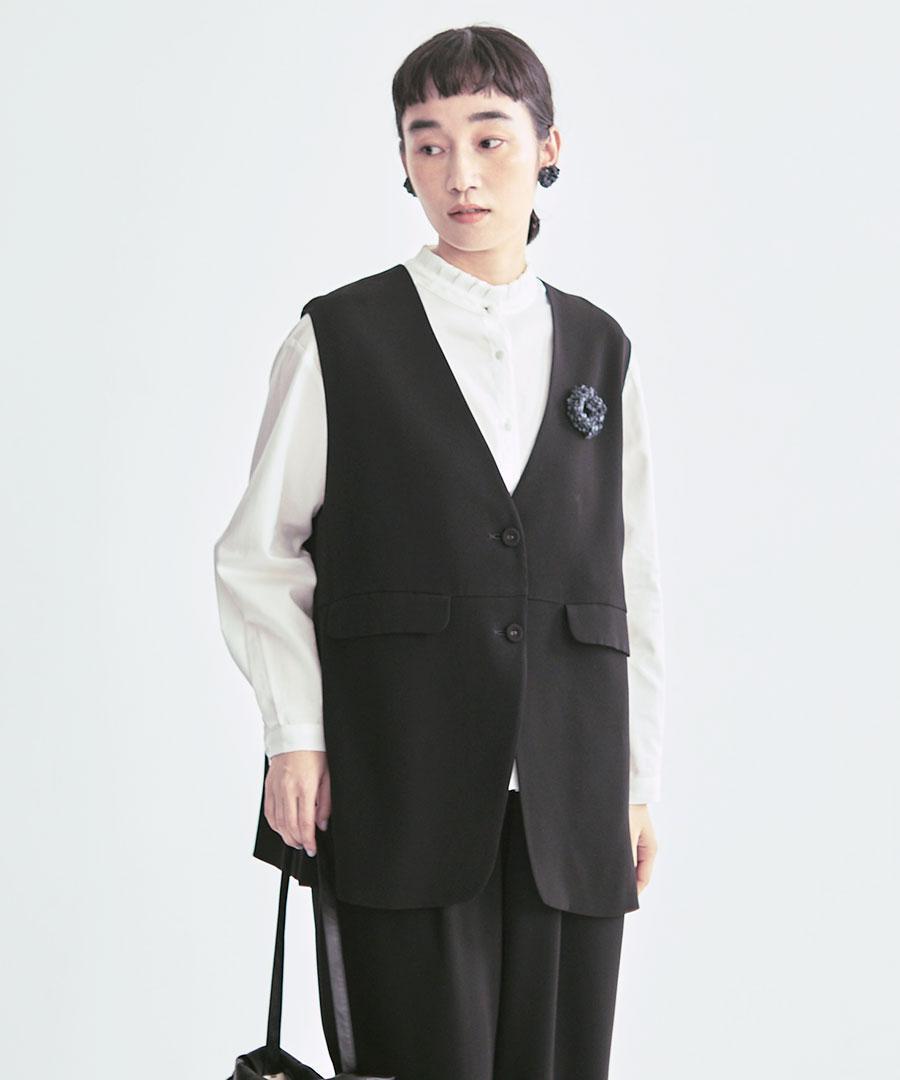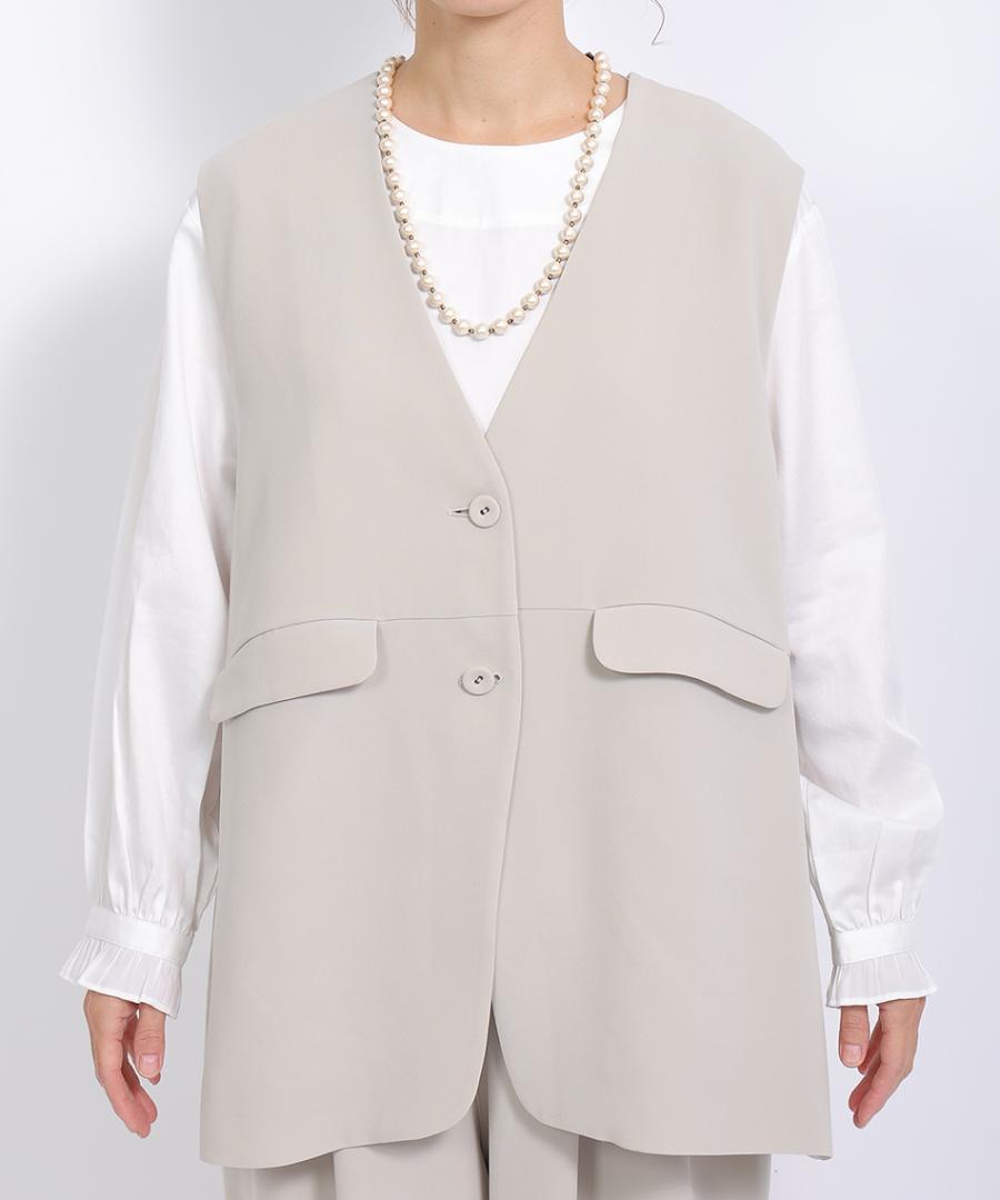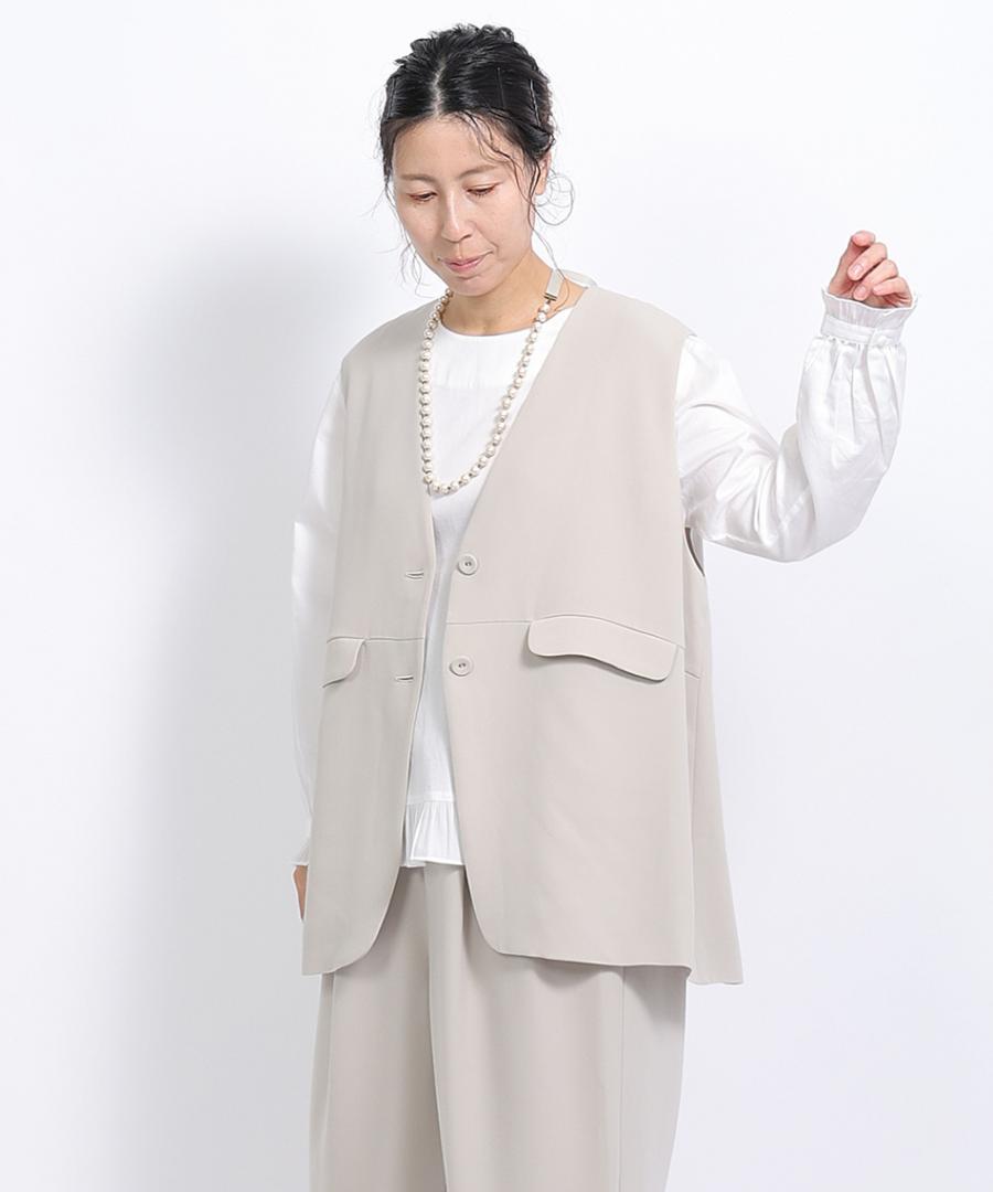 トリアセテート特有のドレープ感にパウダリー感とふくらみを兼ね備えた、上品な質感のベストジャケット。
