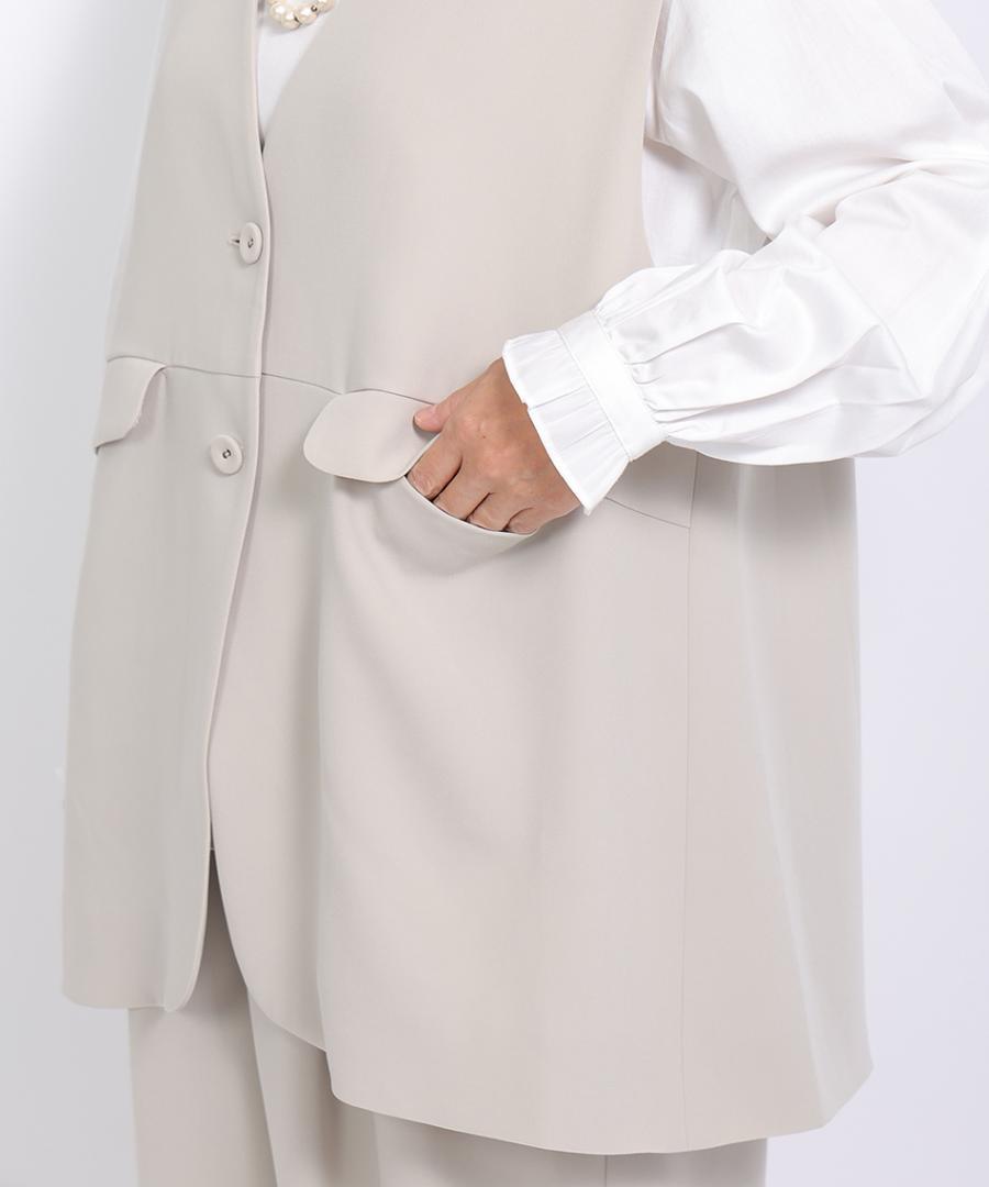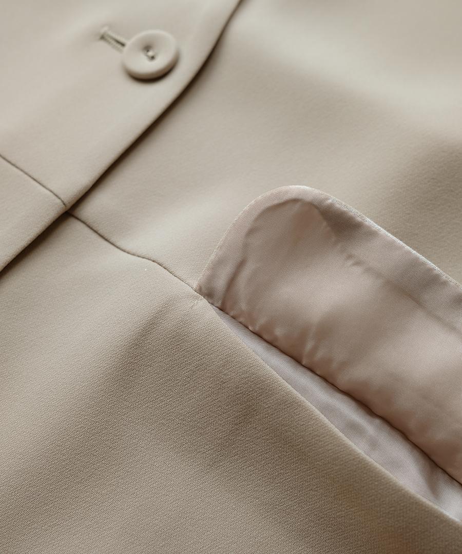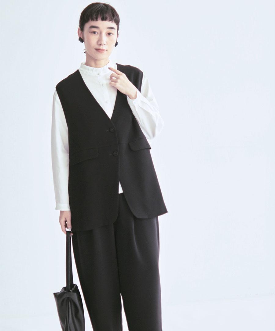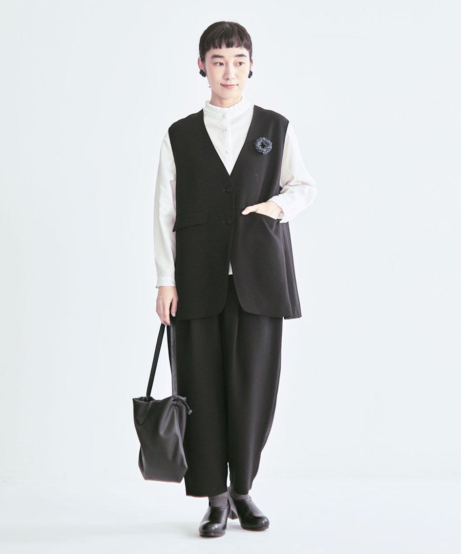 トリアセテート特有のドレープ感にパウダリー感とふくらみを兼ね備えた、上品な質感のベストジャケット。