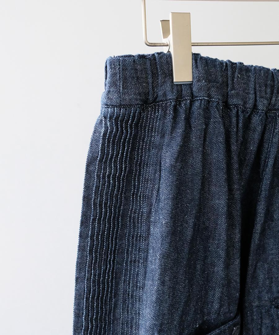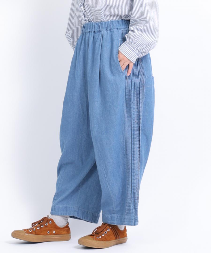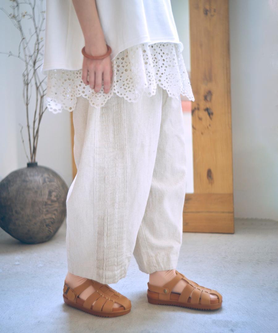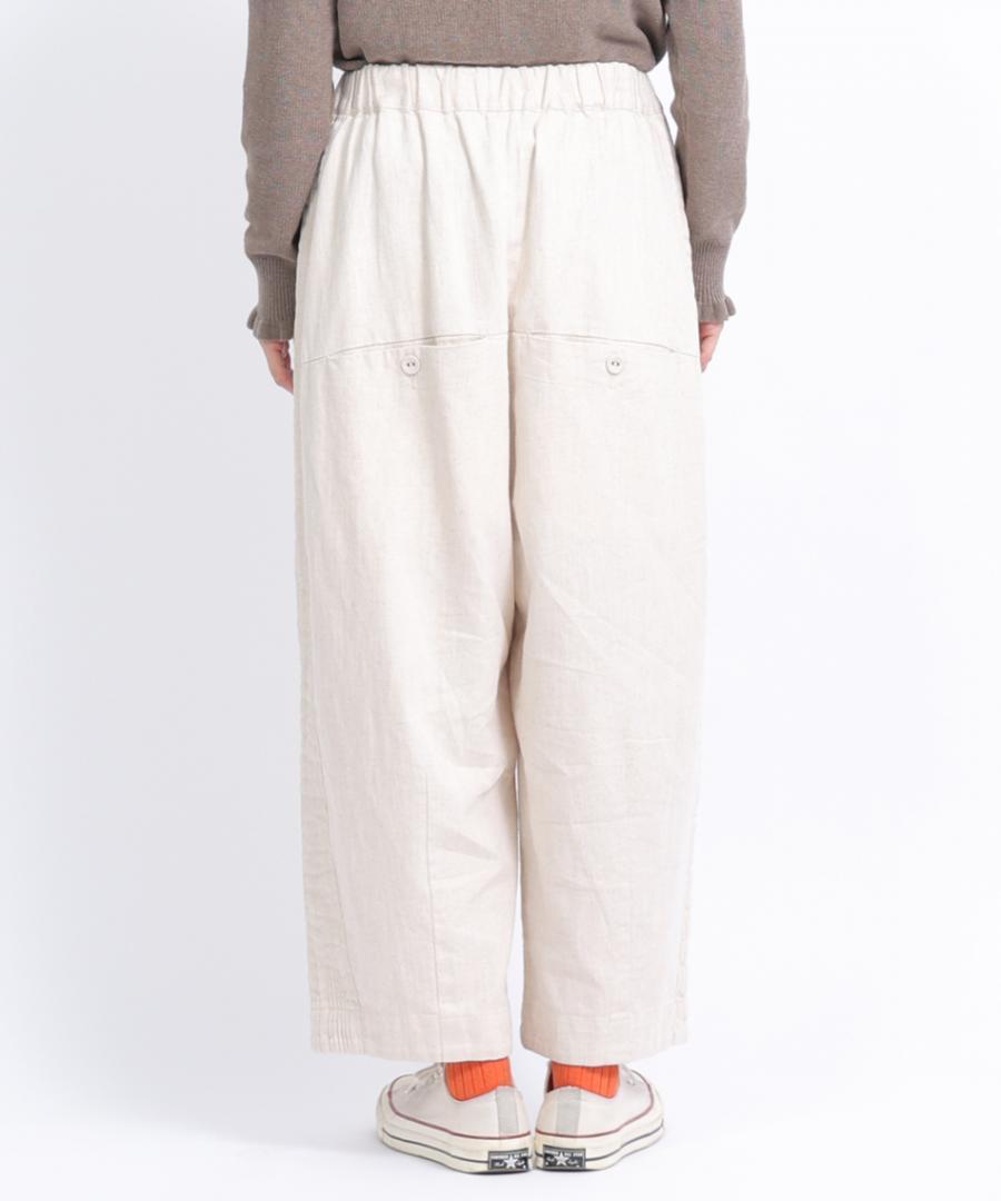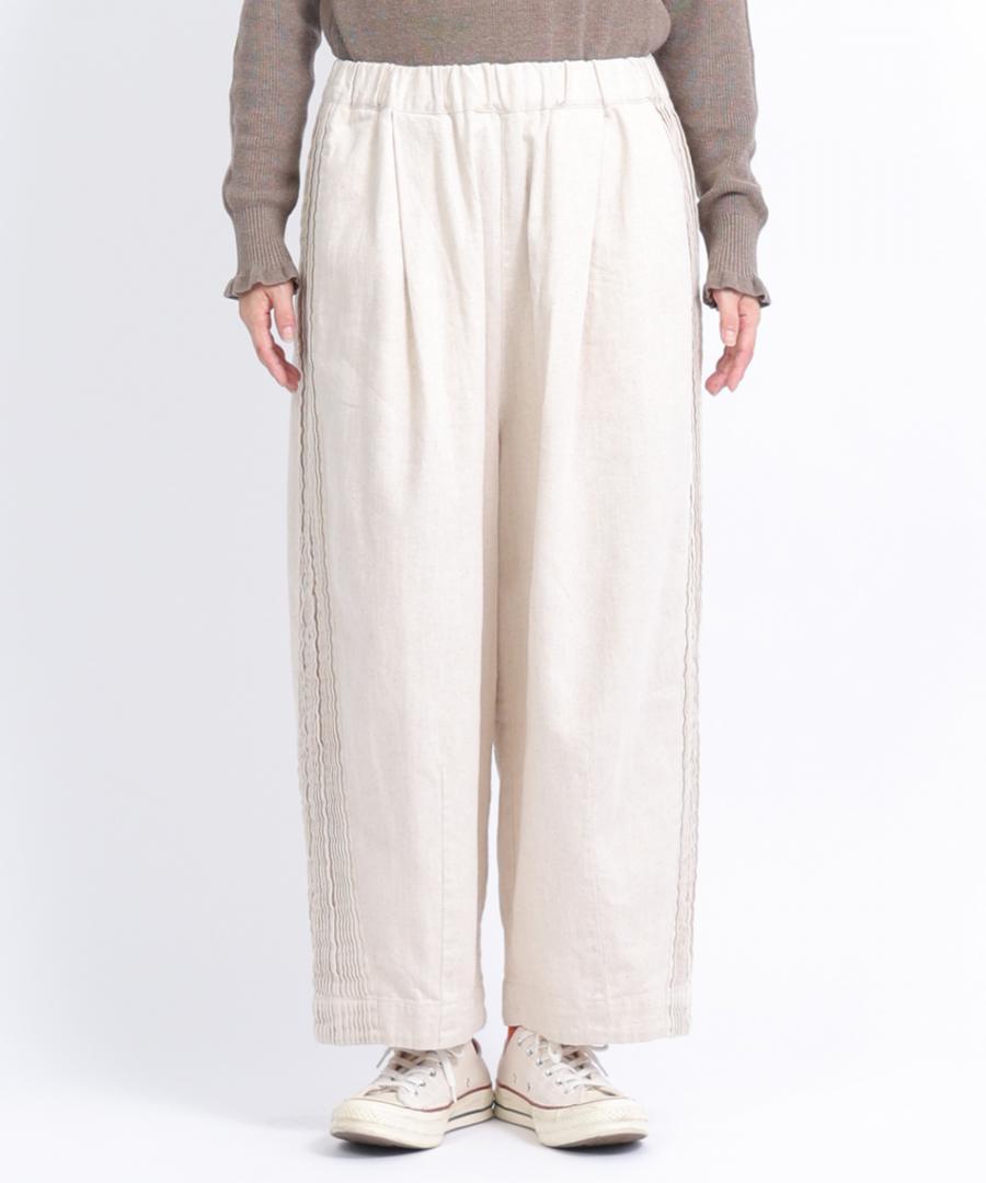 ウェストはゴム仕様、股上深めのゆったりとした穿き心地で、サイドに施されたピンタックがアクセントになっています。