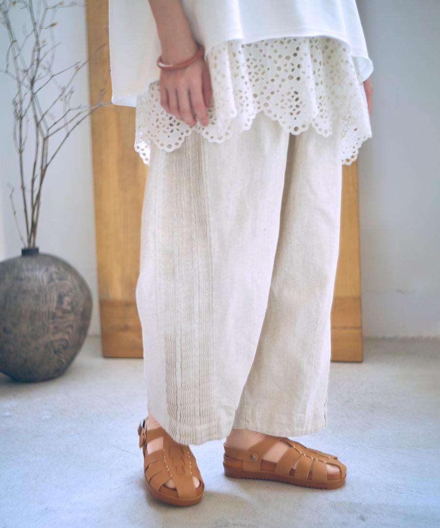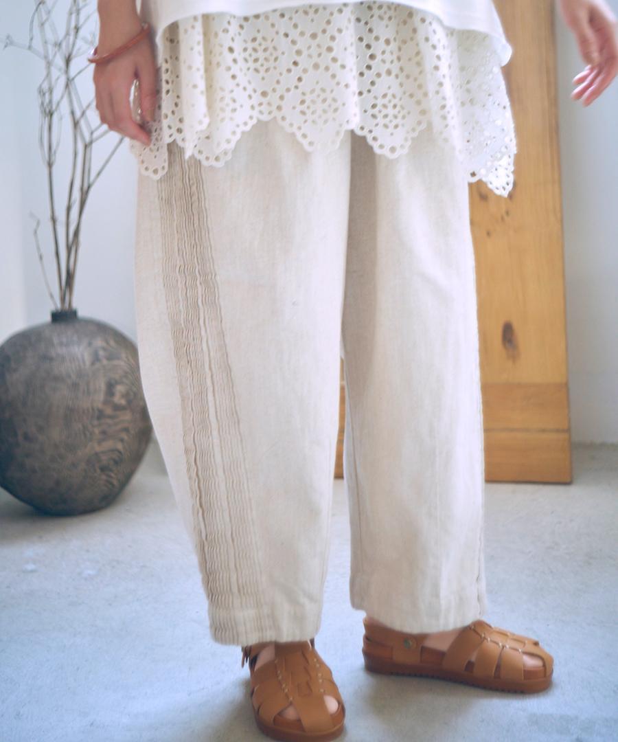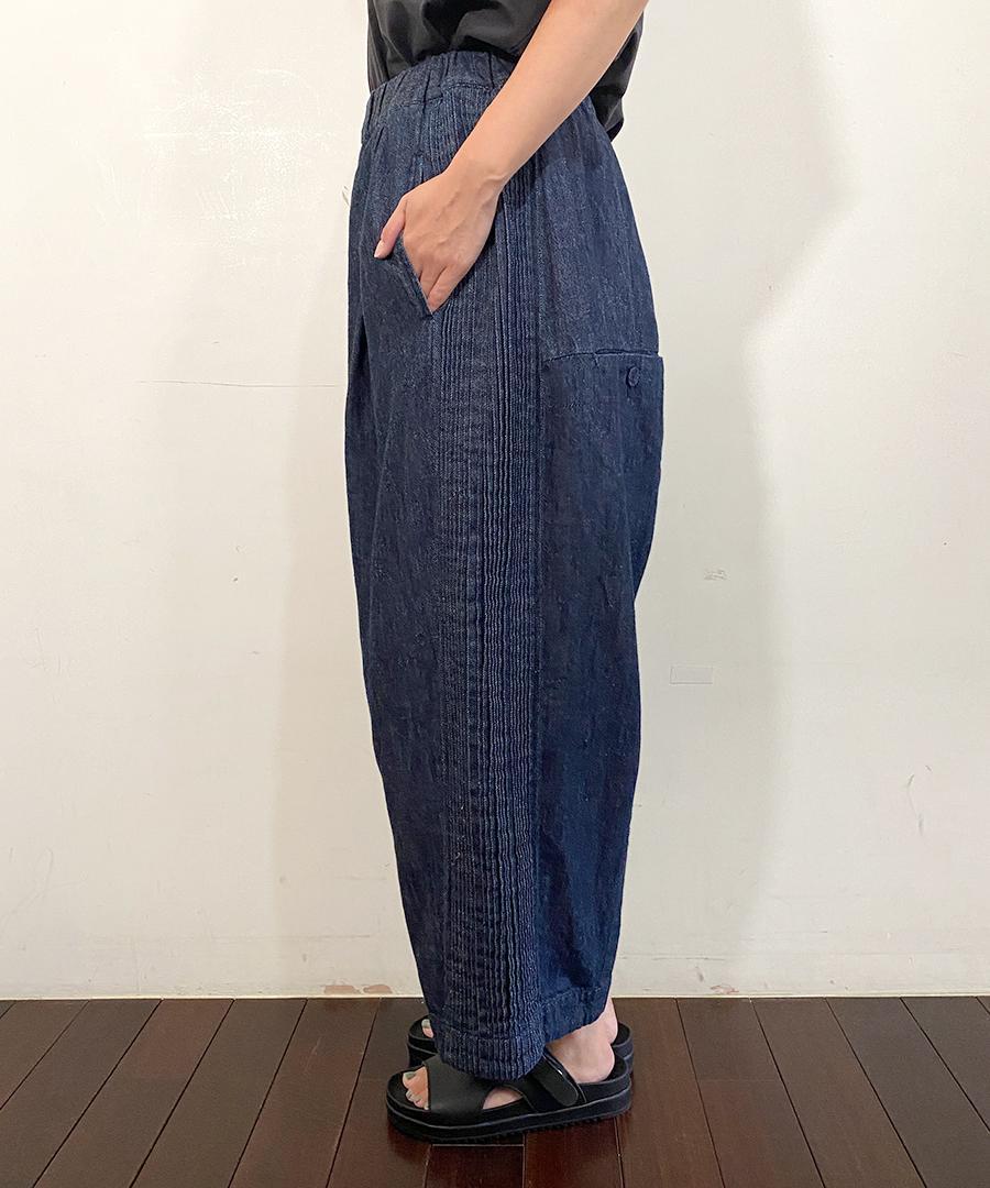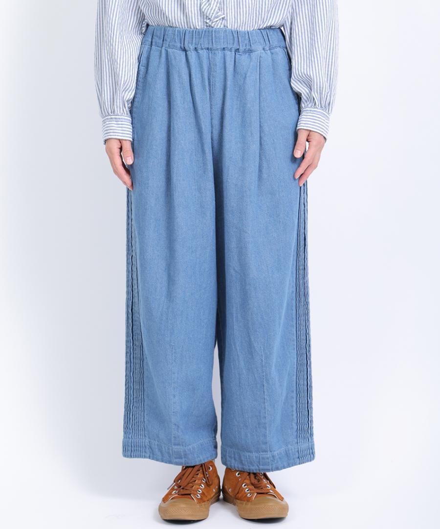 ウェストはゴム仕様、股上深めのゆったりとした穿き心地で、サイドに施されたピンタックがアクセントになっています。