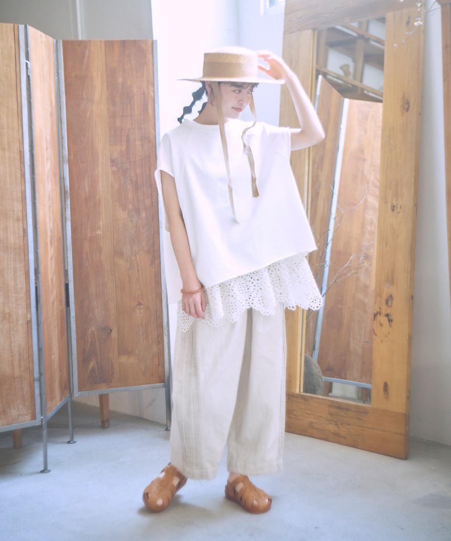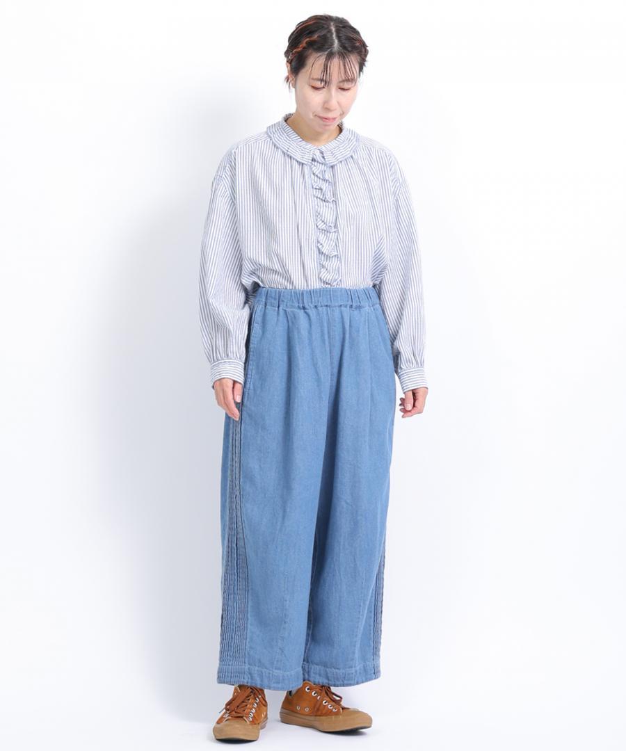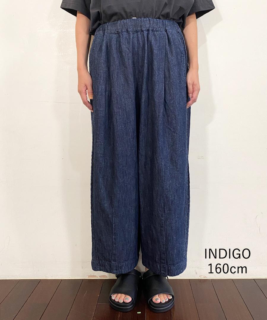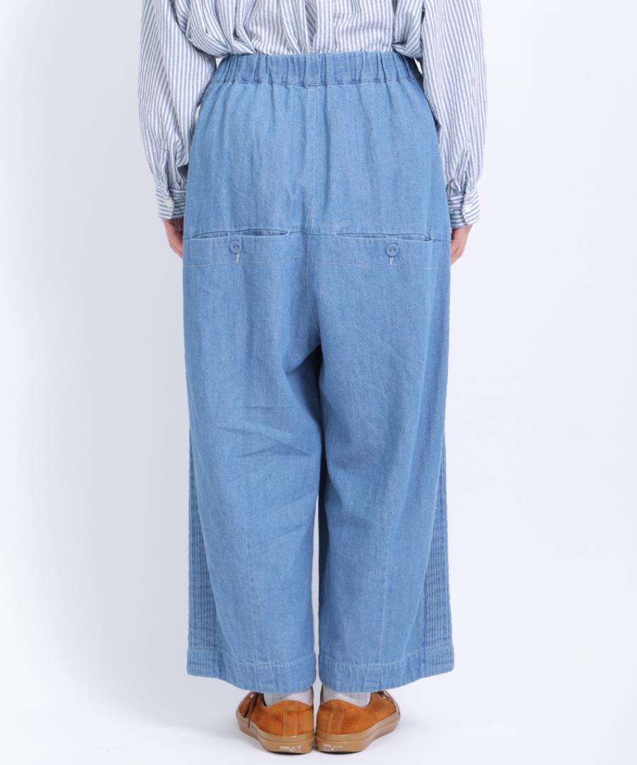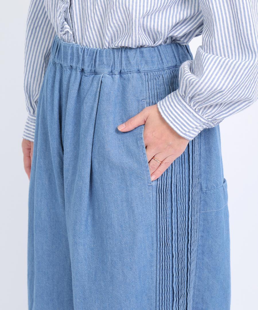 ウェストはゴム仕様、股上深めのゆったりとした穿き心地で、サイドに施されたピンタックがアクセントになっています。