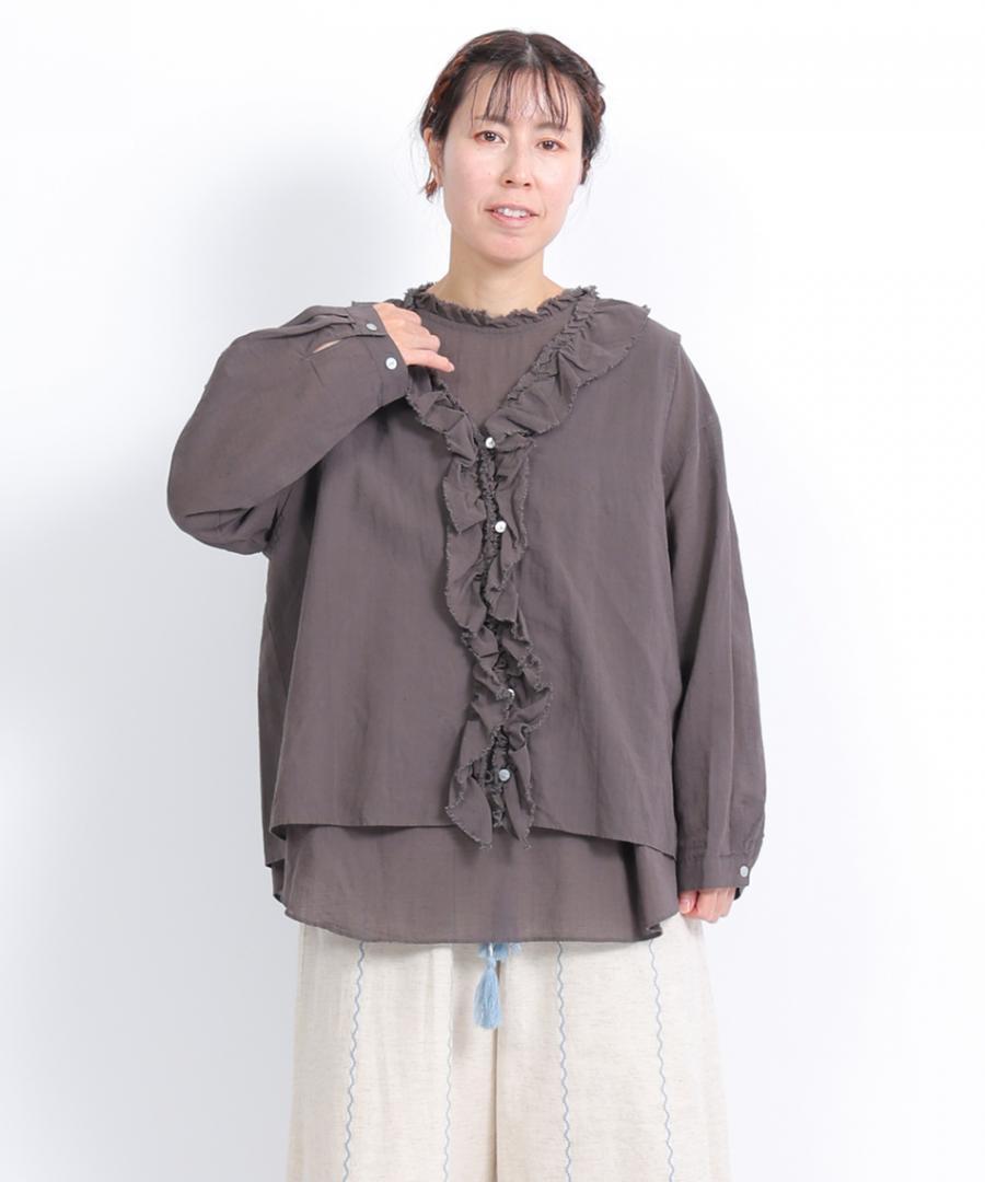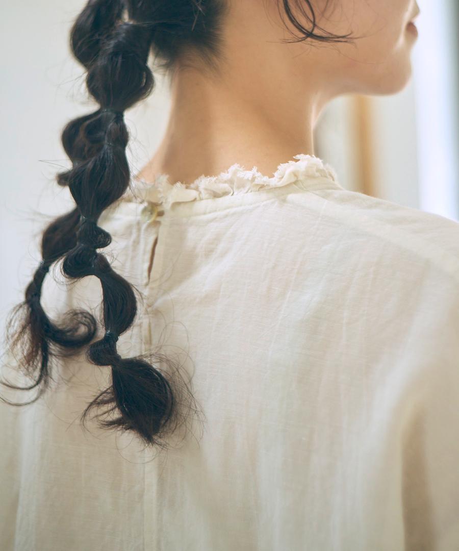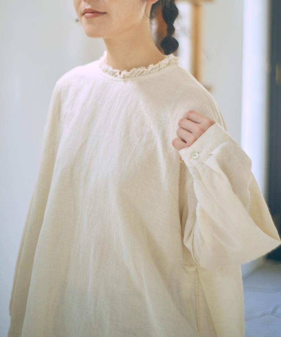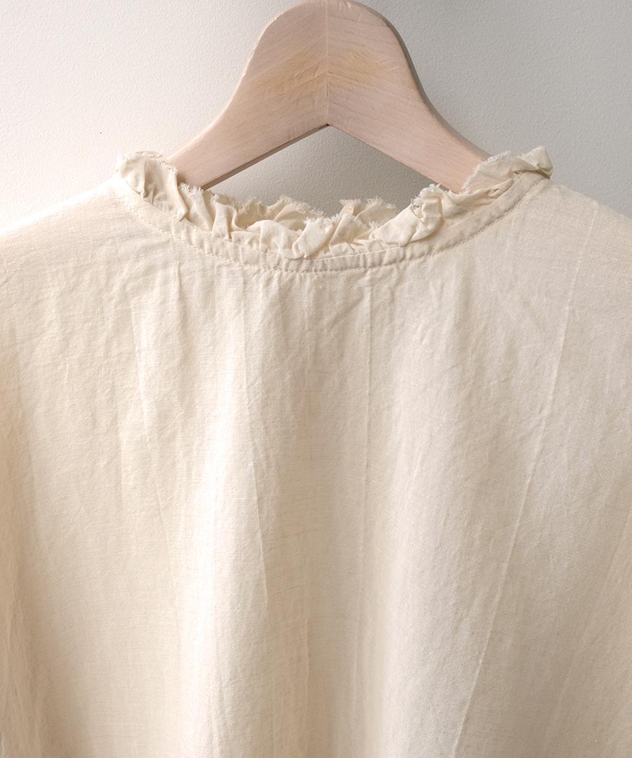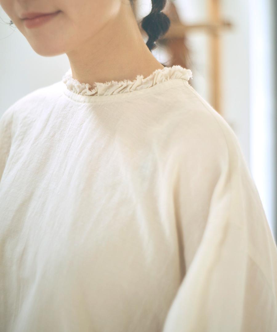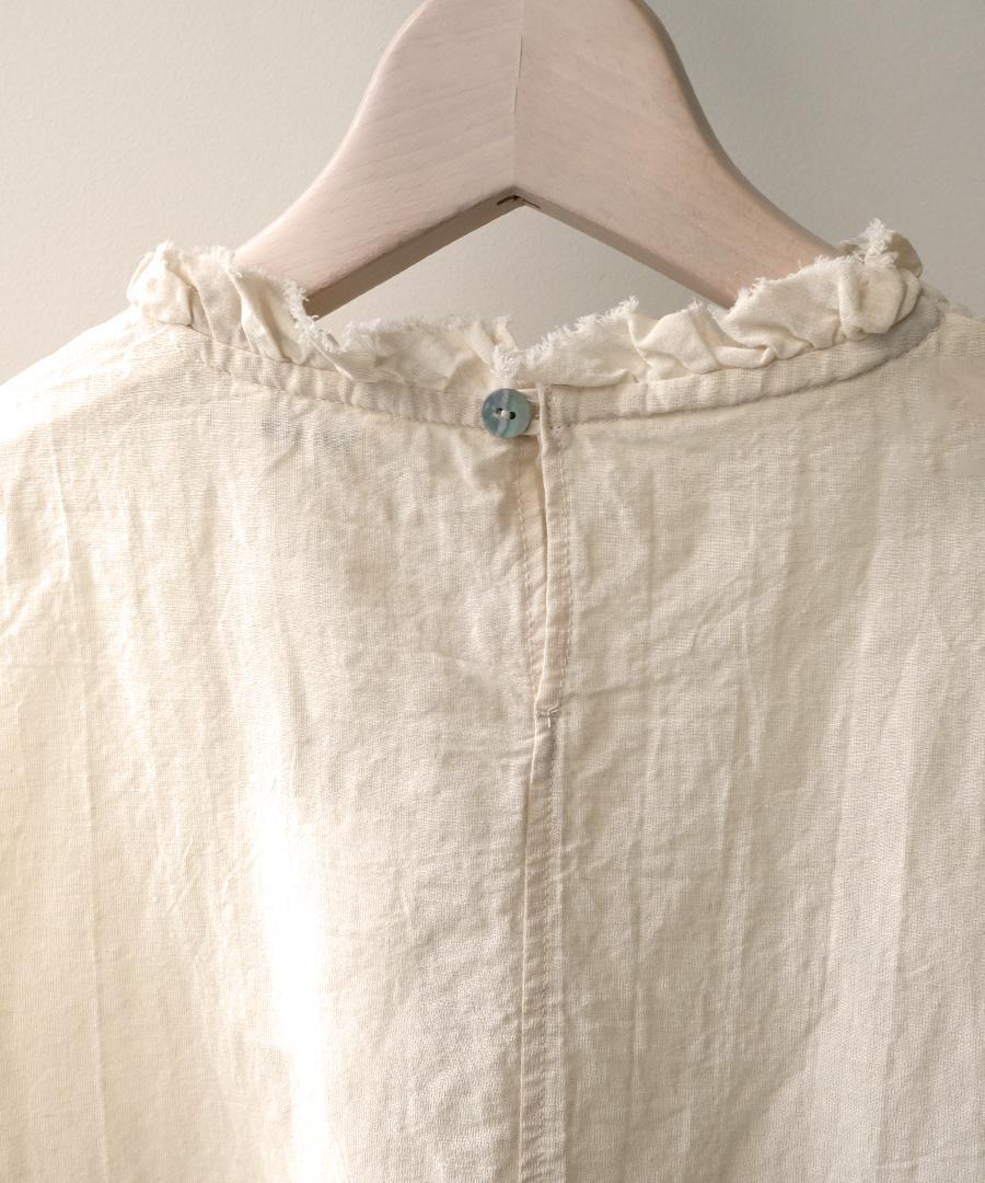 襟元にはフリルが施され、程よい甘さのあるデザイン。
