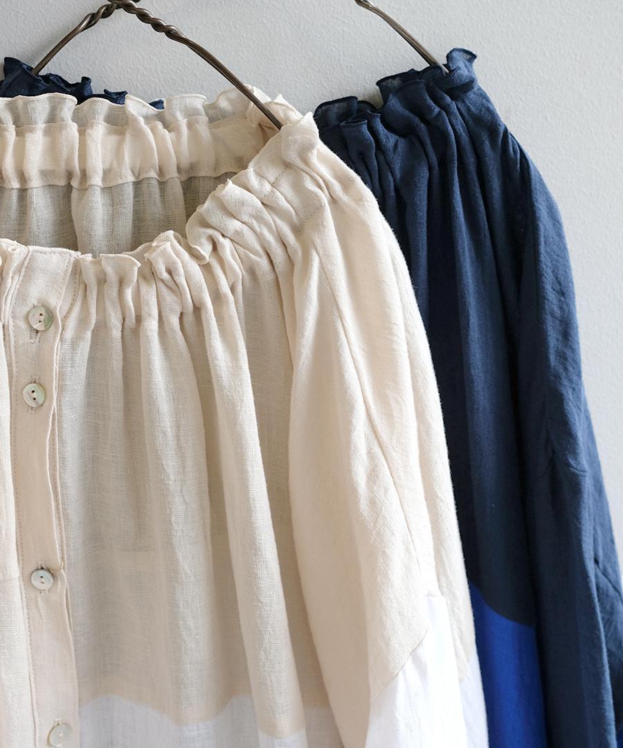 襟元はゴムシャーリング仕様で程よい甘さをプラス。