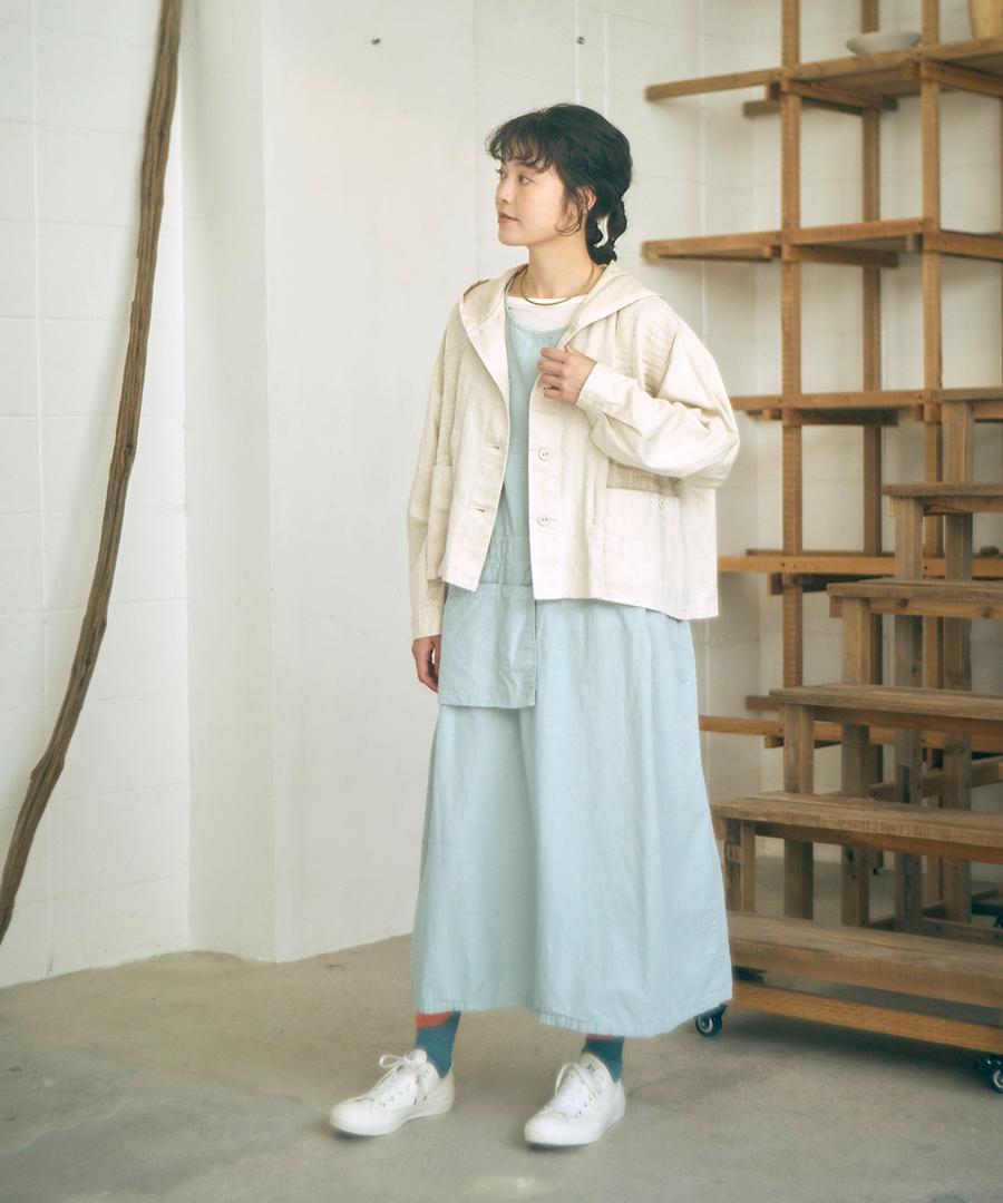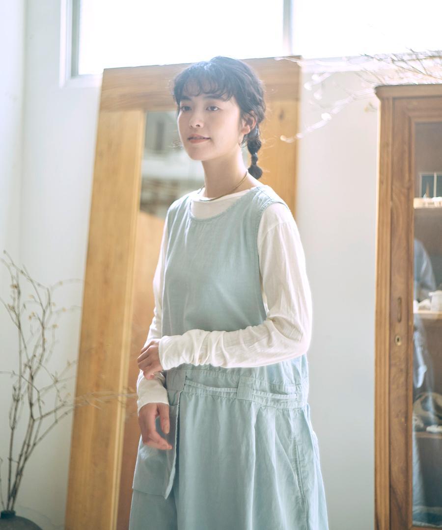 エプロンの様にバサッと重ねれば、tumugu:らしいコーデの完成です。