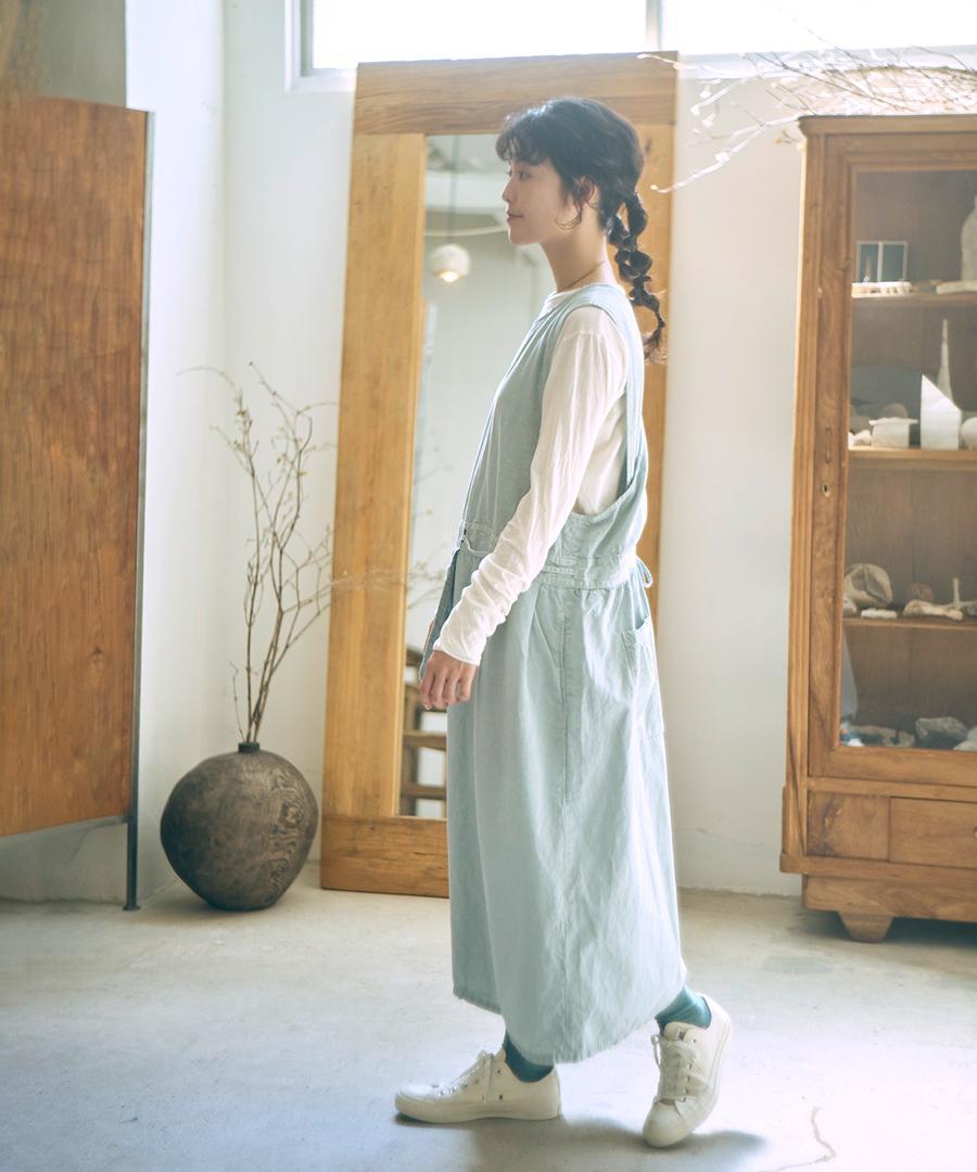 落ち感のあるテンセル素材にコットンリネンを加えた素材で仕立てたエプロンジャンパースカート。