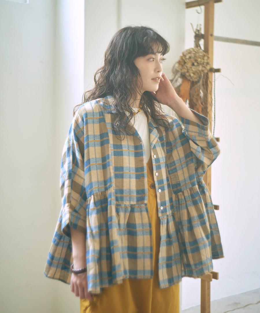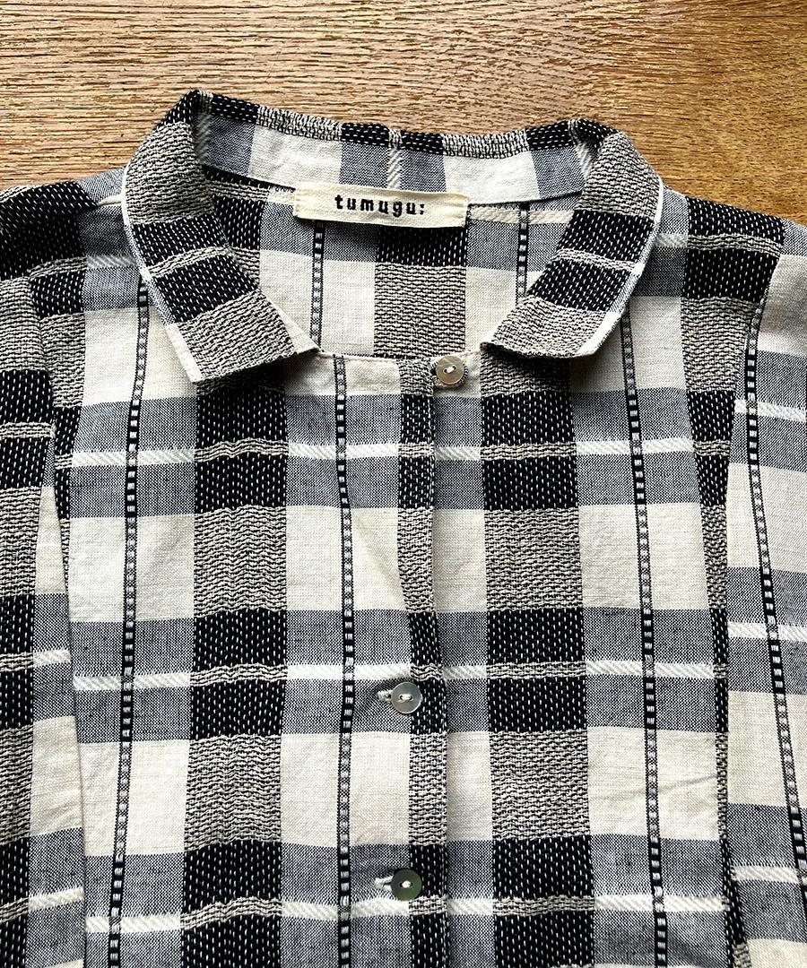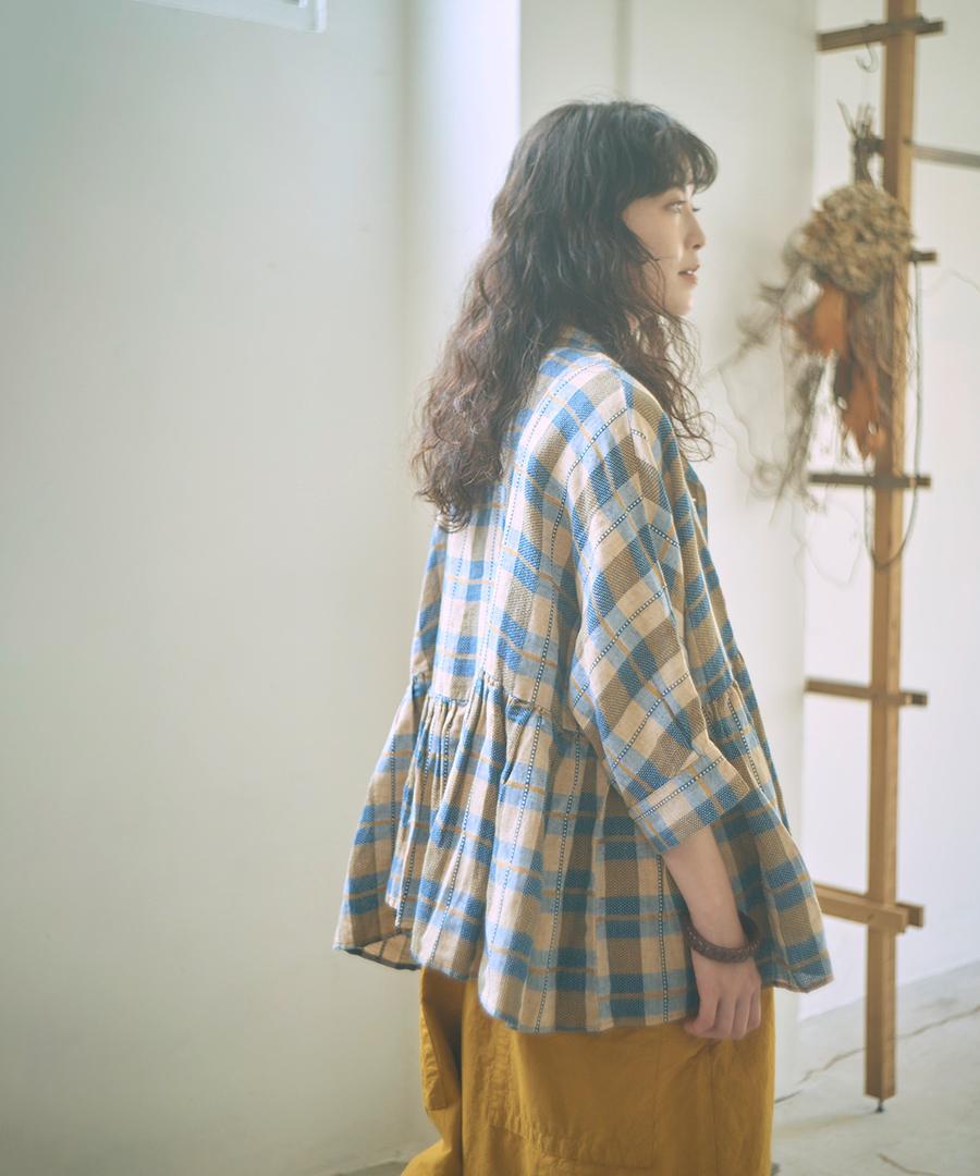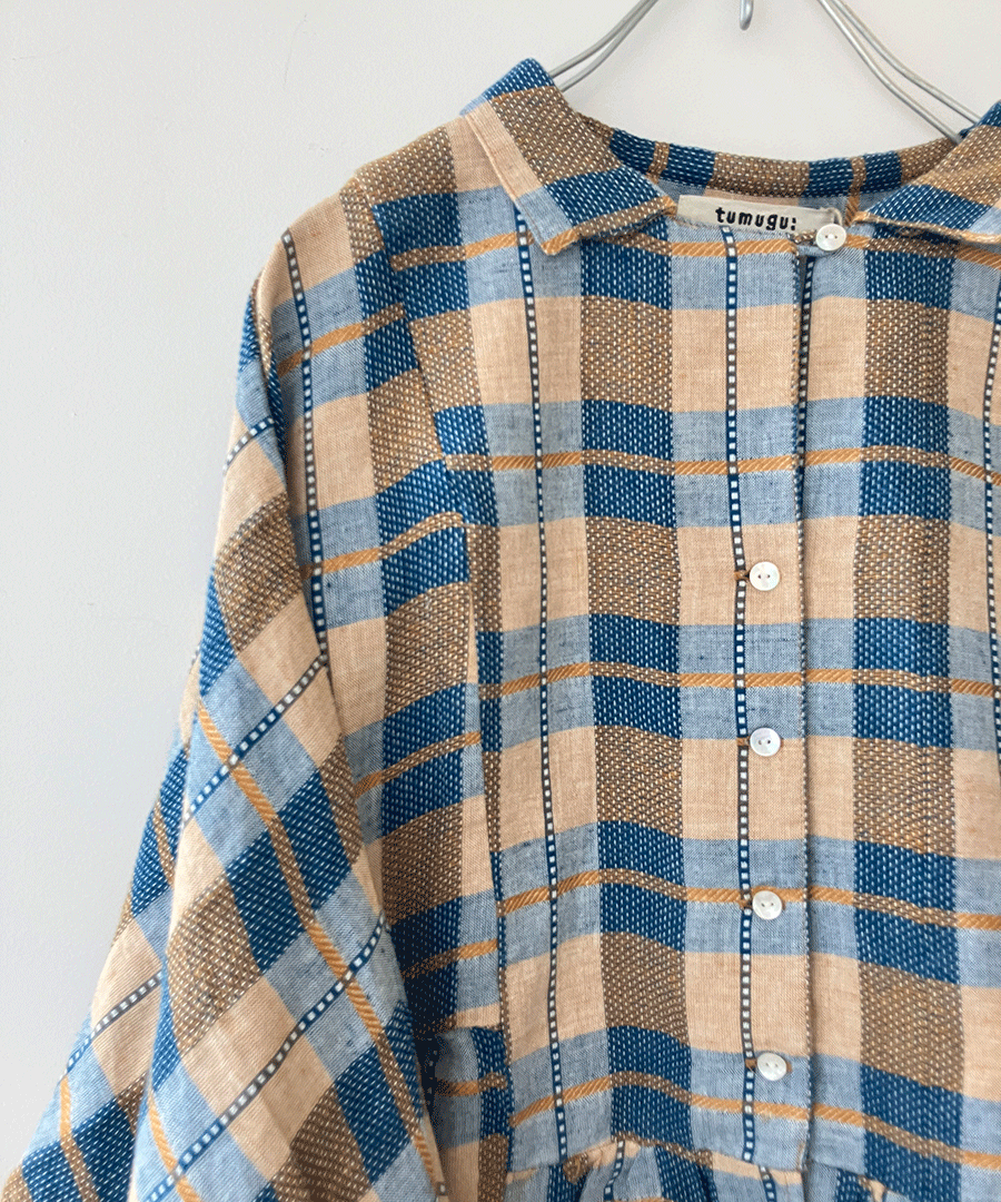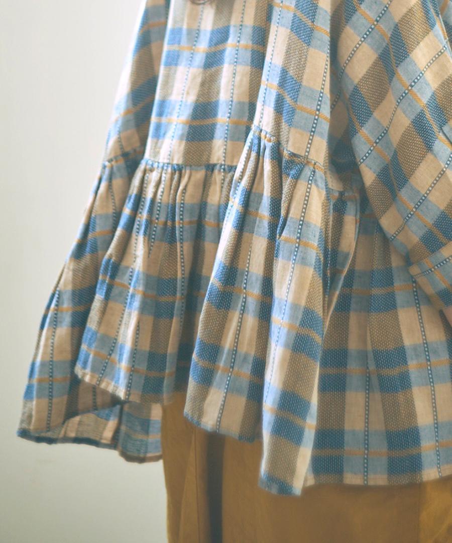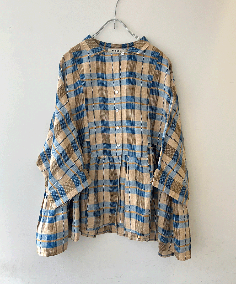 インドで丁寧に織り上げられた格子織りの生地を、糸の段階から染め上げる「先染め」で仕上げたチェック柄ブラウス。ツムグオリジナルデザインです。